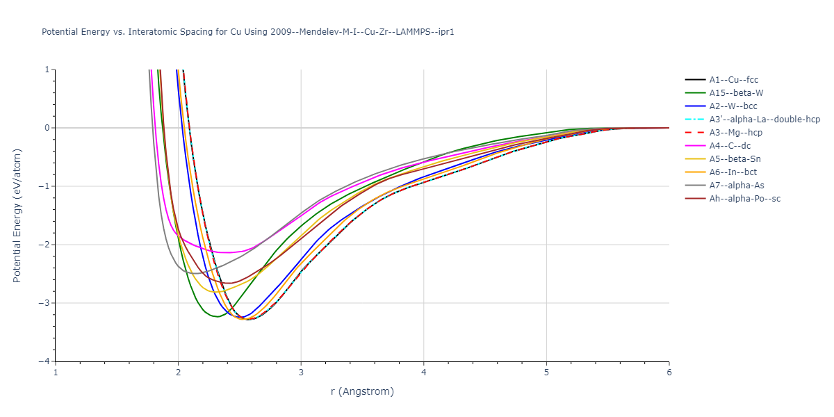 Plots of potential energy vs interatomic spacing, r, are shown below for a number of crystal structures. The structures are generated based on the ideal atomic positions and b/a and c/a lattice parameter ratios for a given crystal prototype. The size of the system is then uniformly scaled, and the energy calculated without relaxing the system. To obtain these plots, values of r are evaluated every 0.02 Å up to 6 Å.