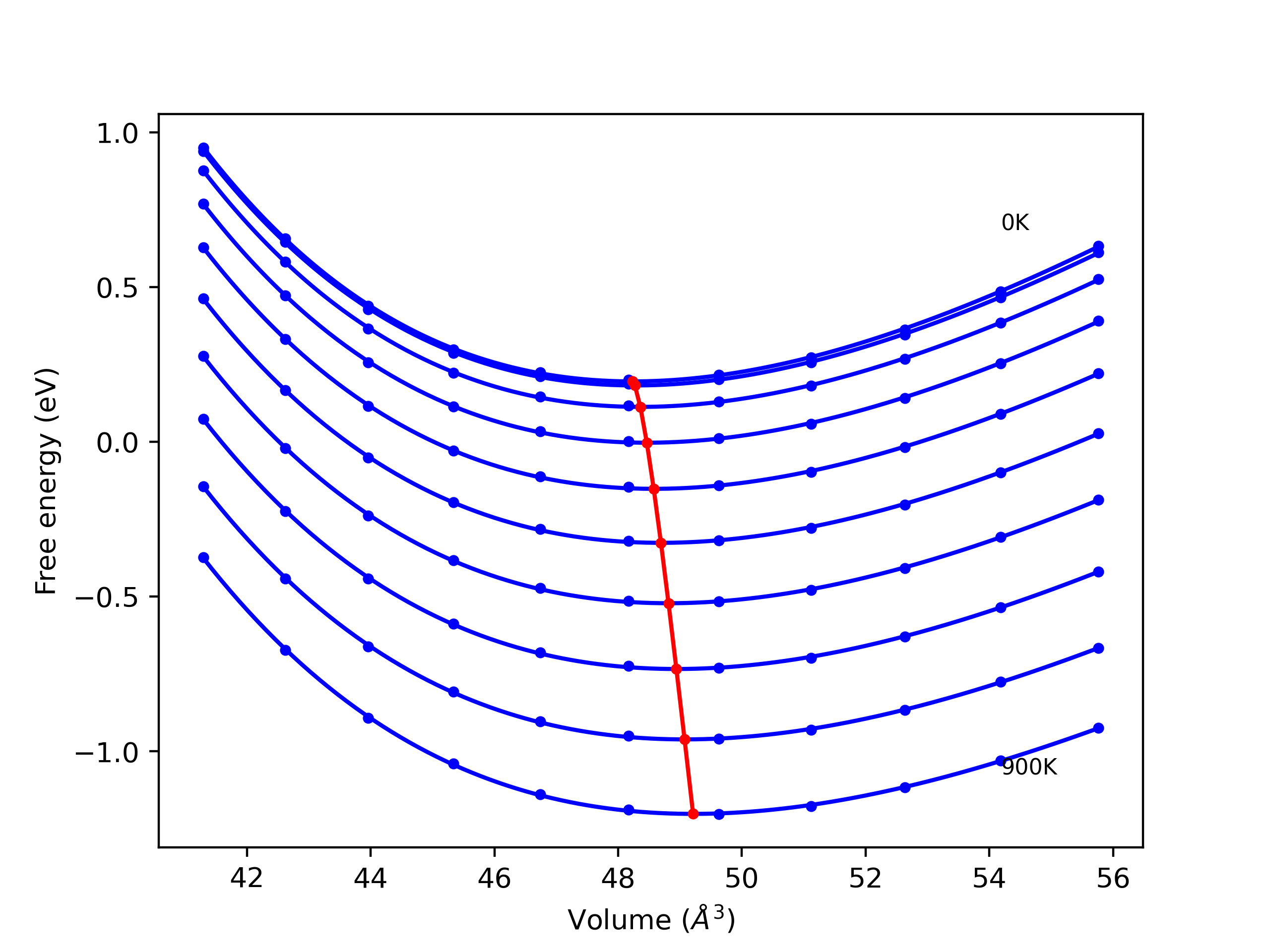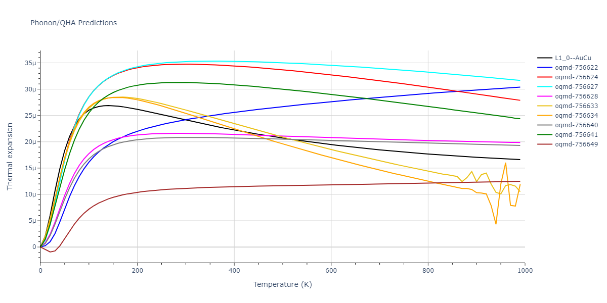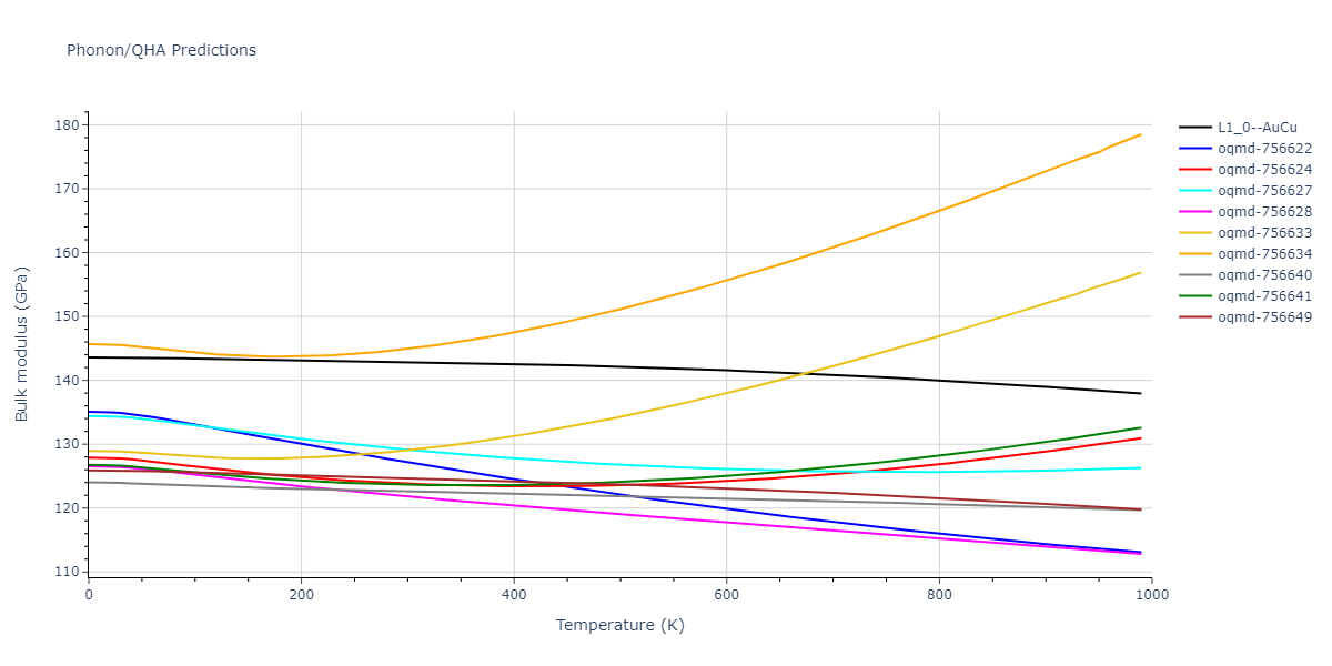 Plots of lattice and elastic constants are shown as a function of temperature. The 0K points were taken from the Crystal Structure Predictions and the Elastic Constants Predictions sections above for the unique crystal structures relaxed with the "dynamic" method. Starting from the 0 K relaxed crystal unit cells, supercell systems are created by replicating all three dimensions by the same multiplier to achieve at least 4000 atoms. The systems are then relaxed at 50 K and zero pressure using 1 million NPT steps. Lattice constants are estimated by averaging the measured box dimensions. Temperatures are iteratively increased by 50 K, with each subsequent relaxation calculation starting from the final atomic configuration at the previous temperature and relaxing for another 1 million steps.
