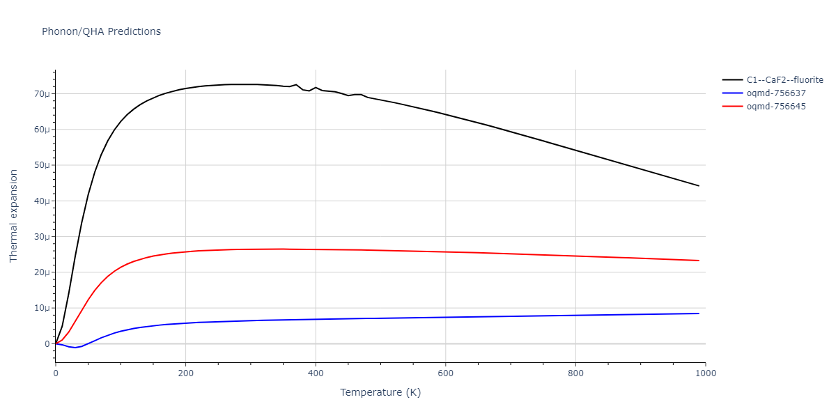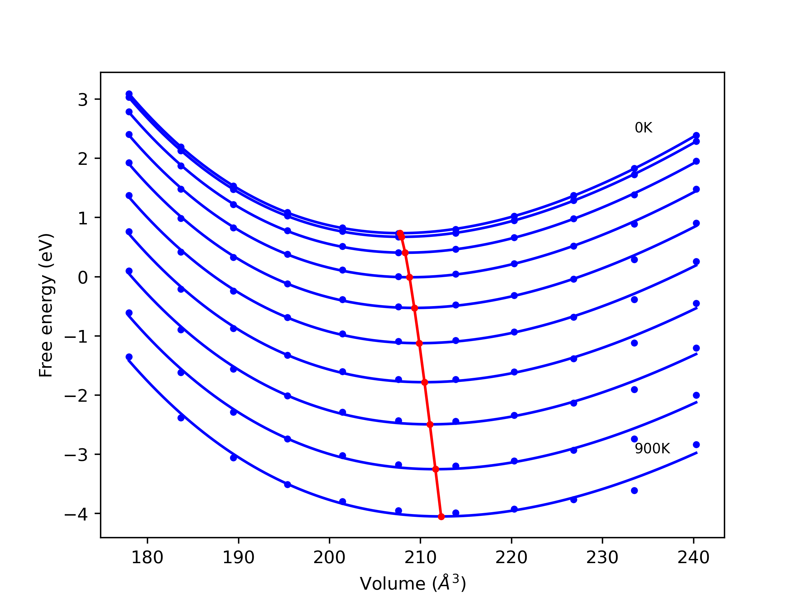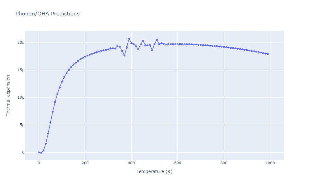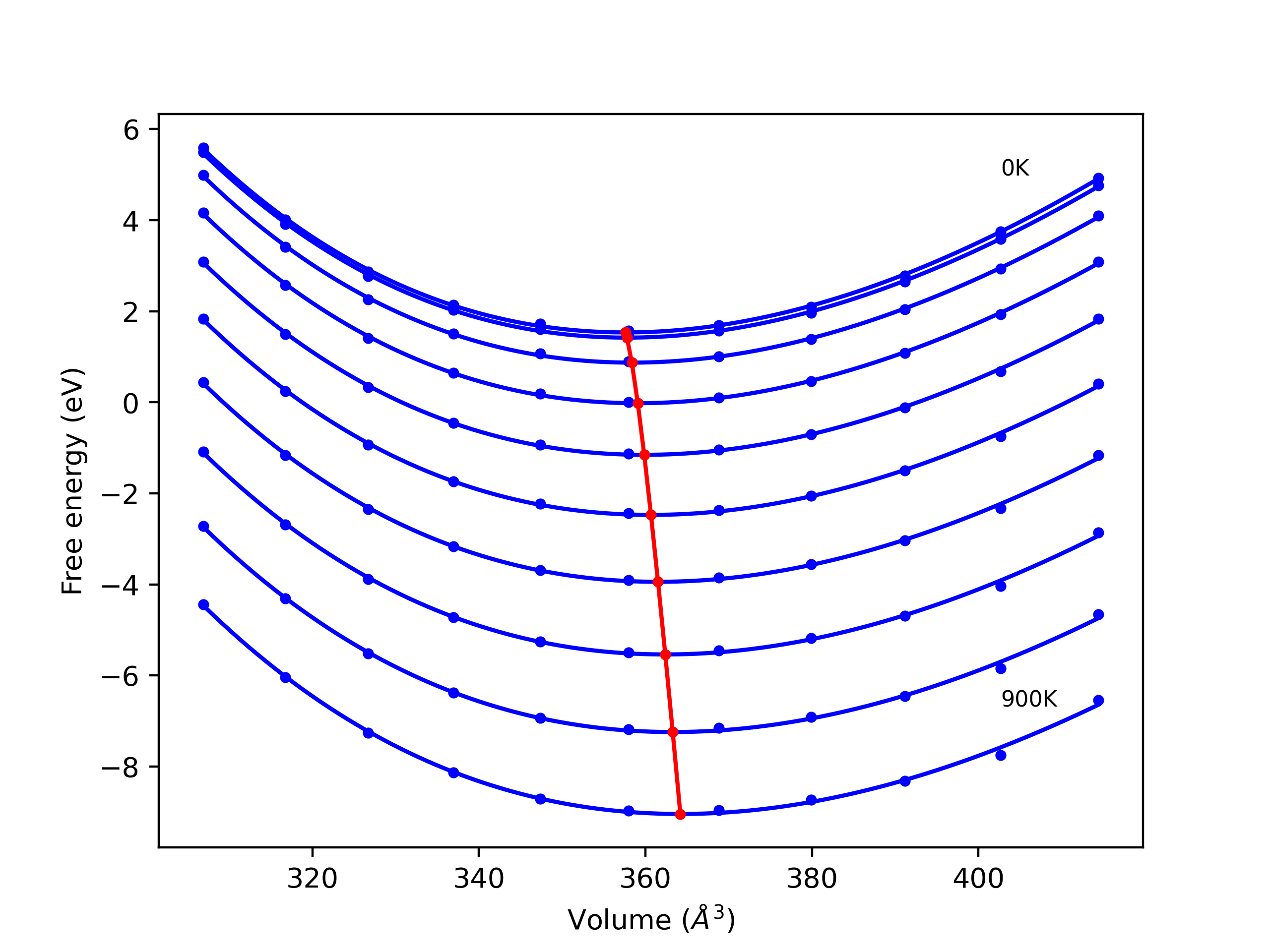 Plots of lattice and elastic constants are shown as a function of temperature. The 0K points were taken from the Crystal Structure Predictions and the Elastic Constants Predictions sections above for the unique crystal structures relaxed with the "dynamic" method. Starting from the 0 K relaxed crystal unit cells, supercell systems are created by replicating all three dimensions by the same multiplier to achieve at least 4000 atoms. The systems are then relaxed at 50 K and zero pressure using 1 million NPT steps. Lattice constants are estimated by averaging the measured box dimensions. Temperatures are iteratively increased by 50 K, with each subsequent relaxation calculation starting from the final atomic configuration at the previous temperature and relaxing for another 1 million steps.