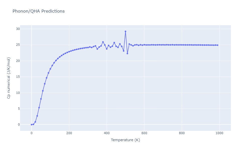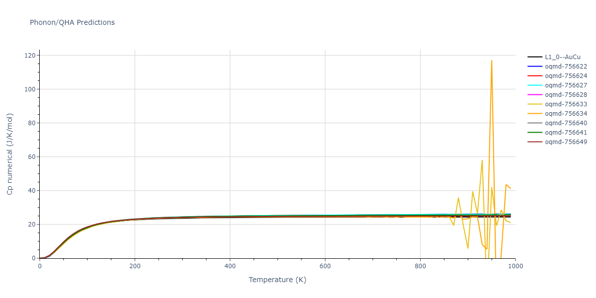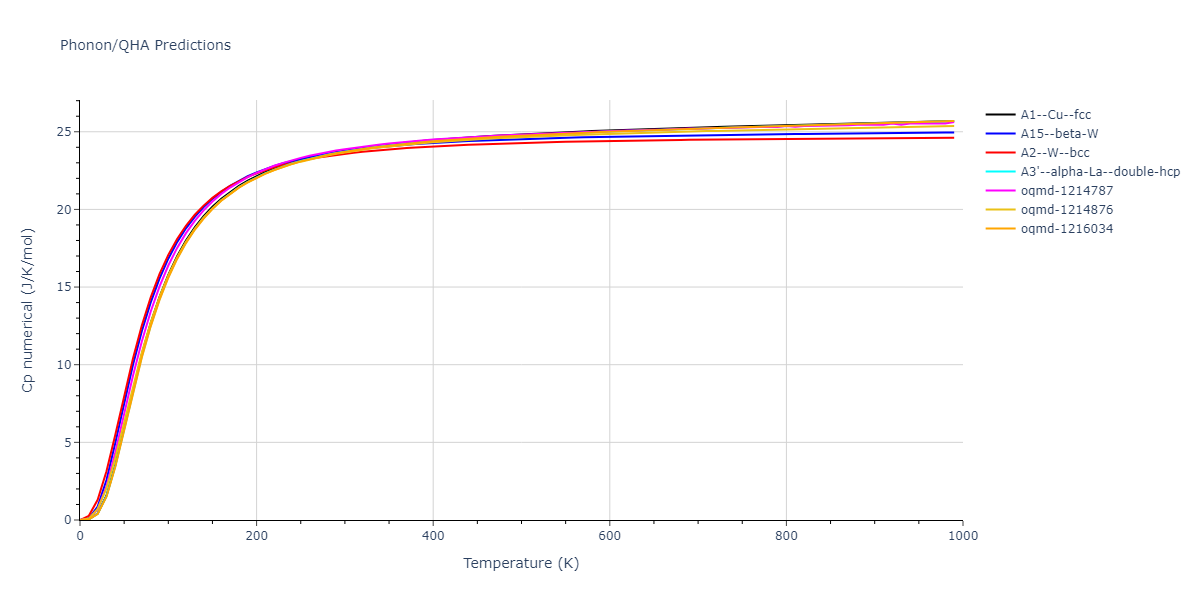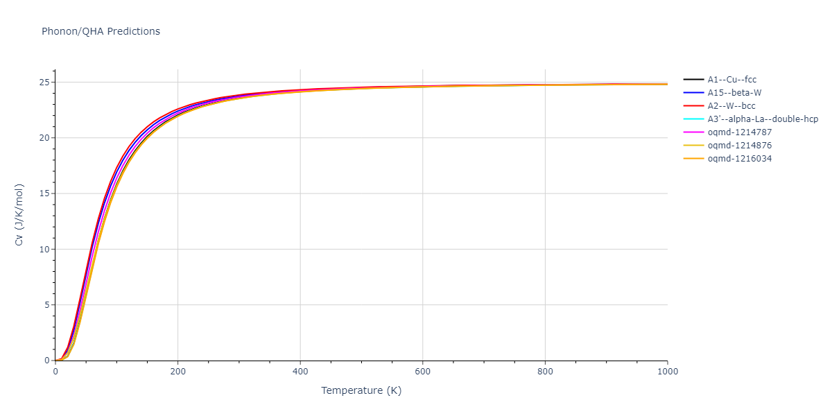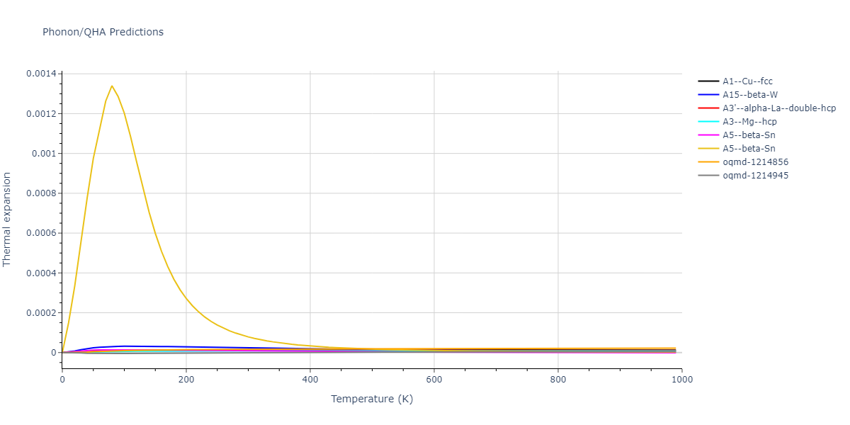 Plots of internal energy, Gibbs free energy, entropy, heat capacity and volume are shown here as a function of temperature for various crystal structures and liquid phases. The included crystal structures correspond to those in the Solid Structures vs. Temperature section, and the liquid phases to those in the Liquid Properties section. Internal energy and volume are taken from the associated structure relaxations mentioned in those previous sections. Constant pressure heat capacity is estimated using 3-point numerical derivatives of enthalpy versus temperature. Note that since all simulations done here are at 0 pressure, internal energy and enthalpy are equivalent.