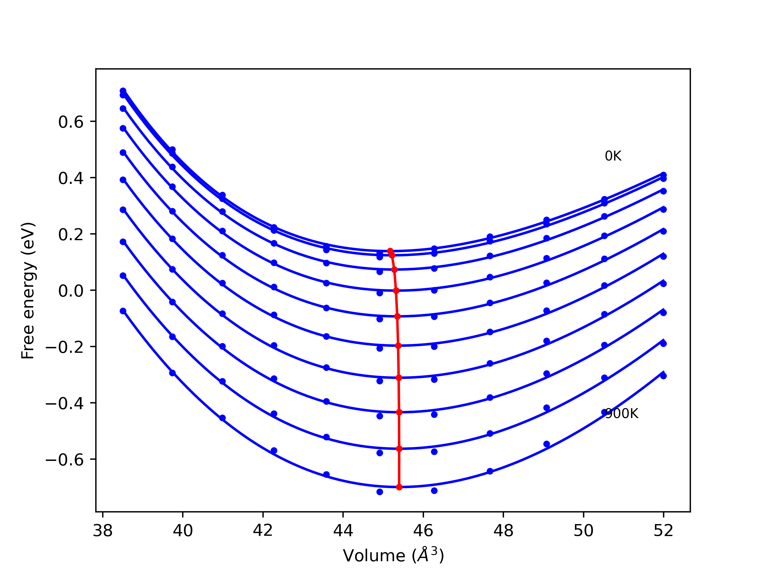 The Gibbs energies of the phases are estimated using thermodynamic integration between the interatomic potential in question and a simpler model with known Gibbs free energy values. For solids, the reference model is an Einstein solid, while for liquids it is the Uhlenbeck-Ford potential. Besides a short run at the start of the solid calculations to estimate Einstein model spring constants, the two calculations proceed similarly. Starting with the final relaxation configurations, the systems are stabilized for 25,000 steps. Then, over the next 50,000 steps the potential is swapped out for the reference potential. The system is then stabilized for another 25,000 steps with the reference model before a reverse swap of 50,000 steps is performed. The simulation ends with one final 25,000 step stabilization period. From the simulation, the irreversible work of transformation is estimated and used to compute the absolute Gibbs free energy of the target phase and potential relative to the reference potential. Entropy is estimated as the difference in enthalpy and Gibbs free energy and divided by temperature.