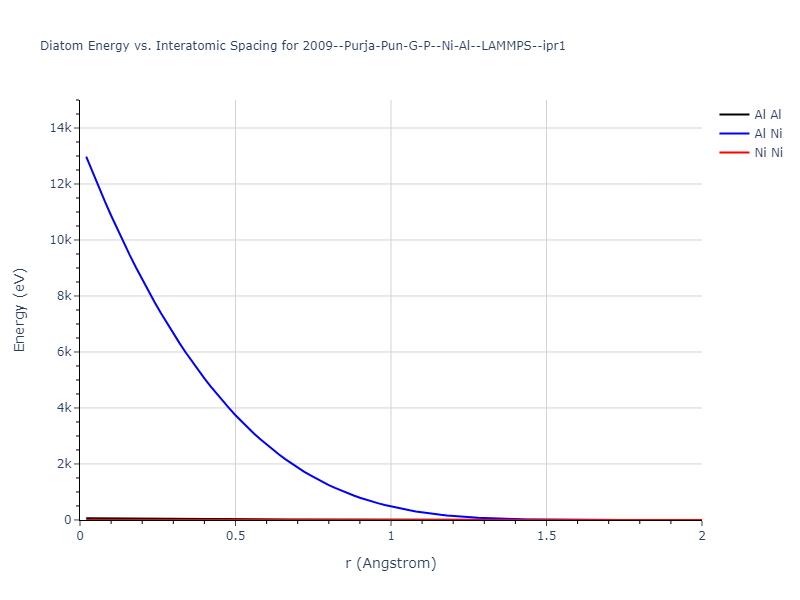Plots of the potential energy vs interatomic spacing, r, are shown below for all diatom sets associated with the interatomic potential. This calculation provides insights into the functional form of the potential's two-body interactions. A system consisting of only two atoms is created, and the potential energy is evaluated for the atoms separated by 0.02 Å <= r <= 6.0> Å in intervals of 0.02 Å. Two plots are shown: one for the "standard" interaction distance range, and one for small values of r. The small r plot is useful for determining whether the potential is suitable for radiation studies.