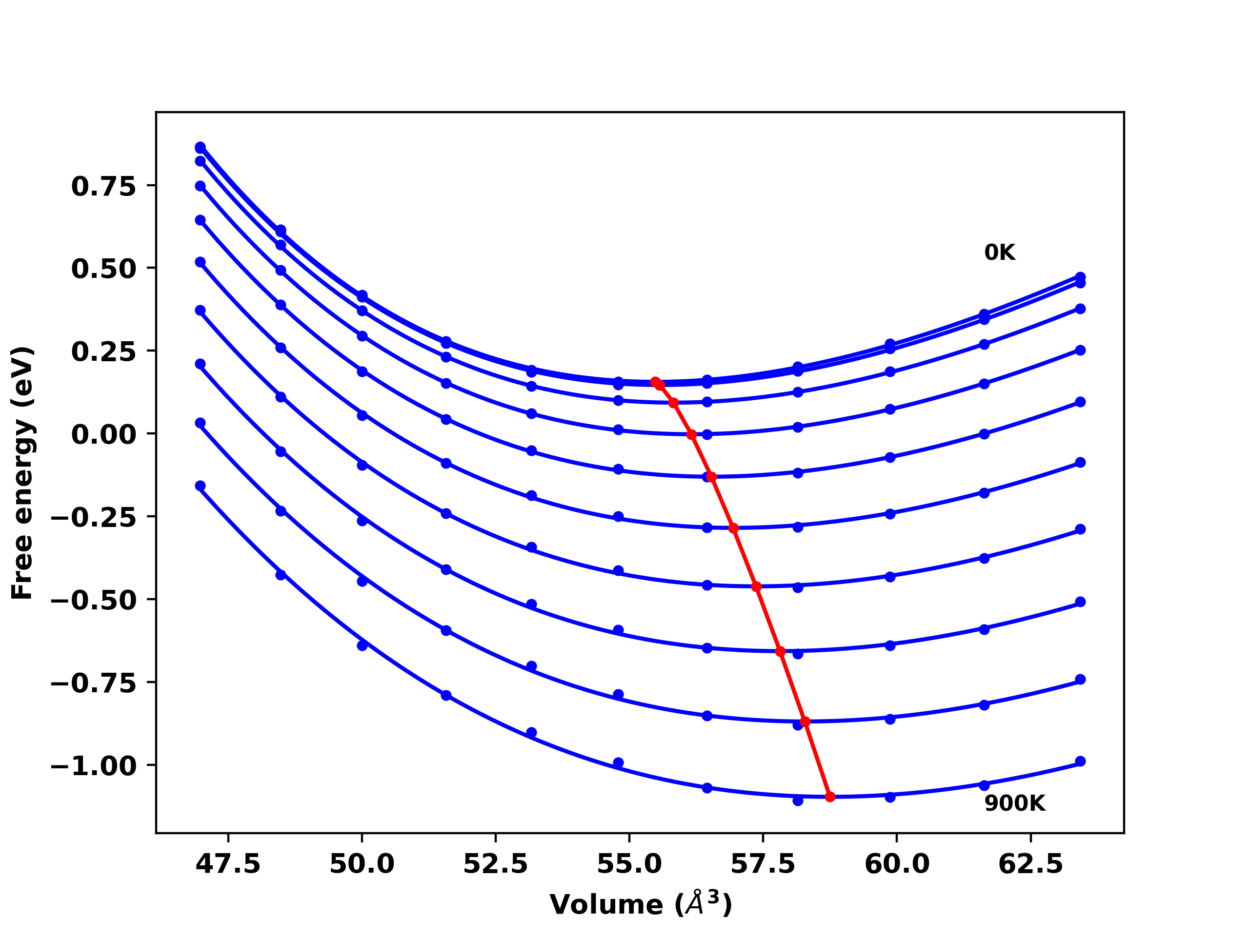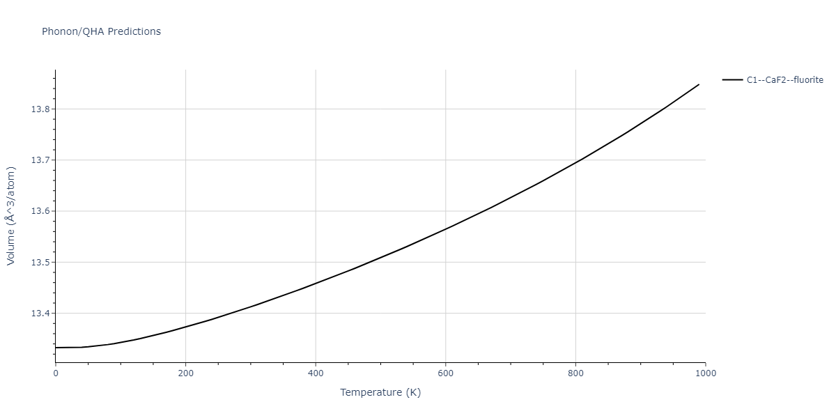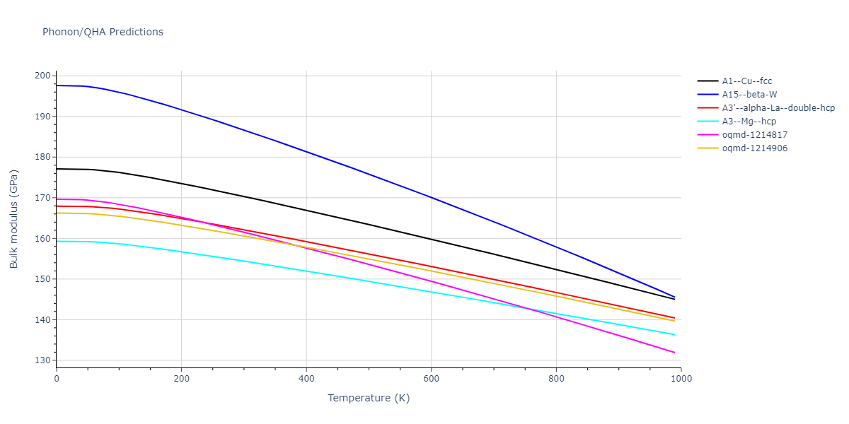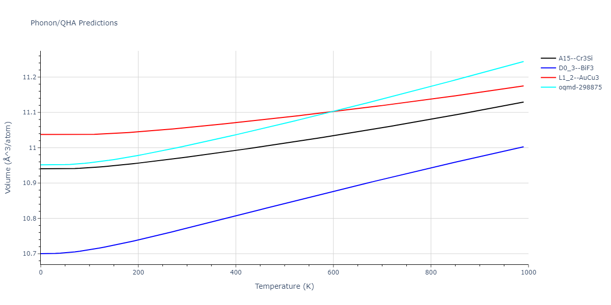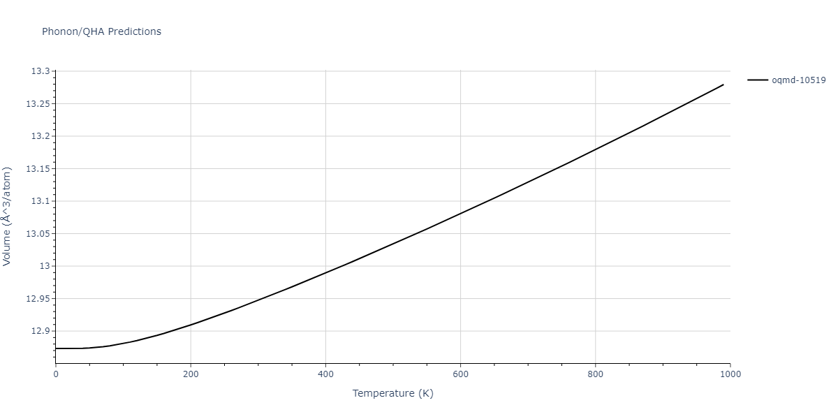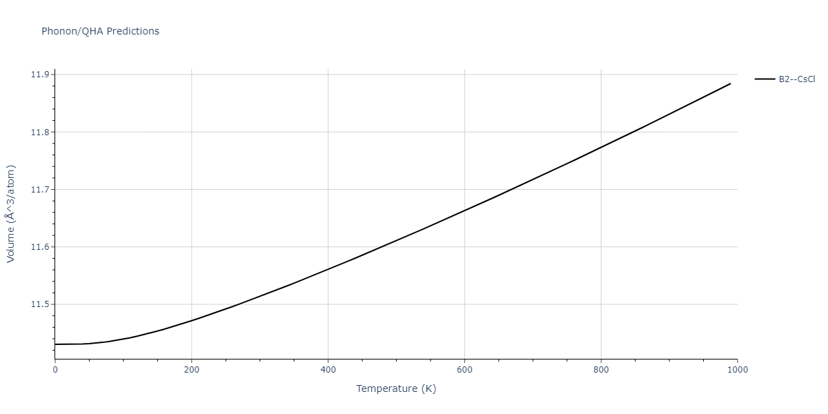 Phonon band structures and crystal properties estimated from quasi-harmonic approximation (QHA) calculations are displayed for select crystals. The calculations were performed using phonopy and LAMMPS. For the phonon calculations, 3x3 supercells of the potential-specific relaxed crystals were used. The QHA calculations were based on 11 strain states ranging from -0.05 to 0.05.