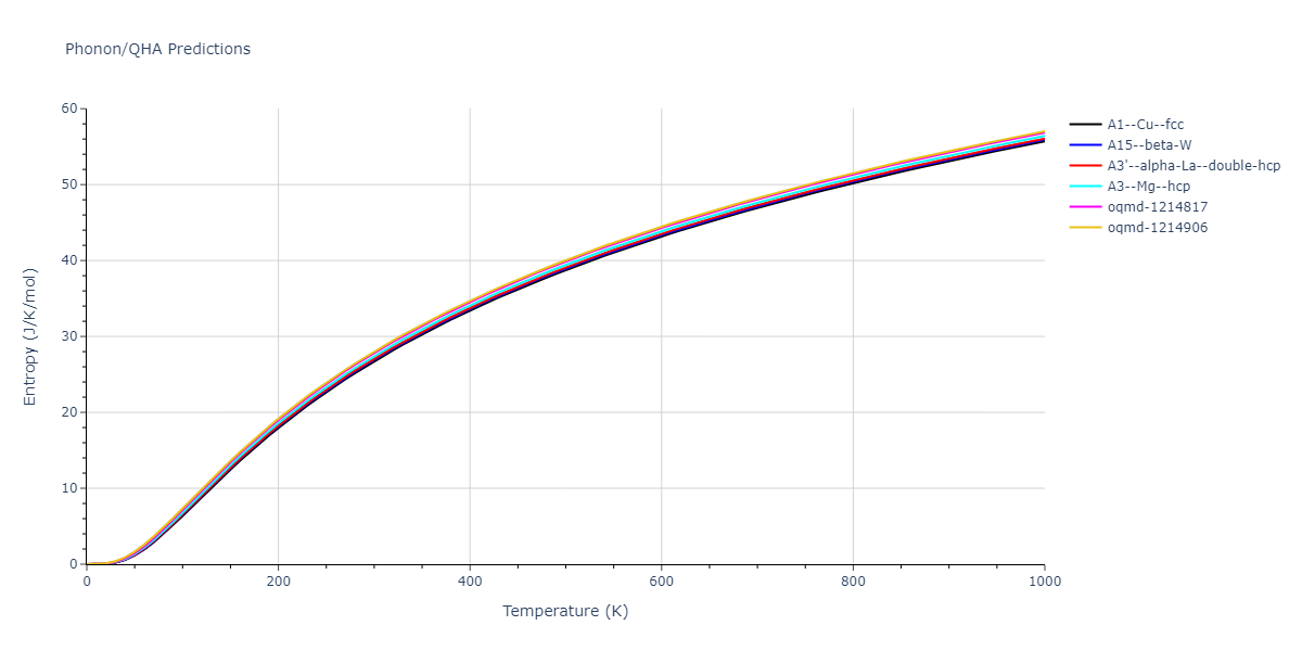 The Gibbs energies of the phases are estimated using thermodynamic integration between the interatomic potential in question and a simpler model with known Gibbs free energy values. For solids, the reference model is an Einstein solid, while for liquids it is the Uhlenbeck-Ford potential. Besides a short run at the start of the solid calculations to estimate Einstein model spring constants, the two calculations proceed similarly. Starting with the final relaxation configurations, the systems are stabilized for 25,000 steps. Then, over the next 50,000 steps the potential is swapped out for the reference potential. The system is then stabilized for another 25,000 steps with the reference model before a reverse swap of 50,000 steps is performed. The simulation ends with one final 25,000 step stabilization period. From the simulation, the irreversible work of transformation is estimated and used to compute the absolute Gibbs free energy of the target phase and potential relative to the reference potential. Entropy is estimated as the difference in enthalpy and Gibbs free energy and divided by temperature.