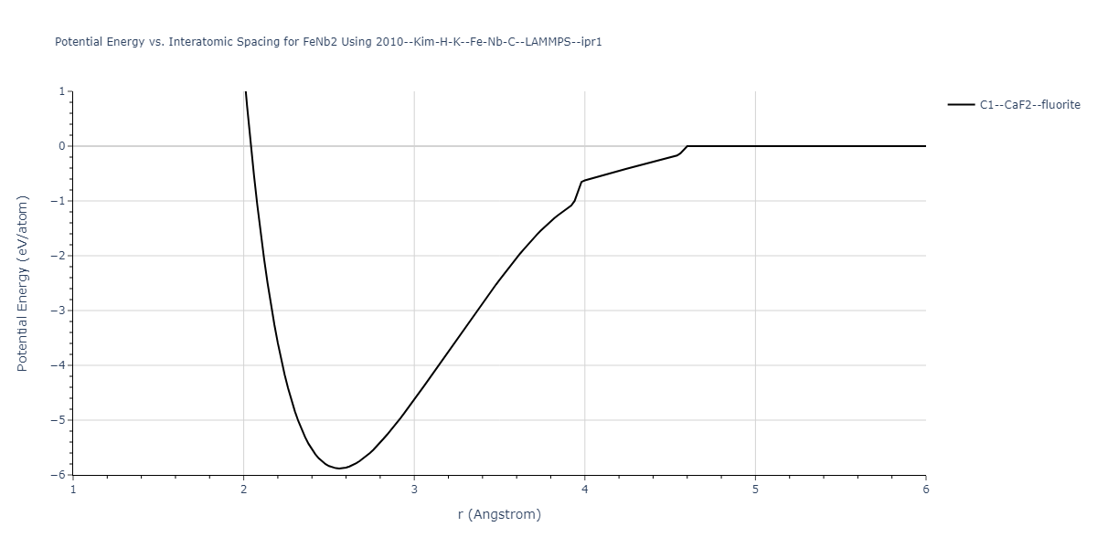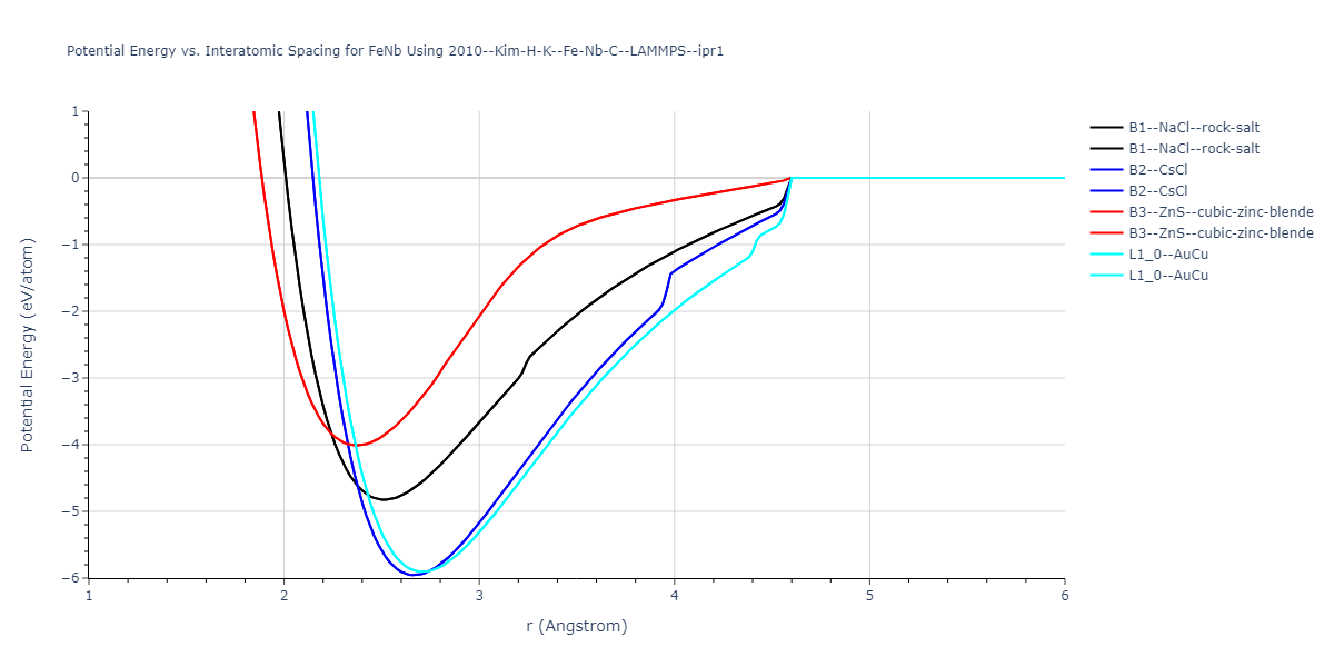 Plots of potential energy vs interatomic spacing, r, are shown below for a number of crystal structures. The structures are generated based on the ideal atomic positions and b/a and c/a lattice parameter ratios for a given crystal prototype. The size of the system is then uniformly scaled, and the energy calculated without relaxing the system. To obtain these plots, values of r are evaluated every 0.02 Å up to 6 Å.