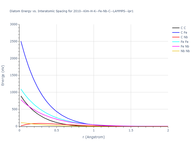 Plots of the potential energy vs interatomic spacing, r, are shown below for all diatom sets associated with the interatomic potential. This calculation provides insights into the functional form of the potential's two-body interactions. A system consisting of only two atoms is created, and the potential energy is evaluated for the atoms separated by 0.02 Å <= r <= 6.0> Å in intervals of 0.02 Å. Two plots are shown: one for the "standard" interaction distance range, and one for small values of r. The small r plot is useful for determining whether the potential is suitable for radiation studies.