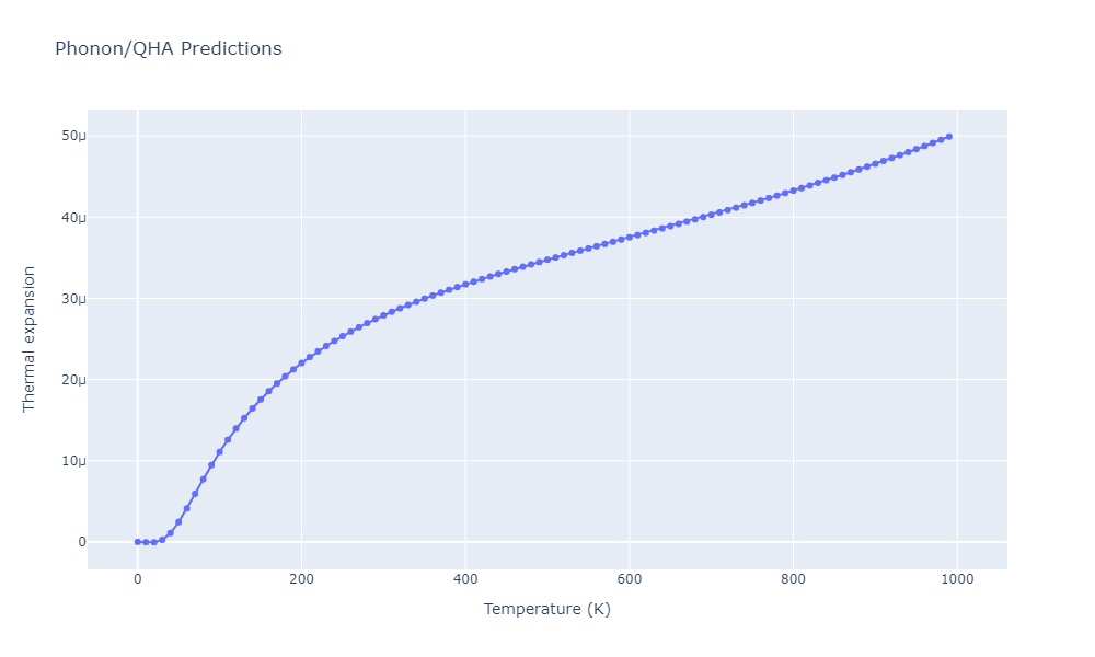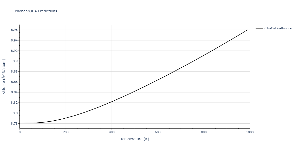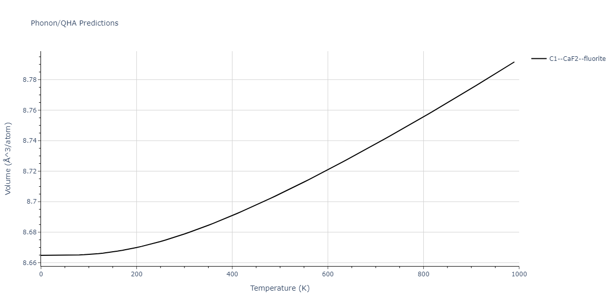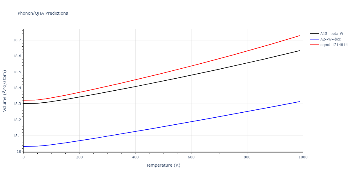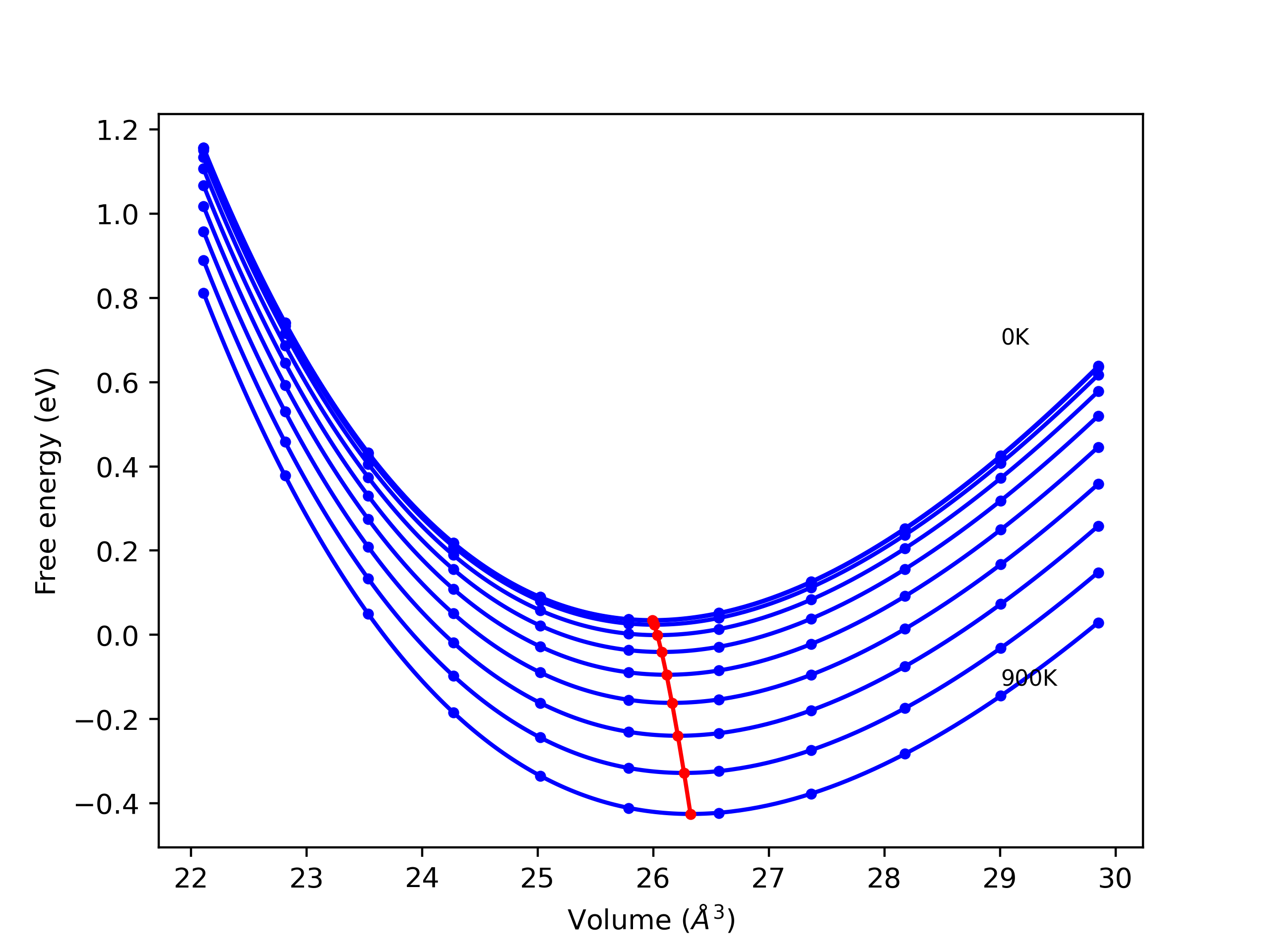 Plots of lattice and elastic constants are shown as a function of temperature. The 0K points were taken from the Crystal Structure Predictions and the Elastic Constants Predictions sections above for the unique crystal structures relaxed with the "dynamic" method. Starting from the 0 K relaxed crystal unit cells, supercell systems are created by replicating all three dimensions by the same multiplier to achieve at least 4000 atoms. The systems are then relaxed at 50 K and zero pressure using 1 million NPT steps. Lattice constants are estimated by averaging the measured box dimensions. Temperatures are iteratively increased by 50 K, with each subsequent relaxation calculation starting from the final atomic configuration at the previous temperature and relaxing for another 1 million steps.