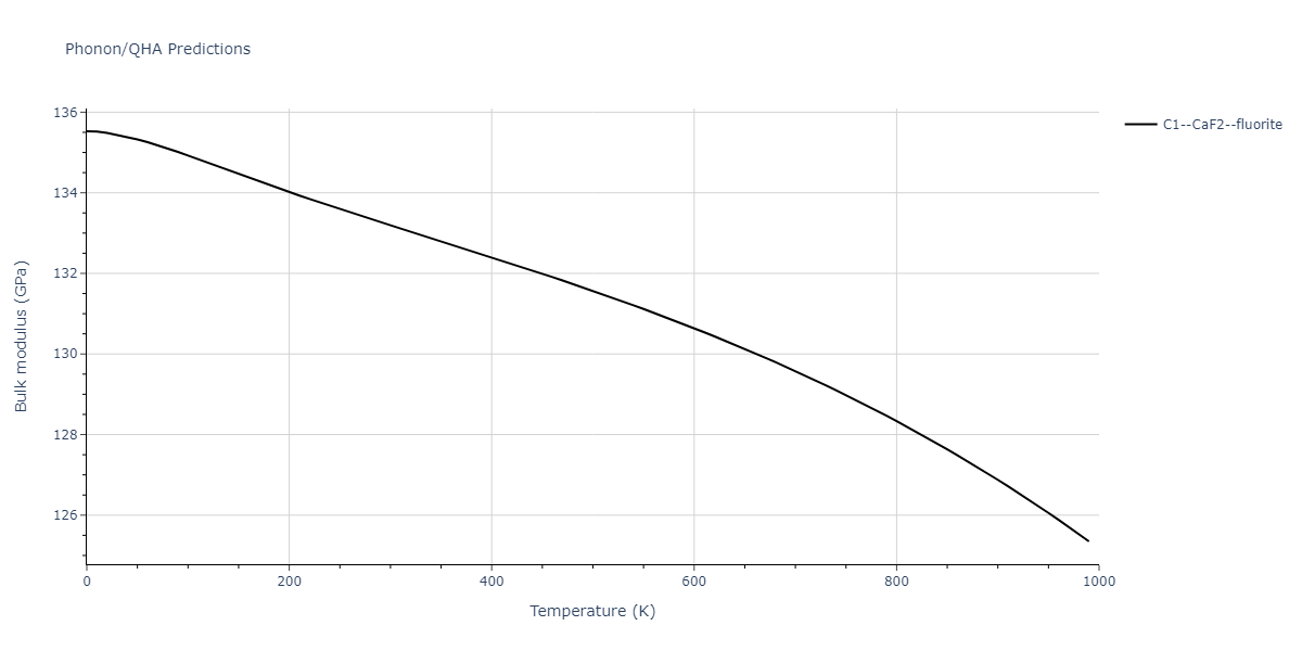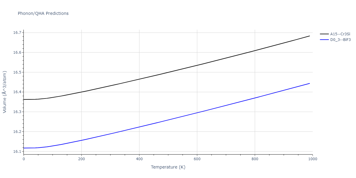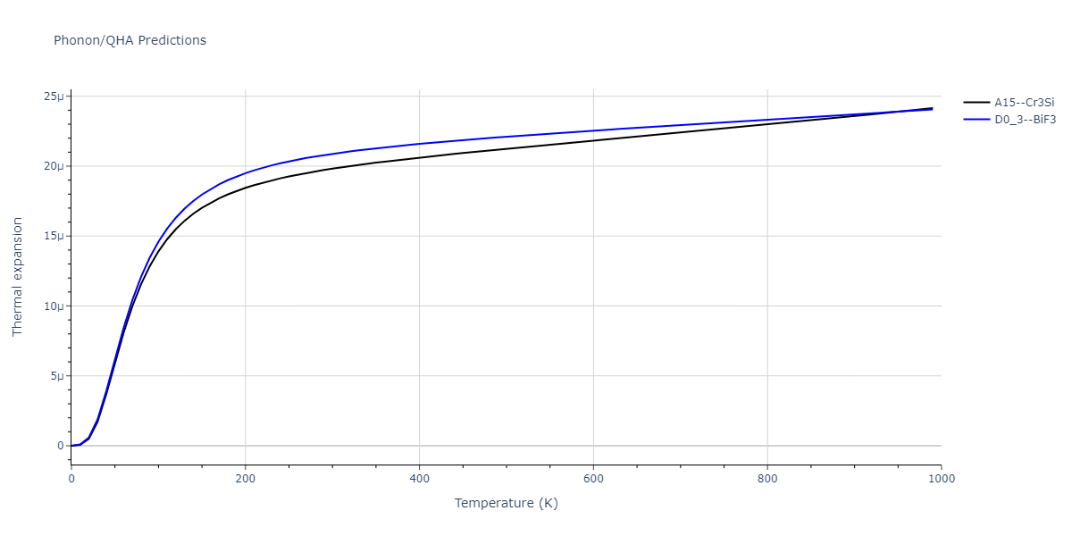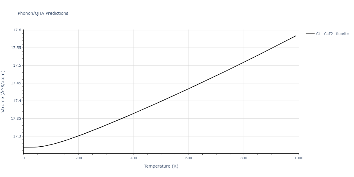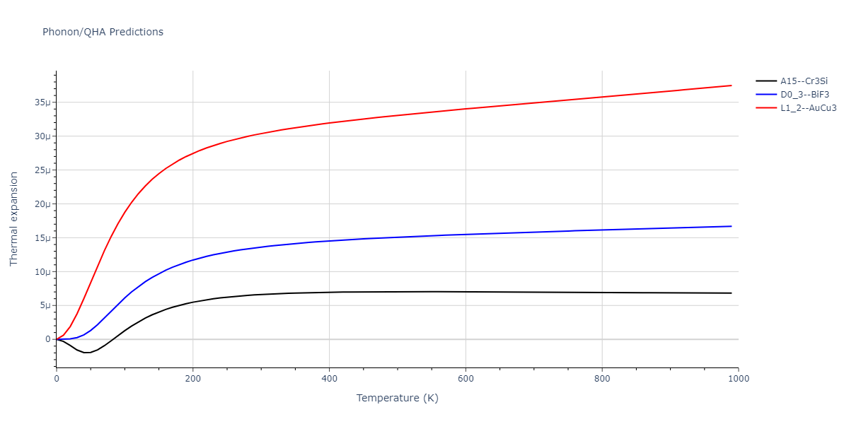 Plots of lattice and elastic constants are shown as a function of temperature. The 0K points were taken from the Crystal Structure Predictions and the Elastic Constants Predictions sections above for the unique crystal structures relaxed with the "dynamic" method. Starting from the 0 K relaxed crystal unit cells, supercell systems are created by replicating all three dimensions by the same multiplier to achieve at least 4000 atoms. The systems are then relaxed at 50 K and zero pressure using 1 million NPT steps. Lattice constants are estimated by averaging the measured box dimensions. Temperatures are iteratively increased by 50 K, with each subsequent relaxation calculation starting from the final atomic configuration at the previous temperature and relaxing for another 1 million steps.