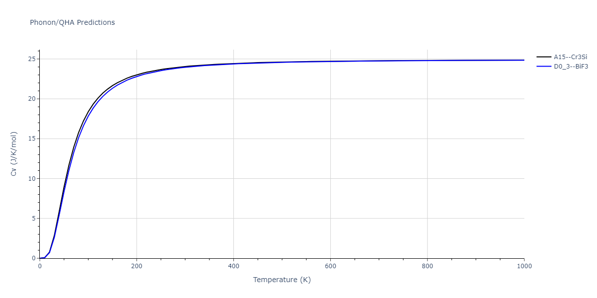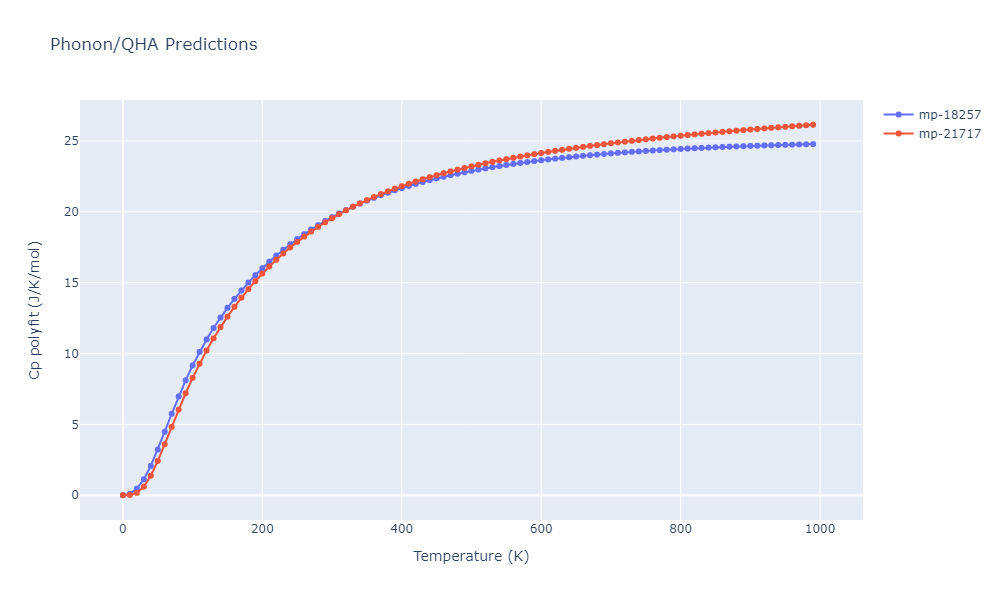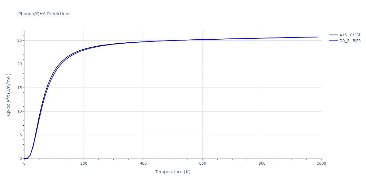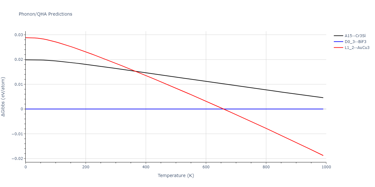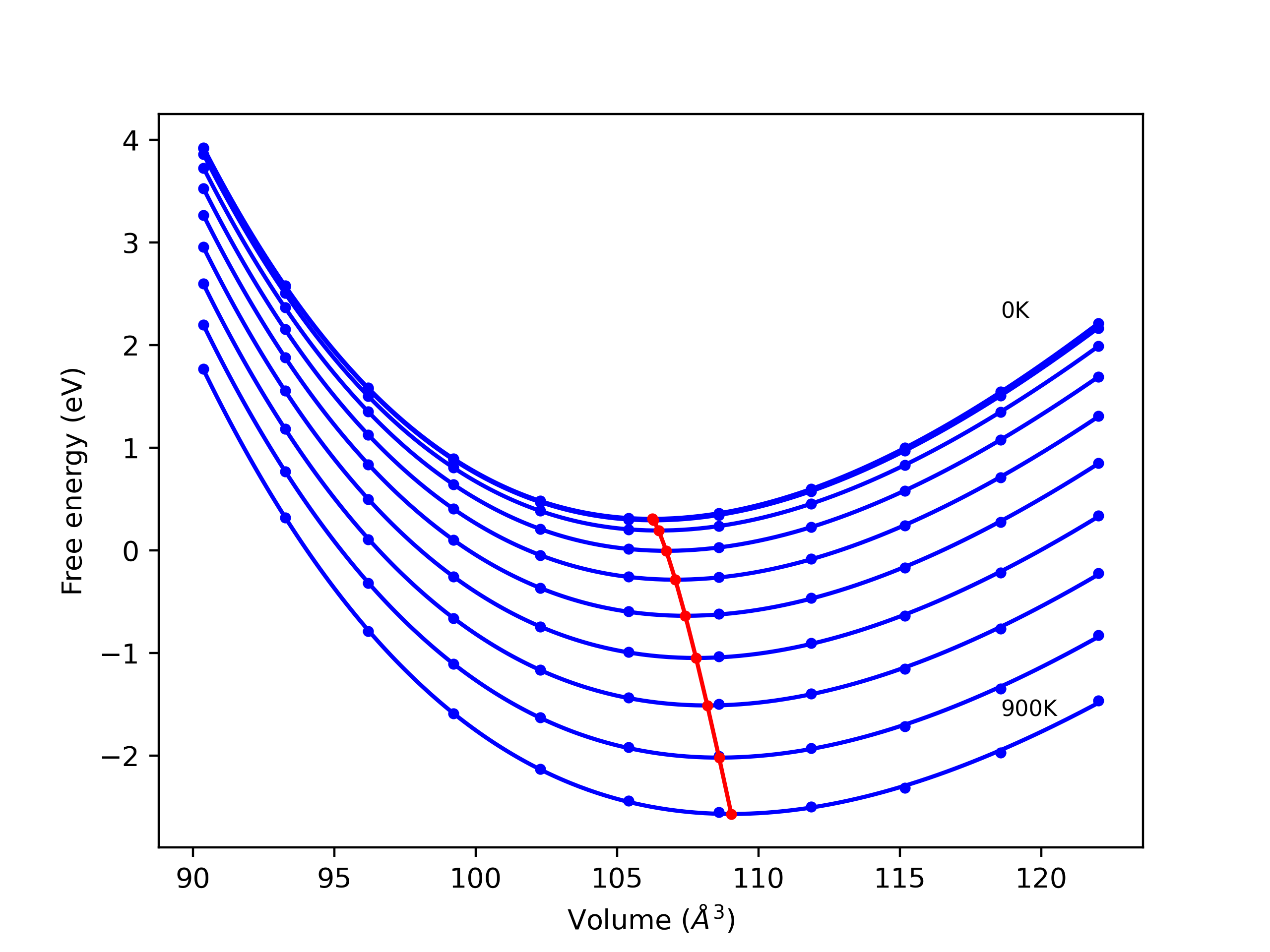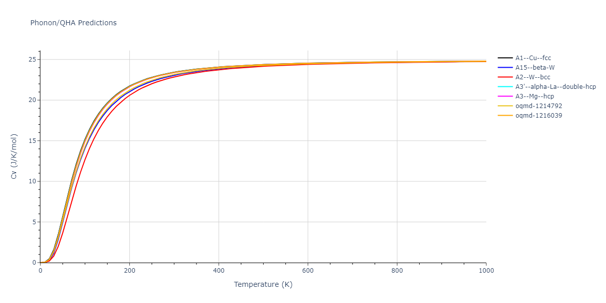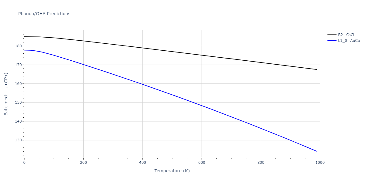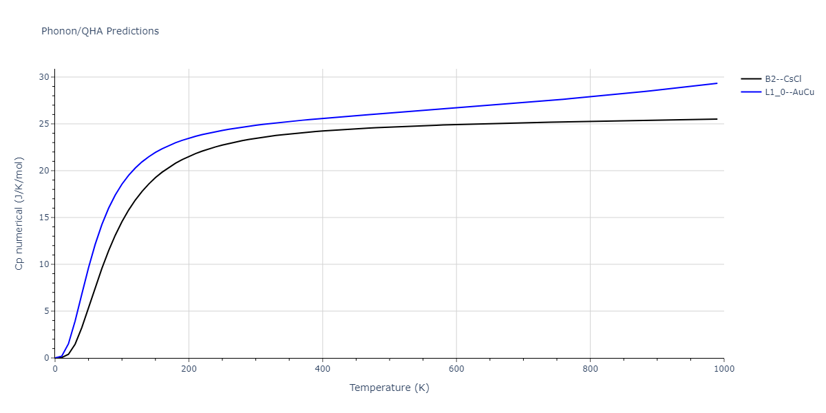 Plots of internal energy, Gibbs free energy, entropy, heat capacity and volume are shown here as a function of temperature for various crystal structures and liquid phases. The included crystal structures correspond to those in the Solid Structures vs. Temperature section, and the liquid phases to those in the Liquid Properties section. Internal energy and volume are taken from the associated structure relaxations mentioned in those previous sections. Constant pressure heat capacity is estimated using 3-point numerical derivatives of enthalpy versus temperature. Note that since all simulations done here are at 0 pressure, internal energy and enthalpy are equivalent.