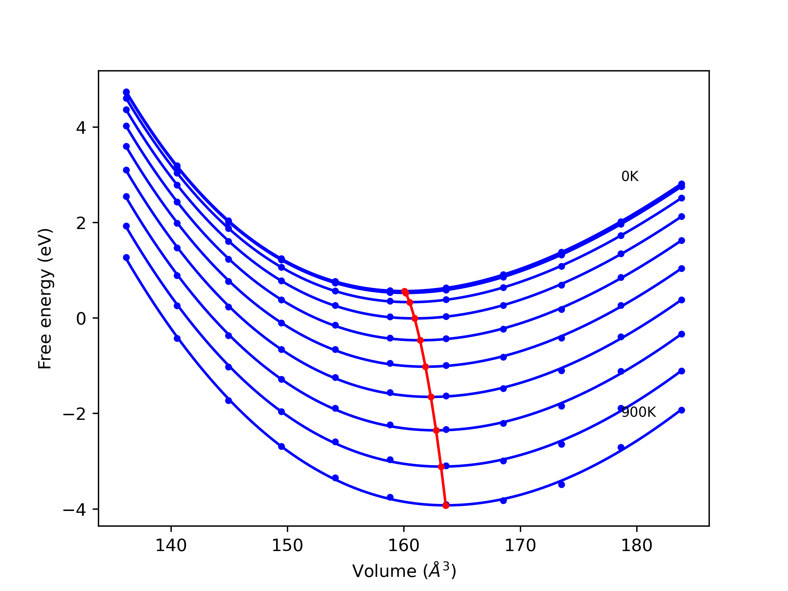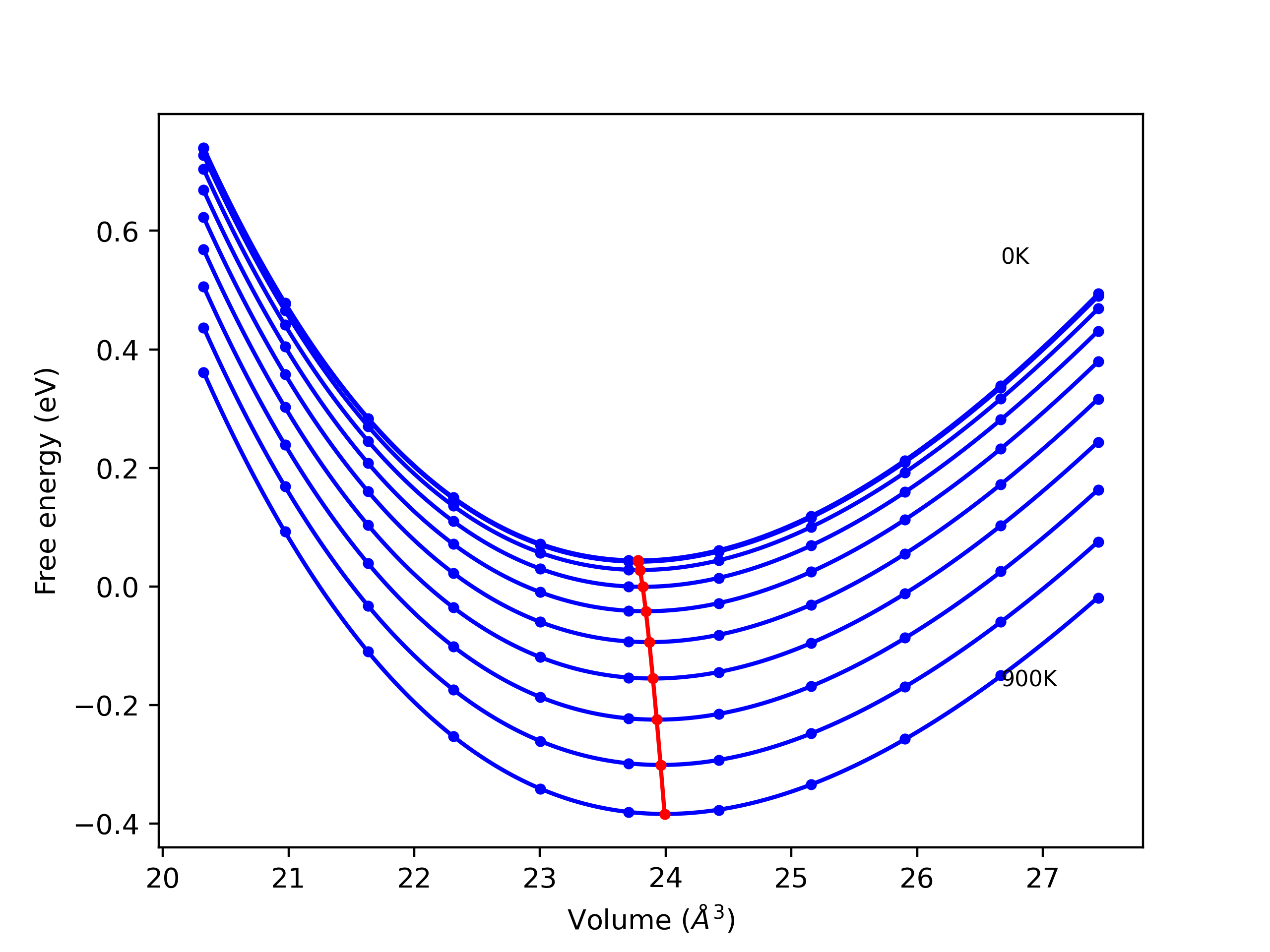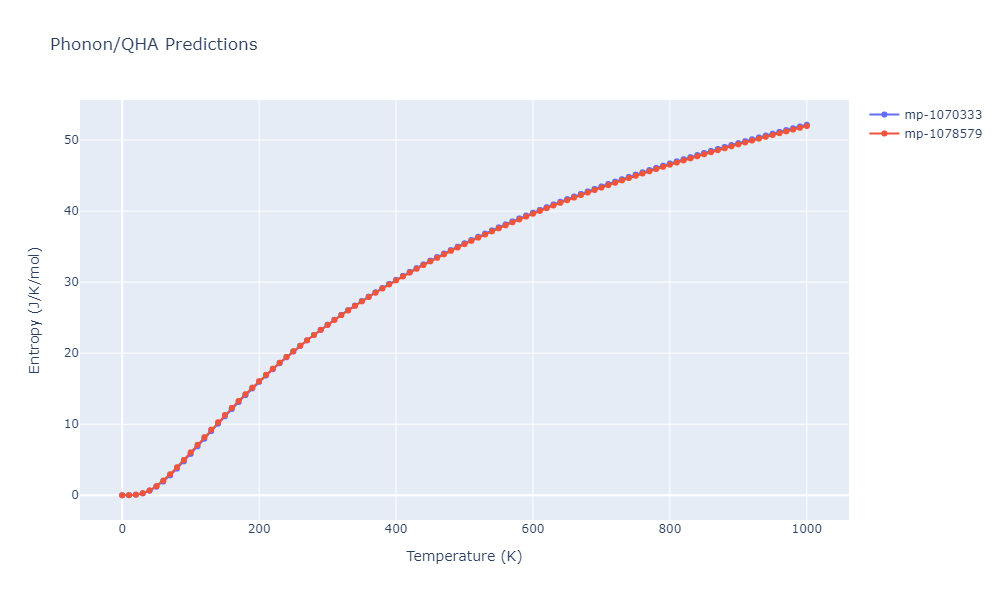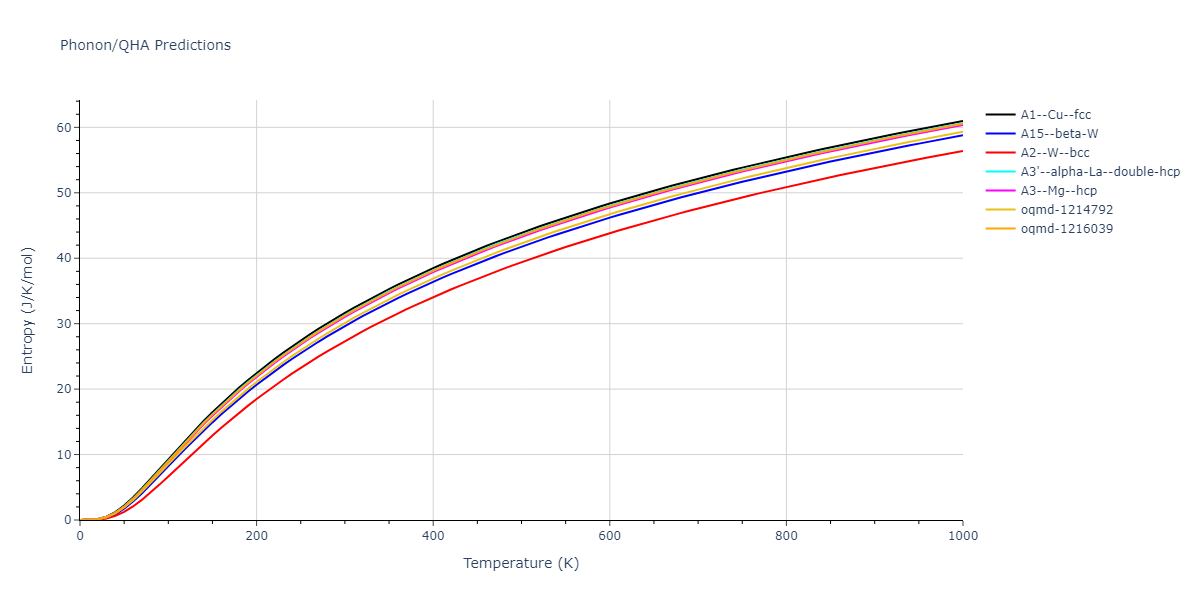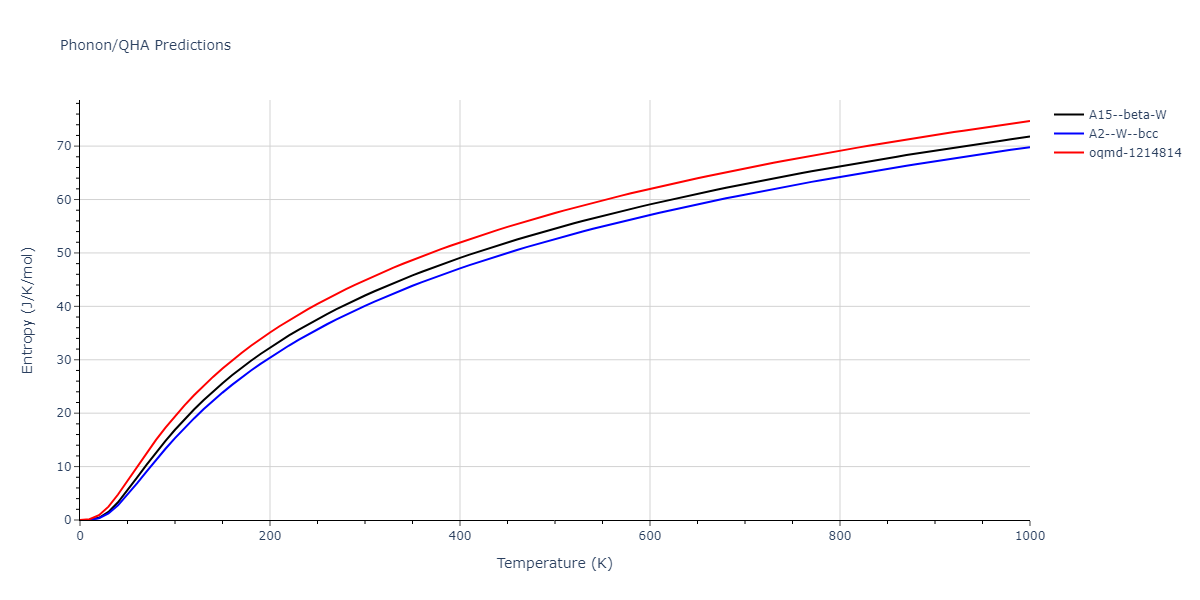 The Gibbs energies of the phases are estimated using thermodynamic integration between the interatomic potential in question and a simpler model with known Gibbs free energy values. For solids, the reference model is an Einstein solid, while for liquids it is the Uhlenbeck-Ford potential. Besides a short run at the start of the solid calculations to estimate Einstein model spring constants, the two calculations proceed similarly. Starting with the final relaxation configurations, the systems are stabilized for 25,000 steps. Then, over the next 50,000 steps the potential is swapped out for the reference potential. The system is then stabilized for another 25,000 steps with the reference model before a reverse swap of 50,000 steps is performed. The simulation ends with one final 25,000 step stabilization period. From the simulation, the irreversible work of transformation is estimated and used to compute the absolute Gibbs free energy of the target phase and potential relative to the reference potential. Entropy is estimated as the difference in enthalpy and Gibbs free energy and divided by temperature.