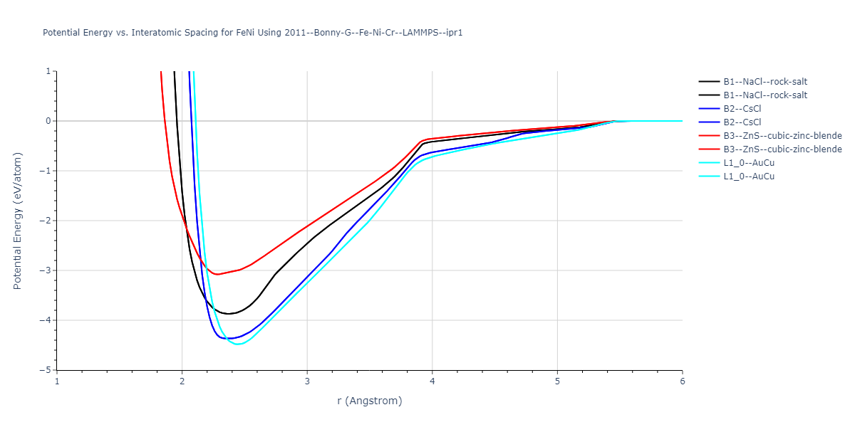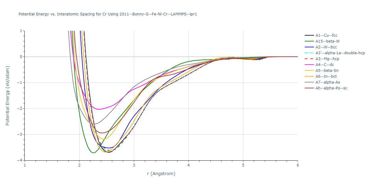 Plots of potential energy vs interatomic spacing, r, are shown below for a number of crystal structures. The structures are generated based on the ideal atomic positions and b/a and c/a lattice parameter ratios for a given crystal prototype. The size of the system is then uniformly scaled, and the energy calculated without relaxing the system. To obtain these plots, values of r are evaluated every 0.02 Å up to 6 Å.
