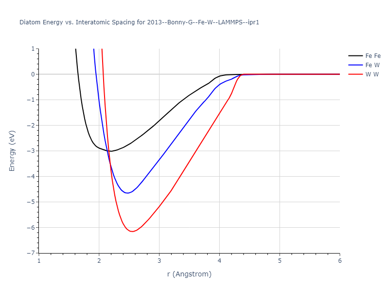 Plots of the potential energy vs interatomic spacing, r, are shown below for all diatom sets associated with the interatomic potential. This calculation provides insights into the functional form of the potential's two-body interactions. A system consisting of only two atoms is created, and the potential energy is evaluated for the atoms separated by 0.02 Å <= r <= 6.0> Å in intervals of 0.02 Å. Two plots are shown: one for the "standard" interaction distance range, and one for small values of r. The small r plot is useful for determining whether the potential is suitable for radiation studies.