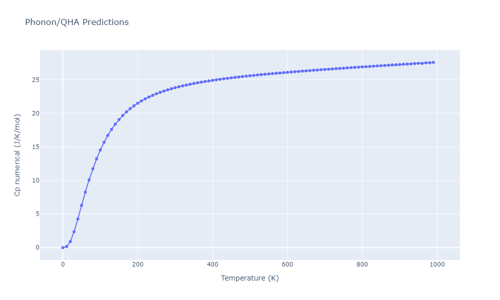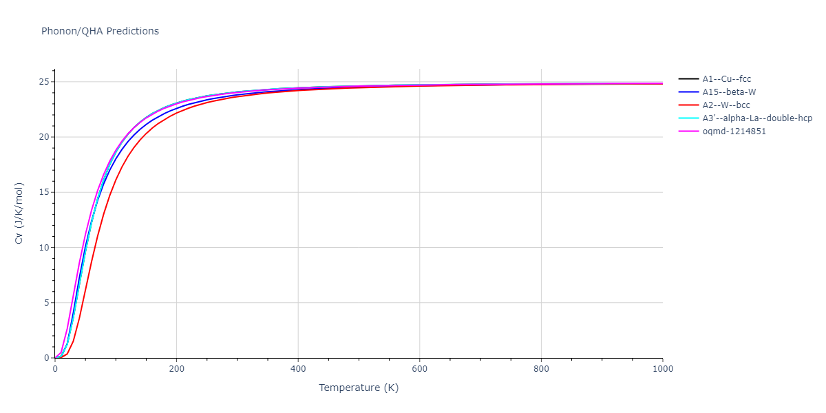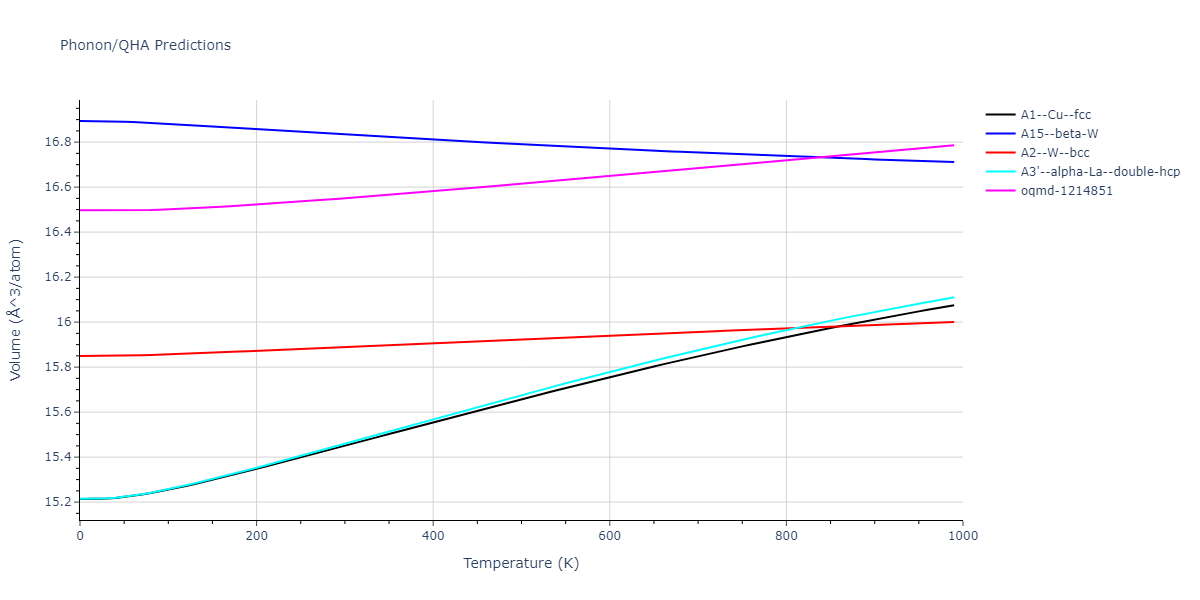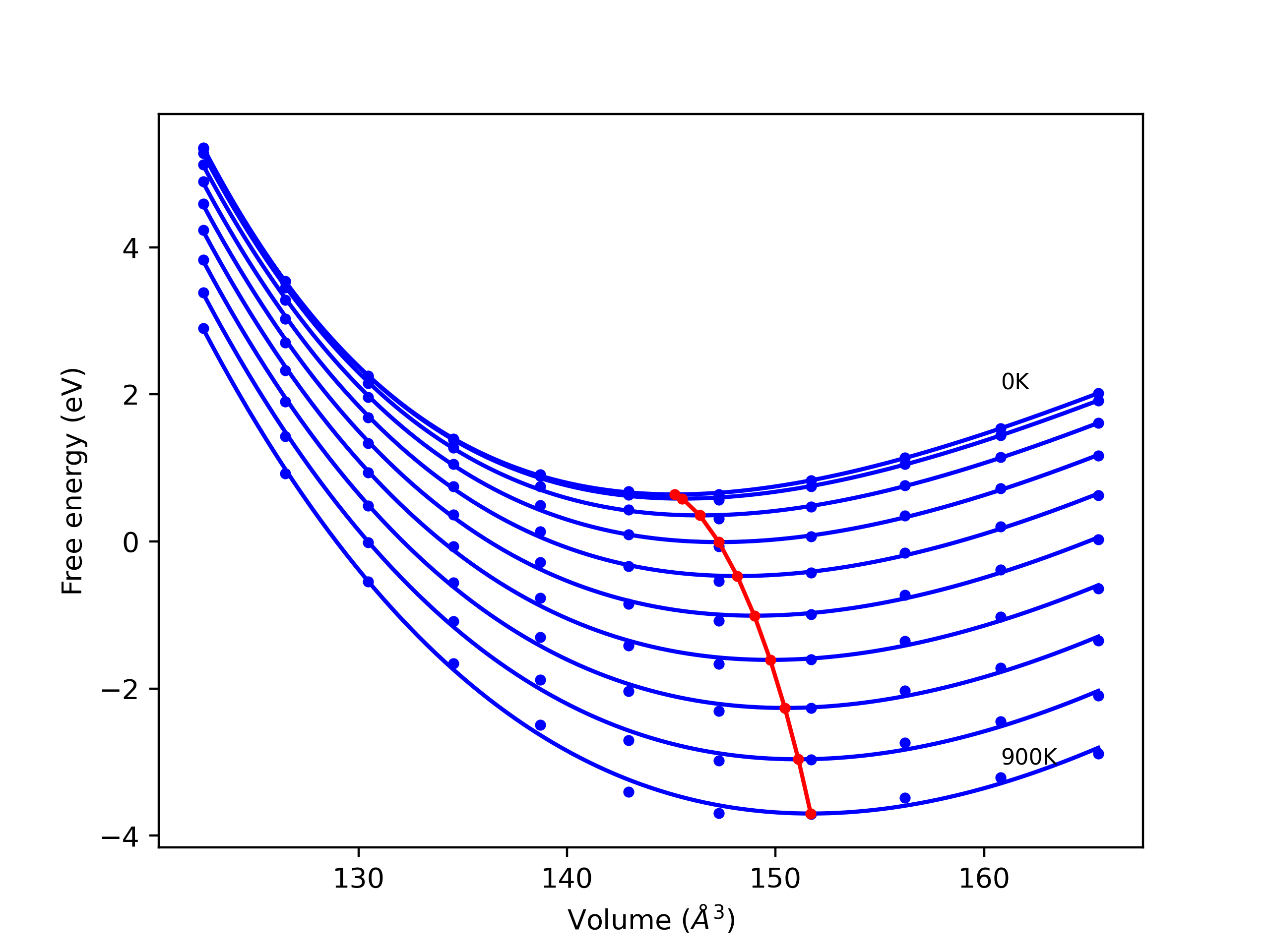 Phonon band structures and crystal properties estimated from quasi-harmonic approximation (QHA) calculations are displayed for select crystals. The calculations were performed using phonopy and LAMMPS. For the phonon calculations, 3x3 supercells of the potential-specific relaxed crystals were used. The QHA calculations were based on 11 strain states ranging from -0.05 to 0.05.