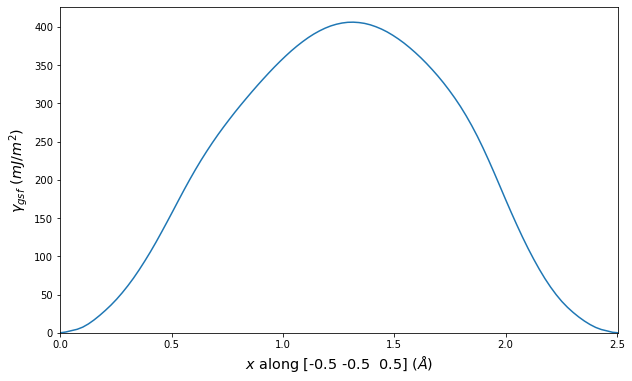 5. The stacking fault energy for a given shift is computed by comparing the energy of the system before and after applying the shift, and dividing by the area of the fault plane