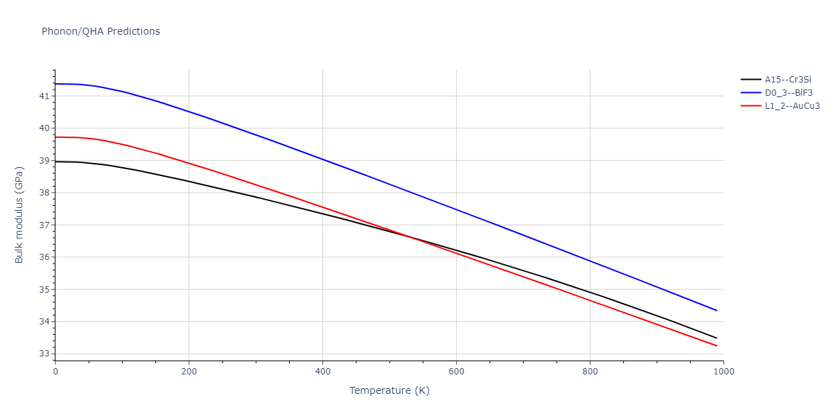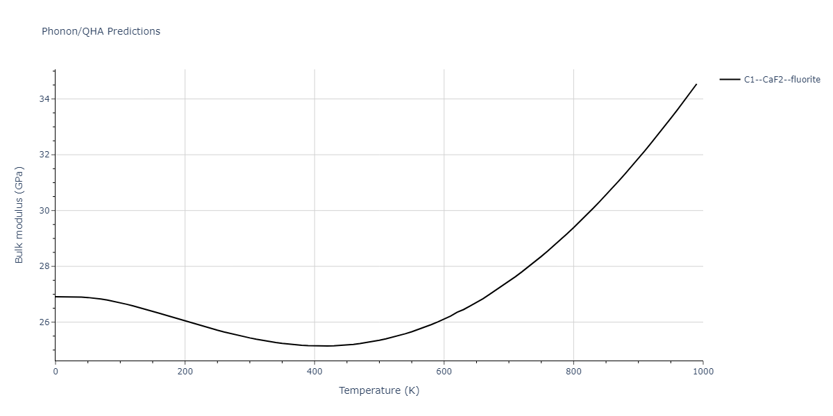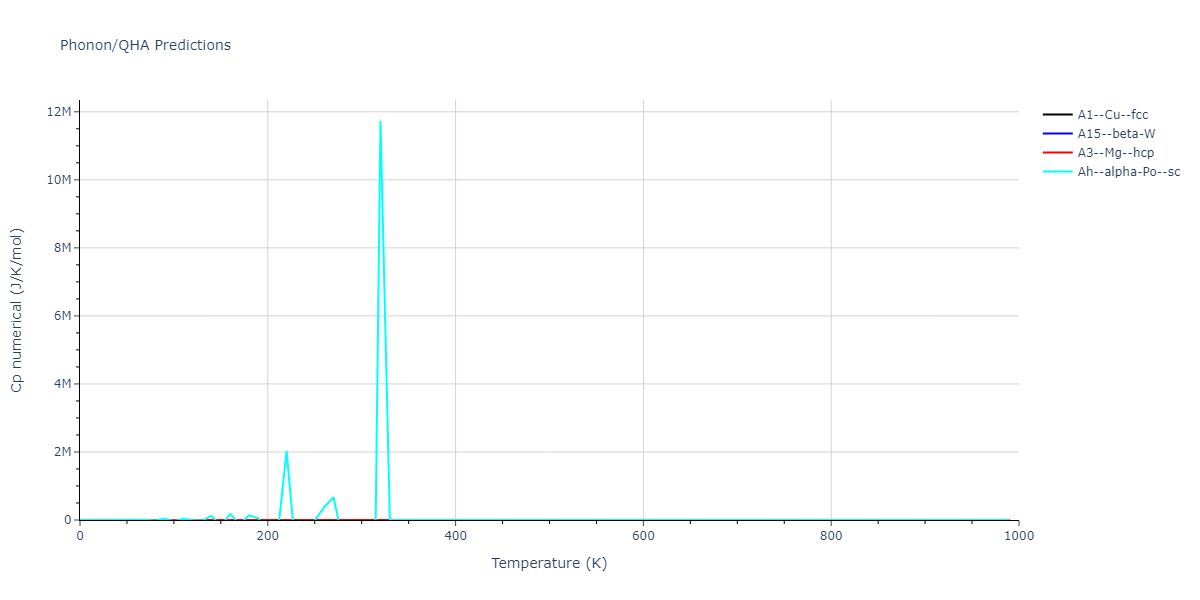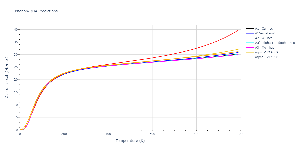 Phonon band structures and crystal properties estimated from quasi-harmonic approximation (QHA) calculations are displayed for select crystals. The calculations were performed using phonopy and LAMMPS. For the phonon calculations, 3x3 supercells of the potential-specific relaxed crystals were used. The QHA calculations were based on 11 strain states ranging from -0.05 to 0.05.
