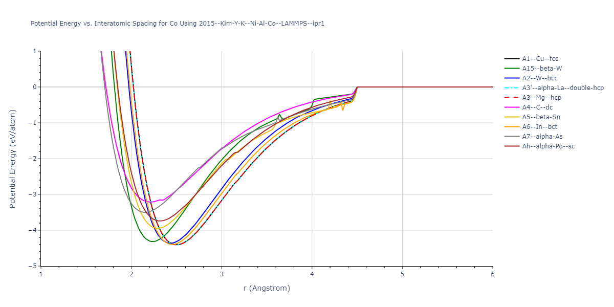 Plots of potential energy vs interatomic spacing, r, are shown below for a number of crystal structures. The structures are generated based on the ideal atomic positions and b/a and c/a lattice parameter ratios for a given crystal prototype. The size of the system is then uniformly scaled, and the energy calculated without relaxing the system. To obtain these plots, values of r are evaluated every 0.02 Å up to 6 Å.