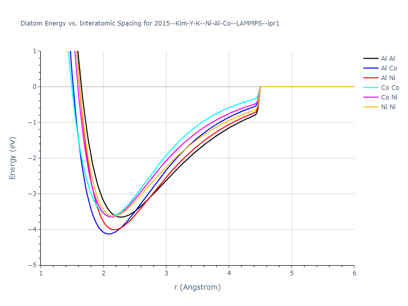 Plots of the potential energy vs interatomic spacing, r, are shown below for all diatom sets associated with the interatomic potential. This calculation provides insights into the functional form of the potential's two-body interactions. A system consisting of only two atoms is created, and the potential energy is evaluated for the atoms separated by 0.02 Å <= r <= 6.0> Å in intervals of 0.02 Å. Two plots are shown: one for the "standard" interaction distance range, and one for small values of r. The small r plot is useful for determining whether the potential is suitable for radiation studies.