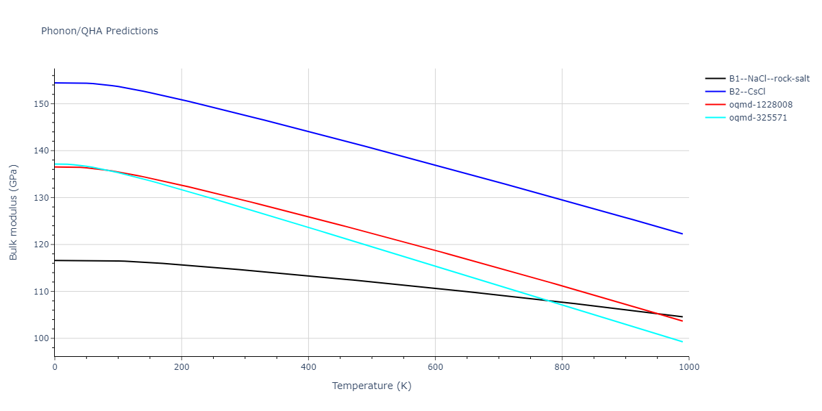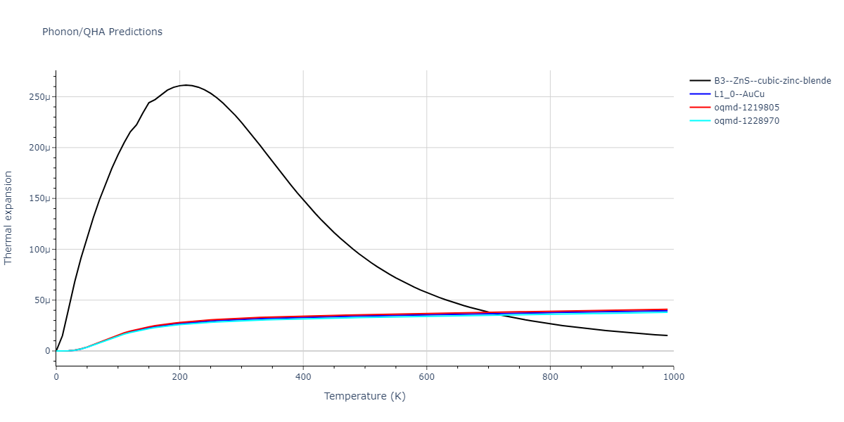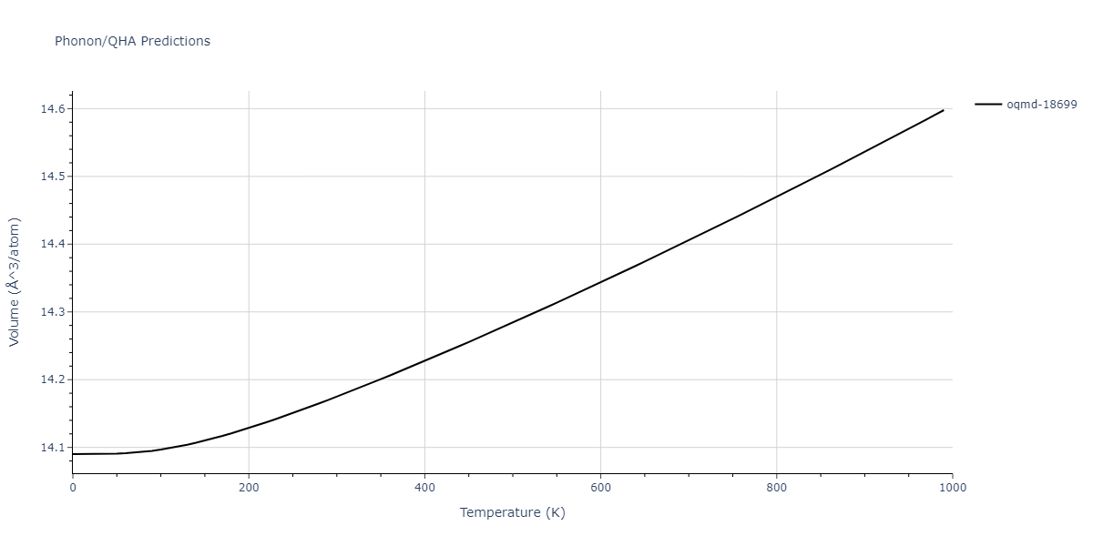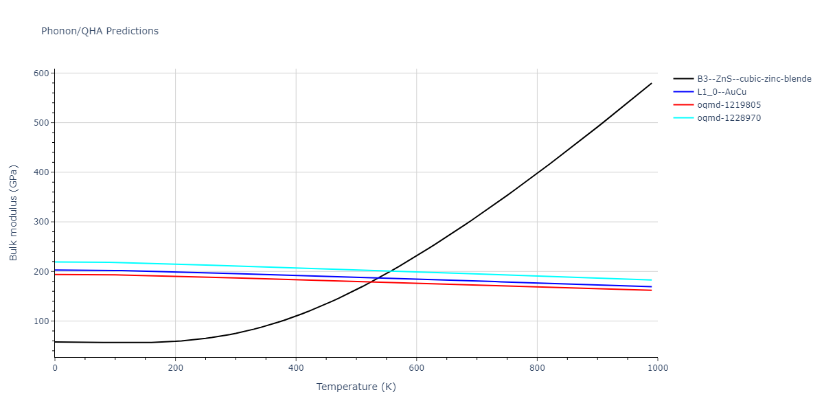 Plots of lattice and elastic constants are shown as a function of temperature. The 0K points were taken from the Crystal Structure Predictions and the Elastic Constants Predictions sections above for the unique crystal structures relaxed with the "dynamic" method. Starting from the 0 K relaxed crystal unit cells, supercell systems are created by replicating all three dimensions by the same multiplier to achieve at least 4000 atoms. The systems are then relaxed at 50 K and zero pressure using 1 million NPT steps. Lattice constants are estimated by averaging the measured box dimensions. Temperatures are iteratively increased by 50 K, with each subsequent relaxation calculation starting from the final atomic configuration at the previous temperature and relaxing for another 1 million steps.