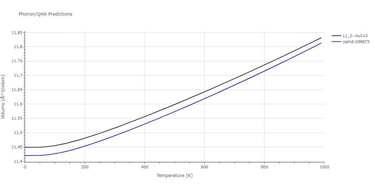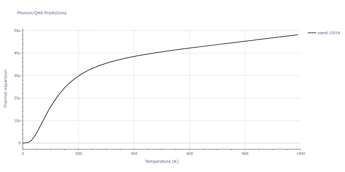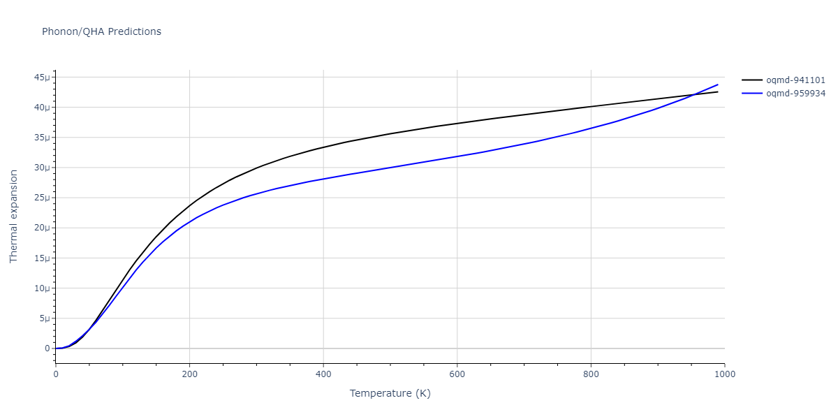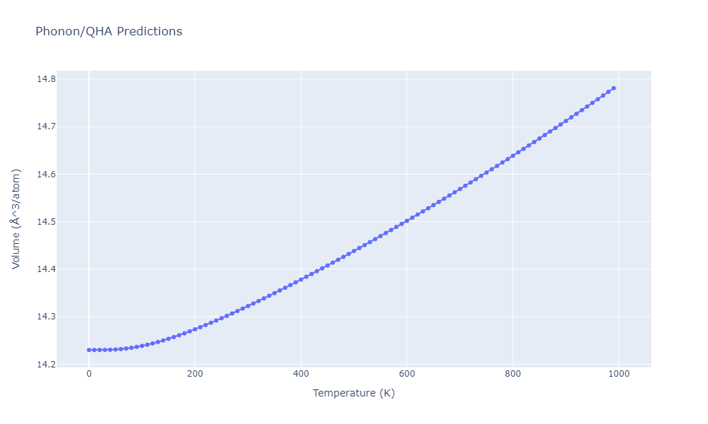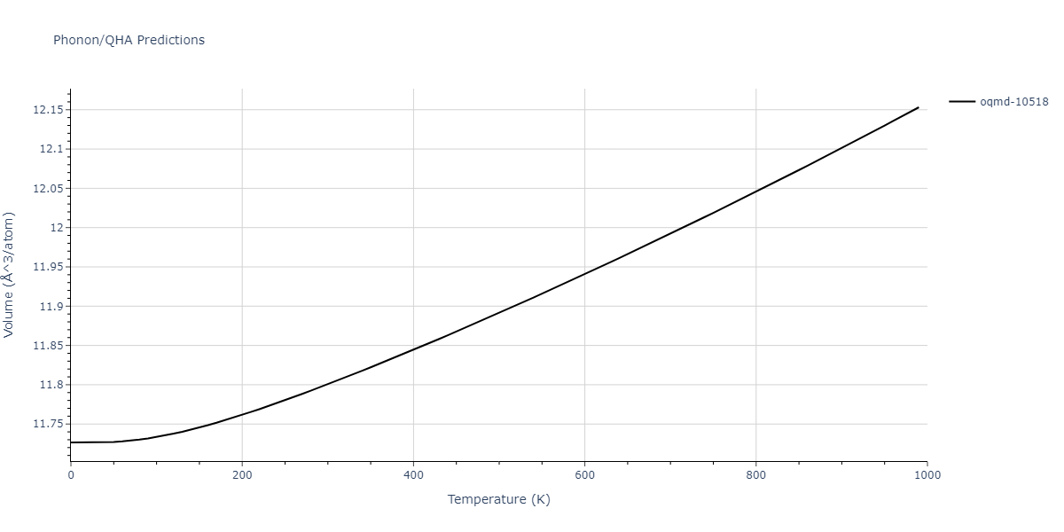 Plots of lattice and elastic constants are shown as a function of temperature. The 0K points were taken from the Crystal Structure Predictions and the Elastic Constants Predictions sections above for the unique crystal structures relaxed with the "dynamic" method. Starting from the 0 K relaxed crystal unit cells, supercell systems are created by replicating all three dimensions by the same multiplier to achieve at least 4000 atoms. The systems are then relaxed at 50 K and zero pressure using 1 million NPT steps. Lattice constants are estimated by averaging the measured box dimensions. Temperatures are iteratively increased by 50 K, with each subsequent relaxation calculation starting from the final atomic configuration at the previous temperature and relaxing for another 1 million steps.