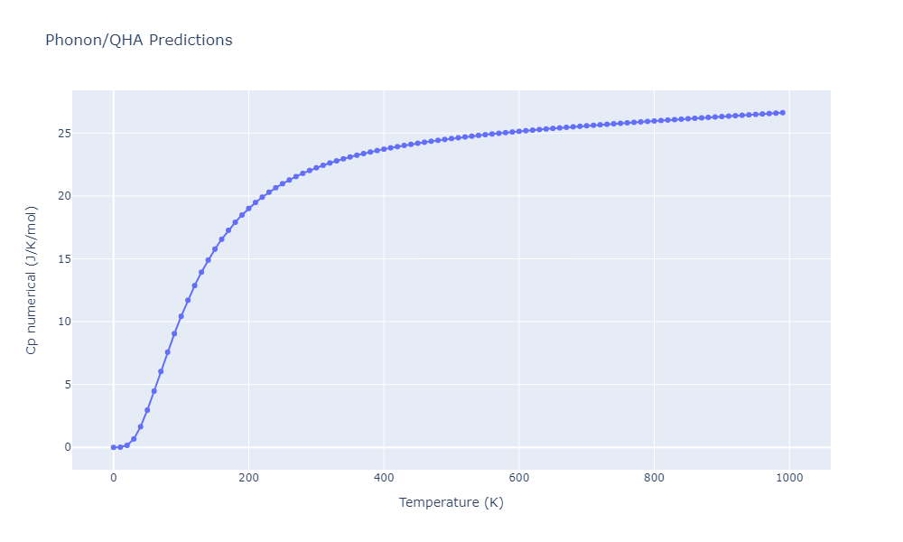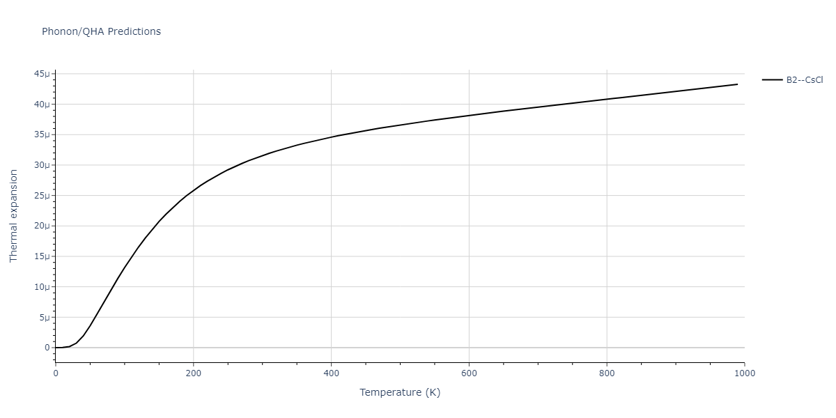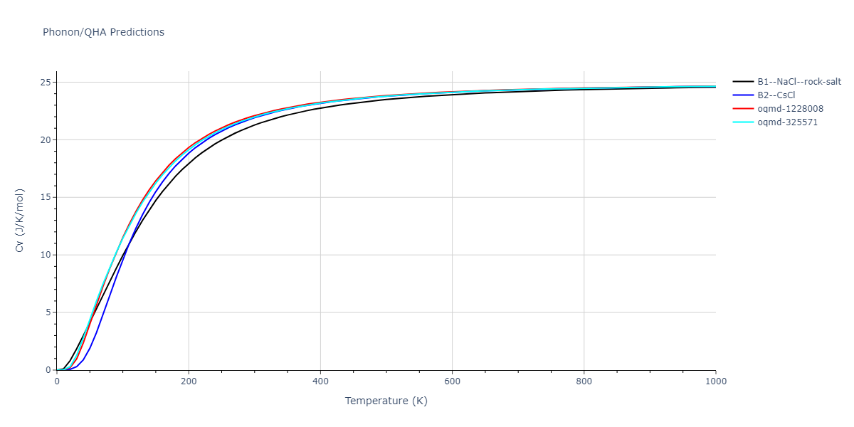 Plots of internal energy, Gibbs free energy, entropy, heat capacity and volume are shown here as a function of temperature for various crystal structures and liquid phases. The included crystal structures correspond to those in the Solid Structures vs. Temperature section, and the liquid phases to those in the Liquid Properties section. Internal energy and volume are taken from the associated structure relaxations mentioned in those previous sections. Constant pressure heat capacity is estimated using 3-point numerical derivatives of enthalpy versus temperature. Note that since all simulations done here are at 0 pressure, internal energy and enthalpy are equivalent.