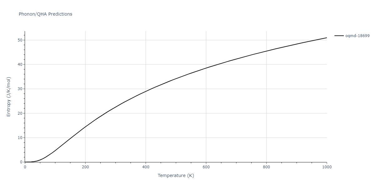 The Gibbs energies of the phases are estimated using thermodynamic integration between the interatomic potential in question and a simpler model with known Gibbs free energy values. For solids, the reference model is an Einstein solid, while for liquids it is the Uhlenbeck-Ford potential. Besides a short run at the start of the solid calculations to estimate Einstein model spring constants, the two calculations proceed similarly. Starting with the final relaxation configurations, the systems are stabilized for 25,000 steps. Then, over the next 50,000 steps the potential is swapped out for the reference potential. The system is then stabilized for another 25,000 steps with the reference model before a reverse swap of 50,000 steps is performed. The simulation ends with one final 25,000 step stabilization period. From the simulation, the irreversible work of transformation is estimated and used to compute the absolute Gibbs free energy of the target phase and potential relative to the reference potential. Entropy is estimated as the difference in enthalpy and Gibbs free energy and divided by temperature.