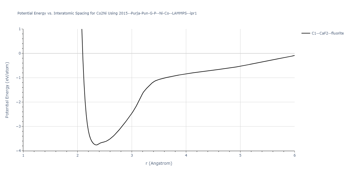 Plots of potential energy vs interatomic spacing, r, are shown below for a number of crystal structures. The structures are generated based on the ideal atomic positions and b/a and c/a lattice parameter ratios for a given crystal prototype. The size of the system is then uniformly scaled, and the energy calculated without relaxing the system. To obtain these plots, values of r are evaluated every 0.02 Å up to 6 Å.