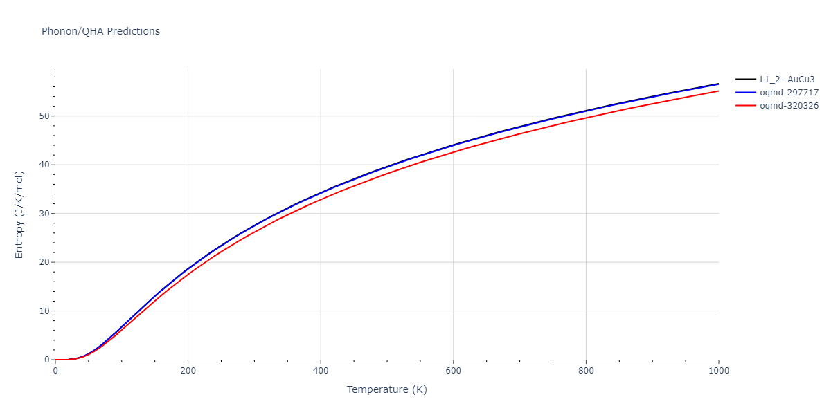 The Gibbs energies of the phases are estimated using thermodynamic integration between the interatomic potential in question and a simpler model with known Gibbs free energy values. For solids, the reference model is an Einstein solid, while for liquids it is the Uhlenbeck-Ford potential. Besides a short run at the start of the solid calculations to estimate Einstein model spring constants, the two calculations proceed similarly. Starting with the final relaxation configurations, the systems are stabilized for 25,000 steps. Then, over the next 50,000 steps the potential is swapped out for the reference potential. The system is then stabilized for another 25,000 steps with the reference model before a reverse swap of 50,000 steps is performed. The simulation ends with one final 25,000 step stabilization period. From the simulation, the irreversible work of transformation is estimated and used to compute the absolute Gibbs free energy of the target phase and potential relative to the reference potential. Entropy is estimated as the difference in enthalpy and Gibbs free energy and divided by temperature.