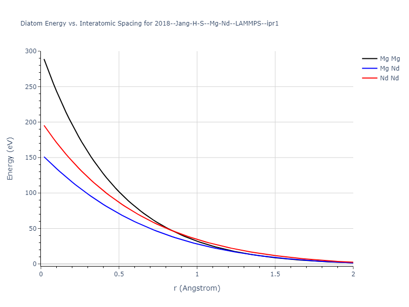 Plots of the potential energy vs interatomic spacing, r, are shown below for all diatom sets associated with the interatomic potential. This calculation provides insights into the functional form of the potential's two-body interactions. A system consisting of only two atoms is created, and the potential energy is evaluated for the atoms separated by 0.02 Å <= r <= 6.0> Å in intervals of 0.02 Å. Two plots are shown: one for the "standard" interaction distance range, and one for small values of r. The small r plot is useful for determining whether the potential is suitable for radiation studies.