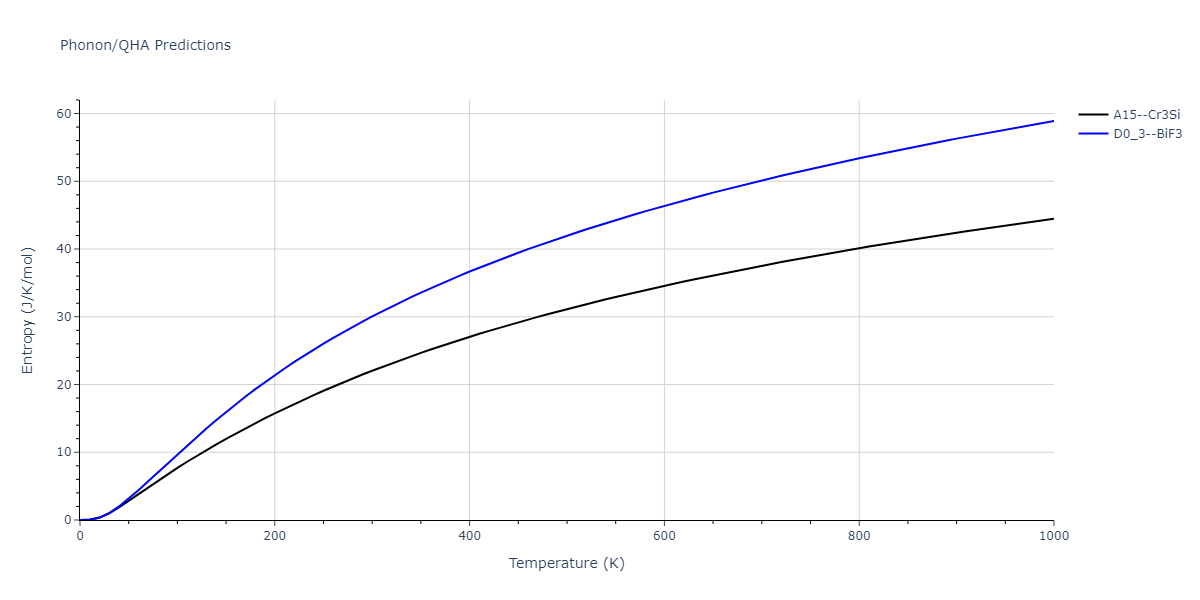 The Gibbs energies of the phases are estimated using thermodynamic integration between the interatomic potential in question and a simpler model with known Gibbs free energy values. For solids, the reference model is an Einstein solid, while for liquids it is the Uhlenbeck-Ford potential. Besides a short run at the start of the solid calculations to estimate Einstein model spring constants, the two calculations proceed similarly. Starting with the final relaxation configurations, the systems are stabilized for 25,000 steps. Then, over the next 50,000 steps the potential is swapped out for the reference potential. The system is then stabilized for another 25,000 steps with the reference model before a reverse swap of 50,000 steps is performed. The simulation ends with one final 25,000 step stabilization period. From the simulation, the irreversible work of transformation is estimated and used to compute the absolute Gibbs free energy of the target phase and potential relative to the reference potential. Entropy is estimated as the difference in enthalpy and Gibbs free energy and divided by temperature.