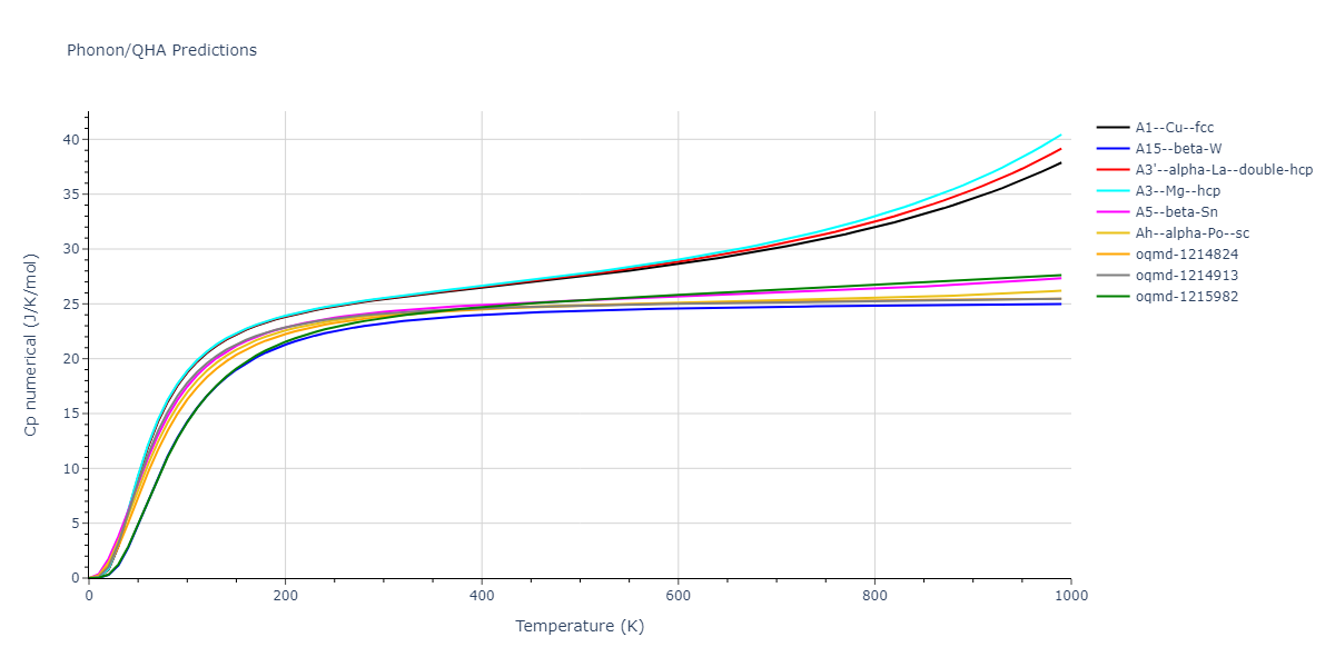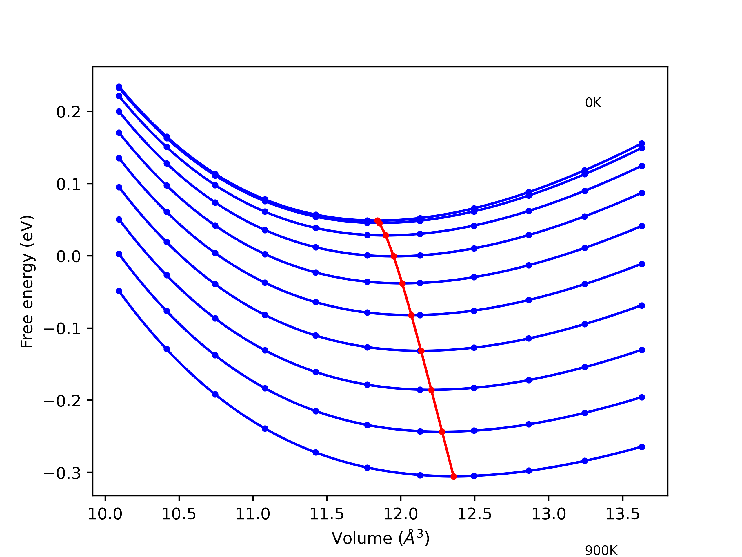 Phonon band structures and crystal properties estimated from quasi-harmonic approximation (QHA) calculations are displayed for select crystals. The calculations were performed using phonopy and LAMMPS. For the phonon calculations, 3x3 supercells of the potential-specific relaxed crystals were used. The QHA calculations were based on 11 strain states ranging from -0.05 to 0.05.
