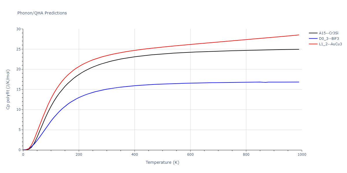 Plots of internal energy, Gibbs free energy, entropy, heat capacity and volume are shown here as a function of temperature for various crystal structures and liquid phases. The included crystal structures correspond to those in the Solid Structures vs. Temperature section, and the liquid phases to those in the Liquid Properties section. Internal energy and volume are taken from the associated structure relaxations mentioned in those previous sections. Constant pressure heat capacity is estimated using 3-point numerical derivatives of enthalpy versus temperature. Note that since all simulations done here are at 0 pressure, internal energy and enthalpy are equivalent.