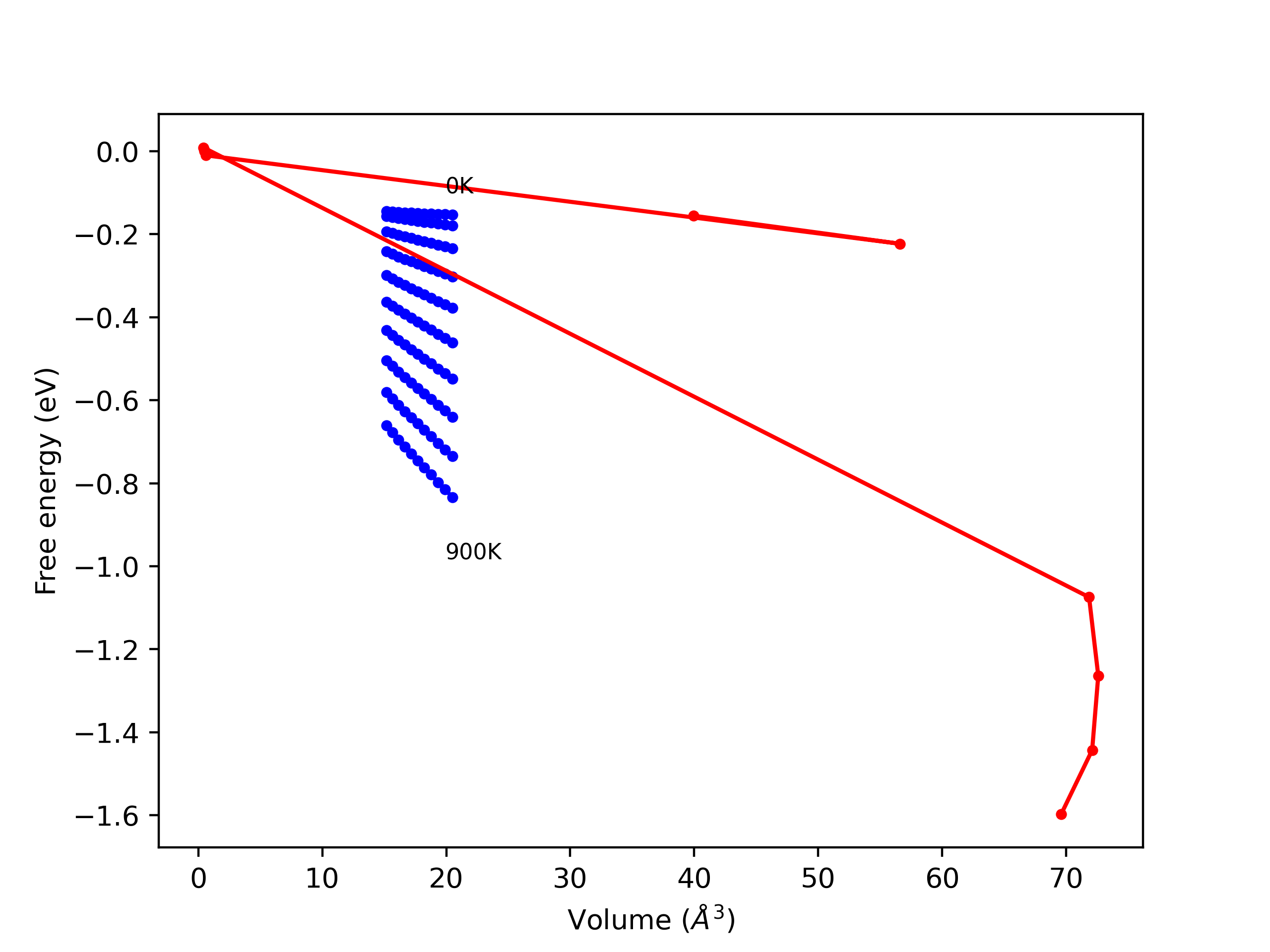 The Gibbs energies of the phases are estimated using thermodynamic integration between the interatomic potential in question and a simpler model with known Gibbs free energy values. For solids, the reference model is an Einstein solid, while for liquids it is the Uhlenbeck-Ford potential. Besides a short run at the start of the solid calculations to estimate Einstein model spring constants, the two calculations proceed similarly. Starting with the final relaxation configurations, the systems are stabilized for 25,000 steps. Then, over the next 50,000 steps the potential is swapped out for the reference potential. The system is then stabilized for another 25,000 steps with the reference model before a reverse swap of 50,000 steps is performed. The simulation ends with one final 25,000 step stabilization period. From the simulation, the irreversible work of transformation is estimated and used to compute the absolute Gibbs free energy of the target phase and potential relative to the reference potential. Entropy is estimated as the difference in enthalpy and Gibbs free energy and divided by temperature.