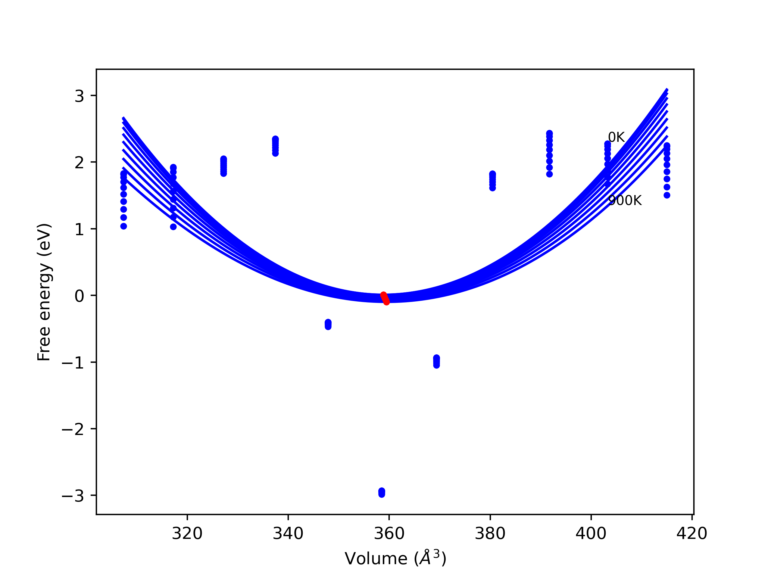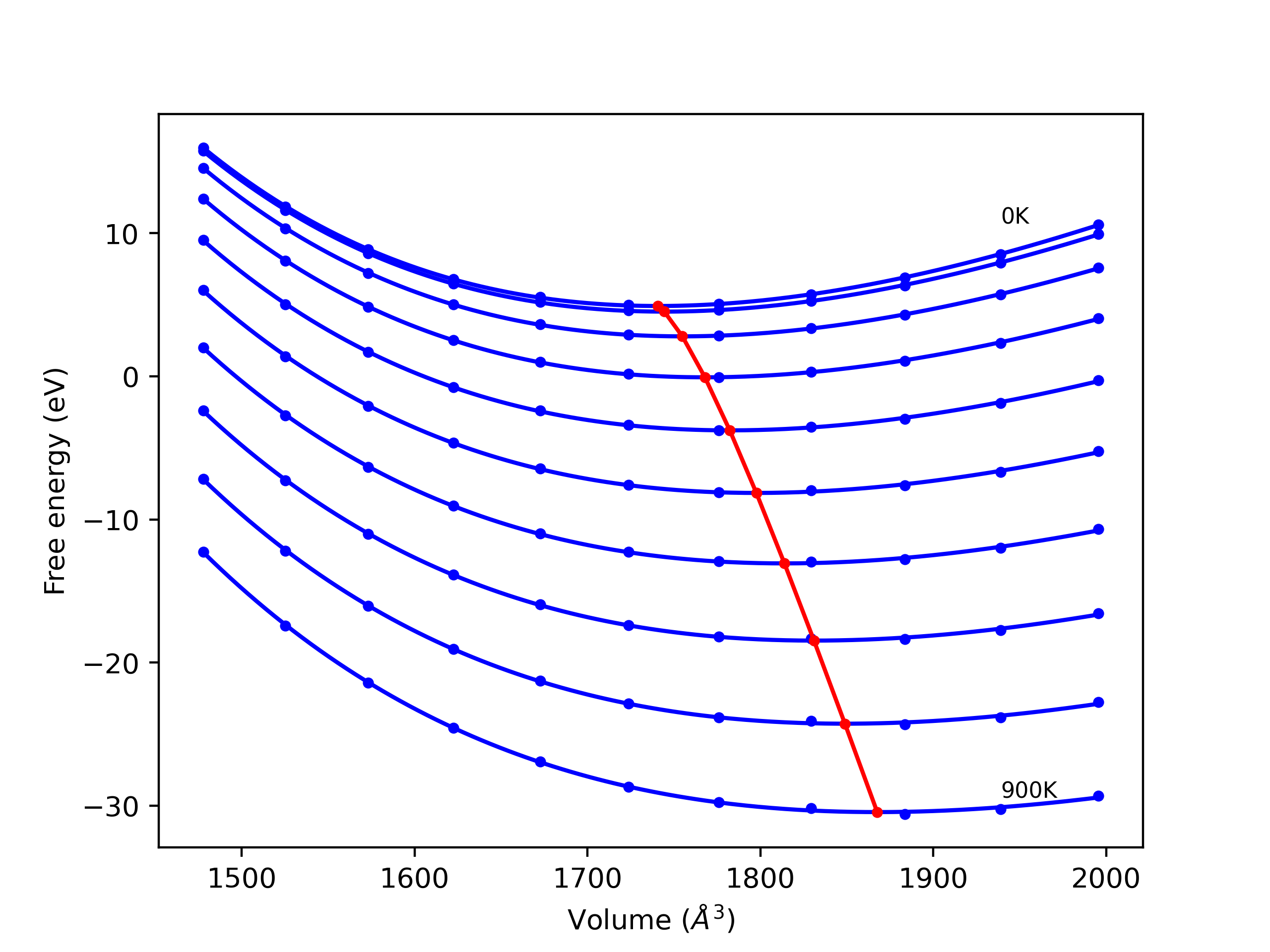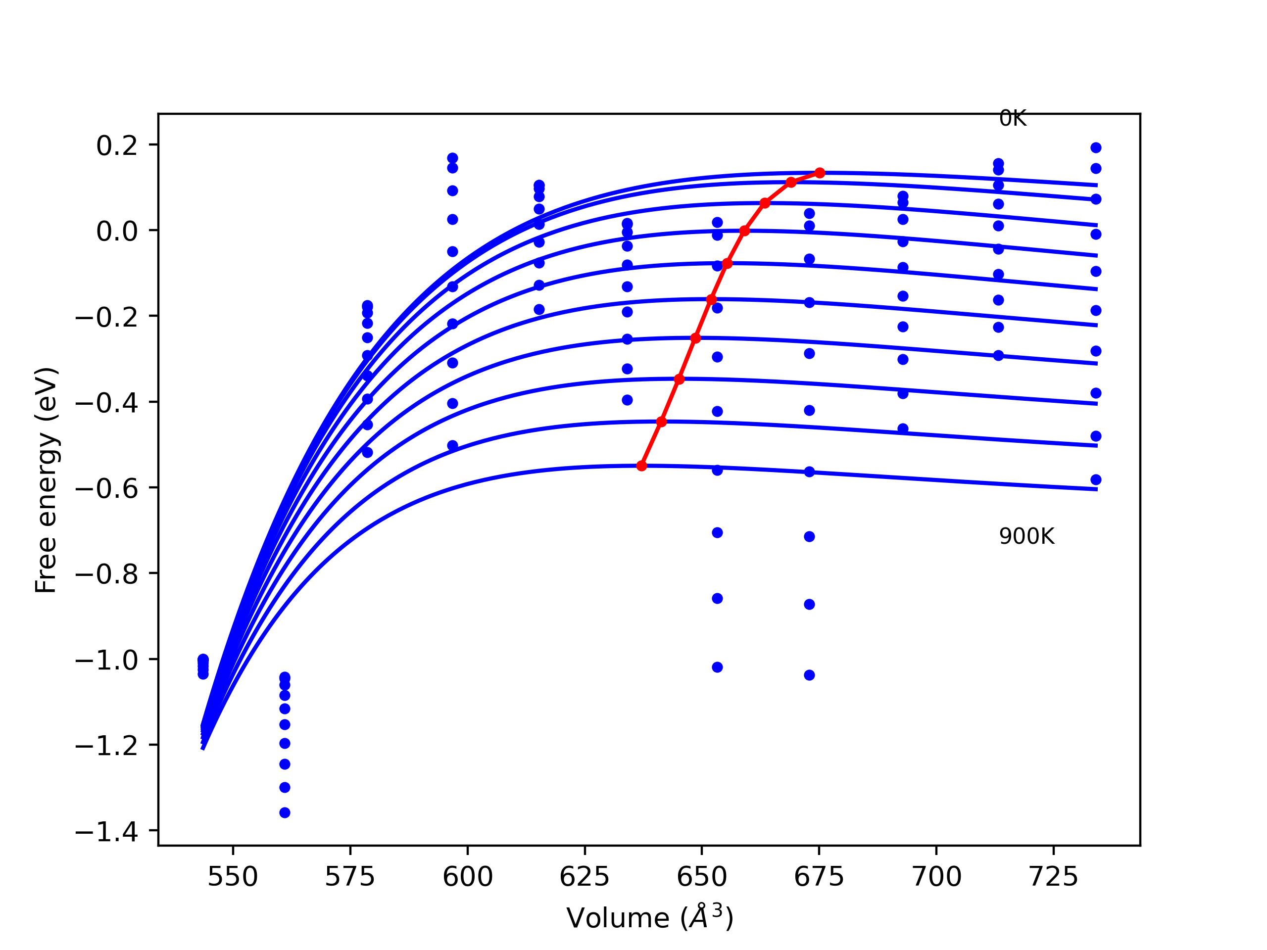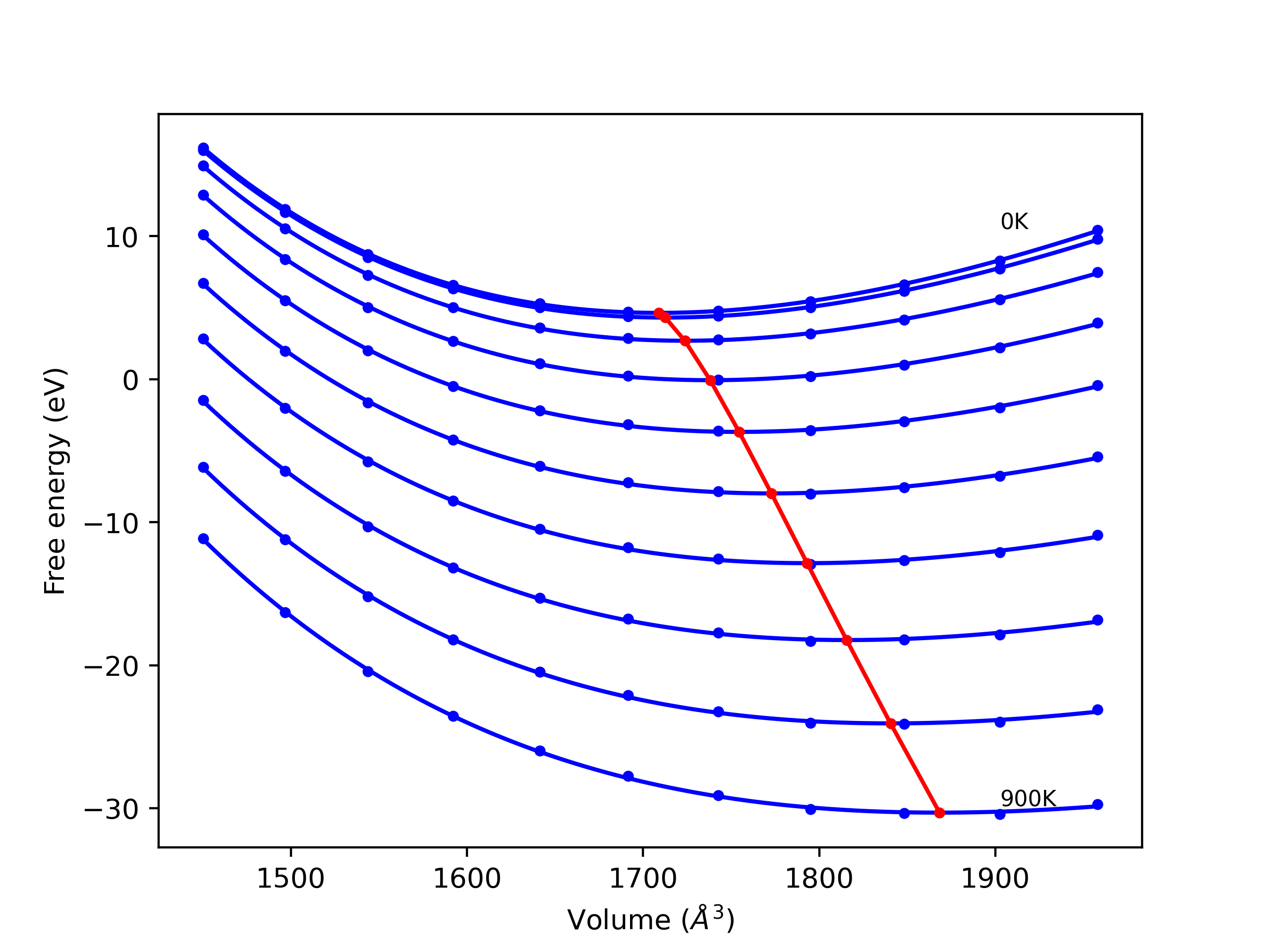 The Gibbs energies of the phases are estimated using thermodynamic integration between the interatomic potential in question and a simpler model with known Gibbs free energy values. For solids, the reference model is an Einstein solid, while for liquids it is the Uhlenbeck-Ford potential. Besides a short run at the start of the solid calculations to estimate Einstein model spring constants, the two calculations proceed similarly. Starting with the final relaxation configurations, the systems are stabilized for 25,000 steps. Then, over the next 50,000 steps the potential is swapped out for the reference potential. The system is then stabilized for another 25,000 steps with the reference model before a reverse swap of 50,000 steps is performed. The simulation ends with one final 25,000 step stabilization period. From the simulation, the irreversible work of transformation is estimated and used to compute the absolute Gibbs free energy of the target phase and potential relative to the reference potential. Entropy is estimated as the difference in enthalpy and Gibbs free energy and divided by temperature.