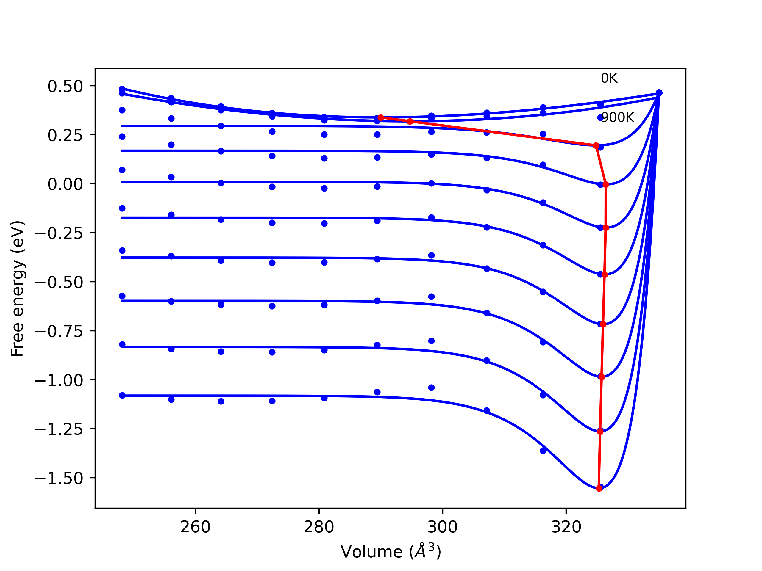 Plots of lattice and elastic constants are shown as a function of temperature. The 0K points were taken from the Crystal Structure Predictions and the Elastic Constants Predictions sections above for the unique crystal structures relaxed with the "dynamic" method. Starting from the 0 K relaxed crystal unit cells, supercell systems are created by replicating all three dimensions by the same multiplier to achieve at least 4000 atoms. The systems are then relaxed at 50 K and zero pressure using 1 million NPT steps. Lattice constants are estimated by averaging the measured box dimensions. Temperatures are iteratively increased by 50 K, with each subsequent relaxation calculation starting from the final atomic configuration at the previous temperature and relaxing for another 1 million steps.