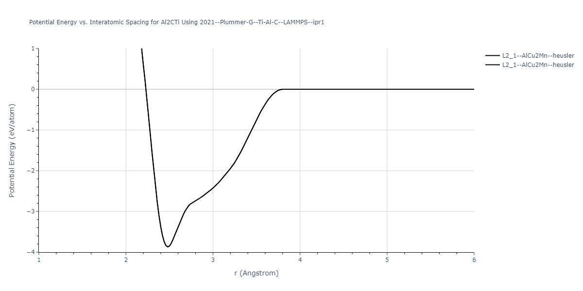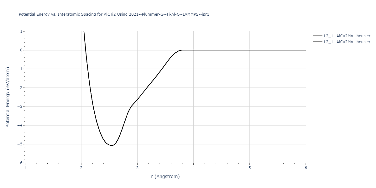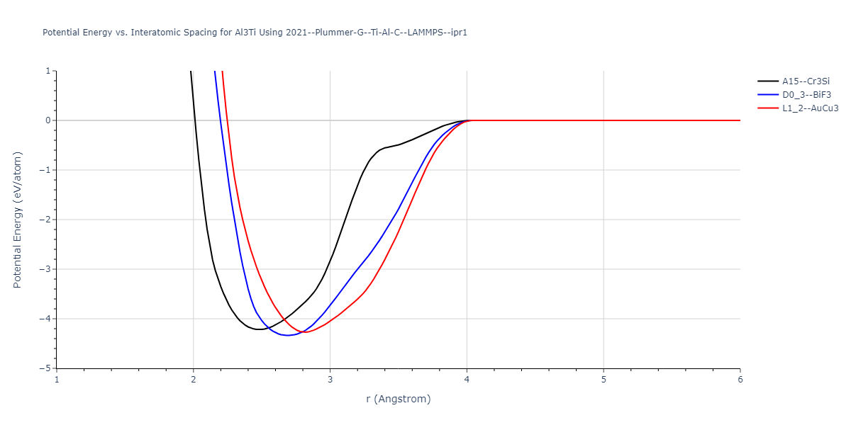 Plots of potential energy vs interatomic spacing, r, are shown below for a number of crystal structures. The structures are generated based on the ideal atomic positions and b/a and c/a lattice parameter ratios for a given crystal prototype. The size of the system is then uniformly scaled, and the energy calculated without relaxing the system. To obtain these plots, values of r are evaluated every 0.02 Å up to 6 Å.