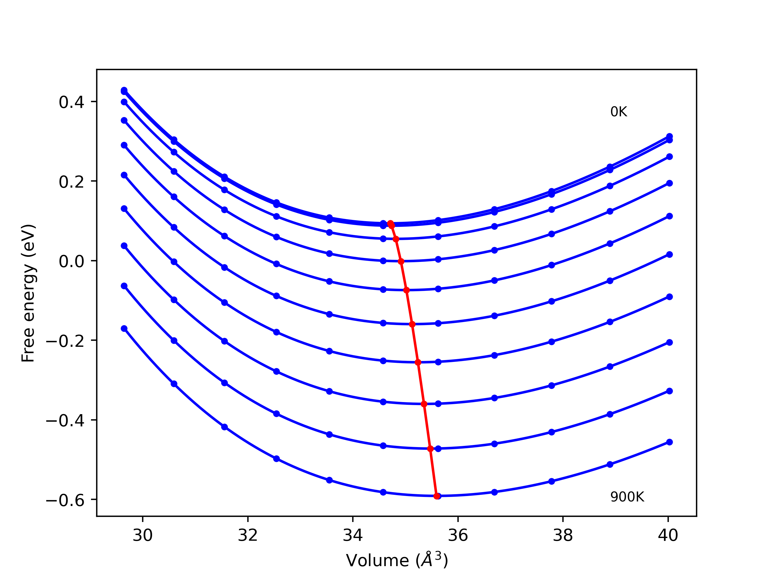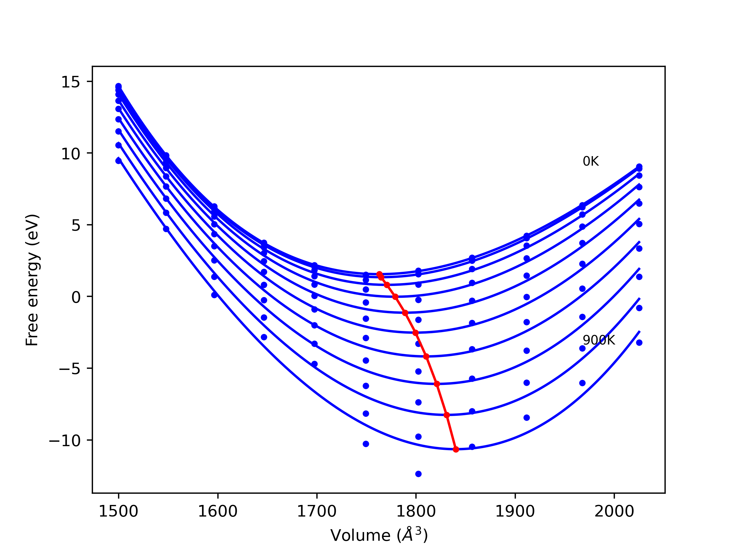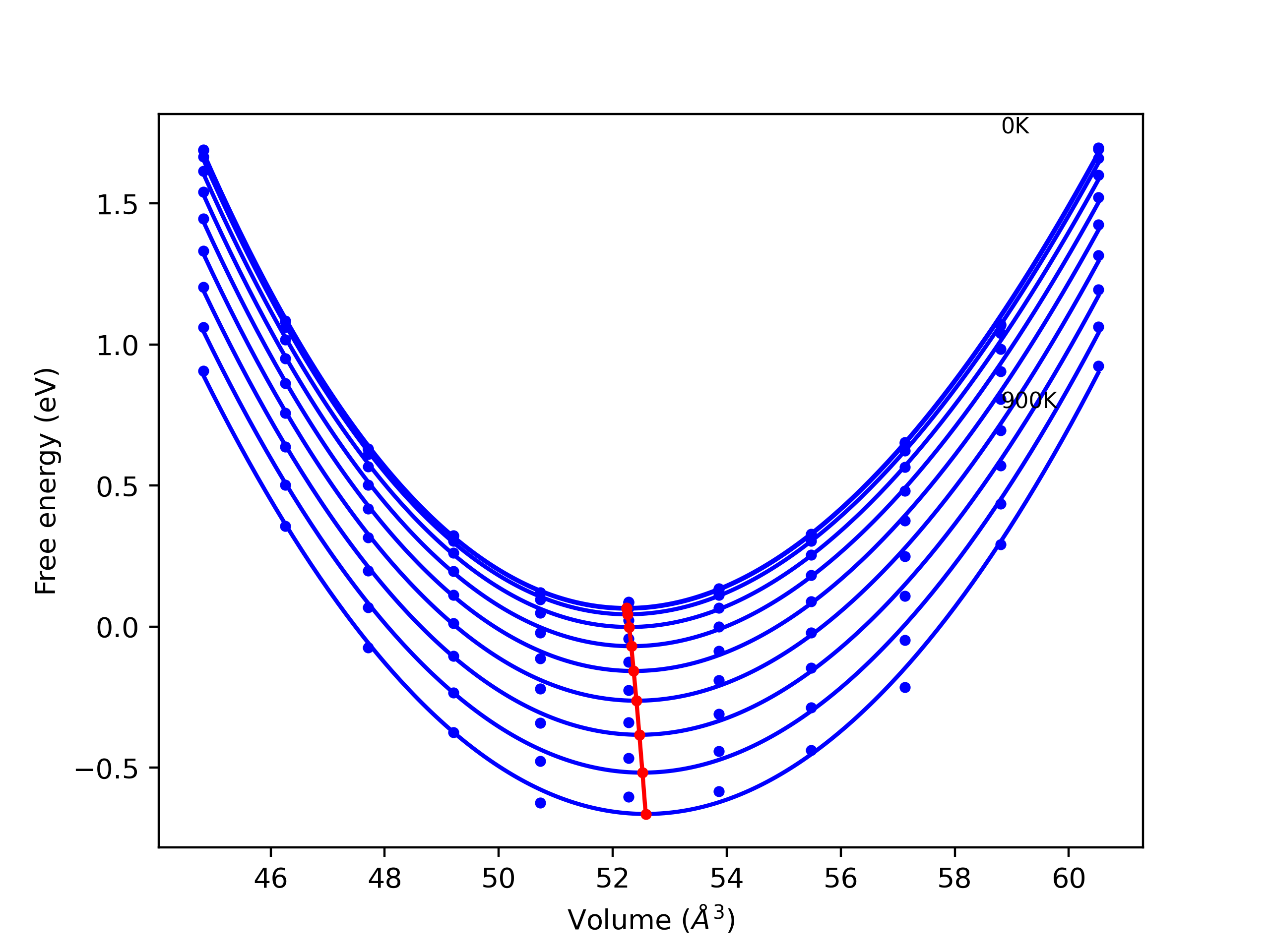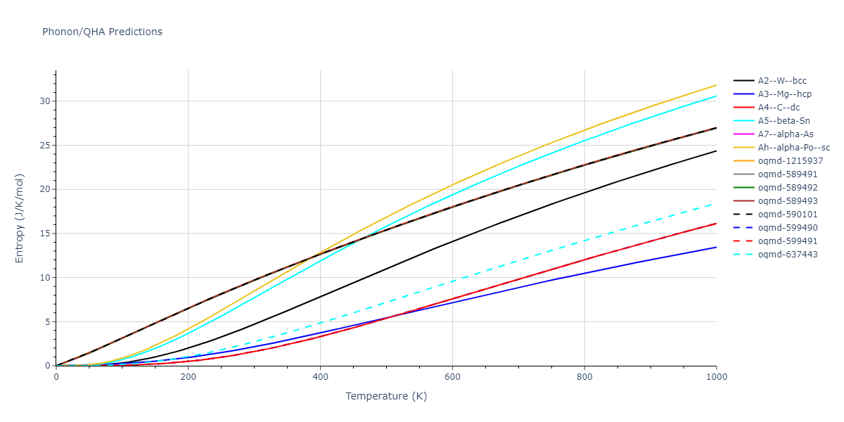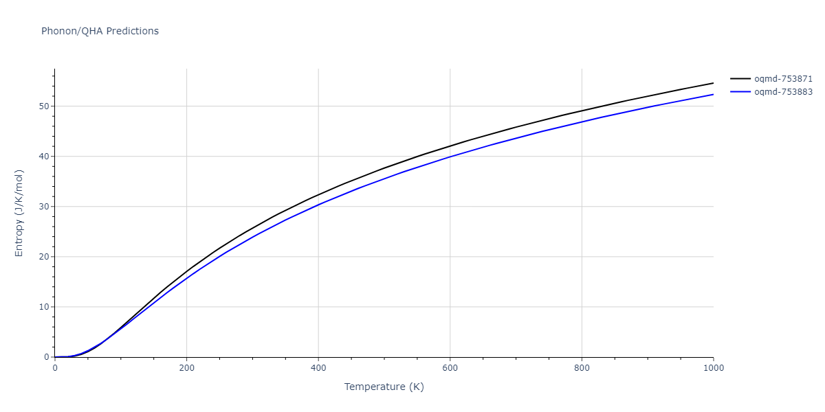 The Gibbs energies of the phases are estimated using thermodynamic integration between the interatomic potential in question and a simpler model with known Gibbs free energy values. For solids, the reference model is an Einstein solid, while for liquids it is the Uhlenbeck-Ford potential. Besides a short run at the start of the solid calculations to estimate Einstein model spring constants, the two calculations proceed similarly. Starting with the final relaxation configurations, the systems are stabilized for 25,000 steps. Then, over the next 50,000 steps the potential is swapped out for the reference potential. The system is then stabilized for another 25,000 steps with the reference model before a reverse swap of 50,000 steps is performed. The simulation ends with one final 25,000 step stabilization period. From the simulation, the irreversible work of transformation is estimated and used to compute the absolute Gibbs free energy of the target phase and potential relative to the reference potential. Entropy is estimated as the difference in enthalpy and Gibbs free energy and divided by temperature.