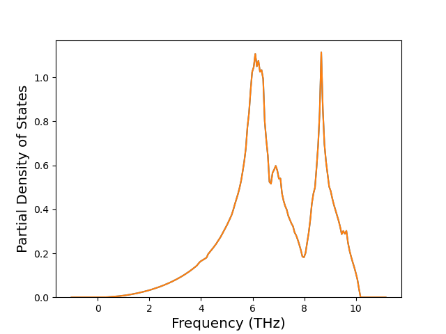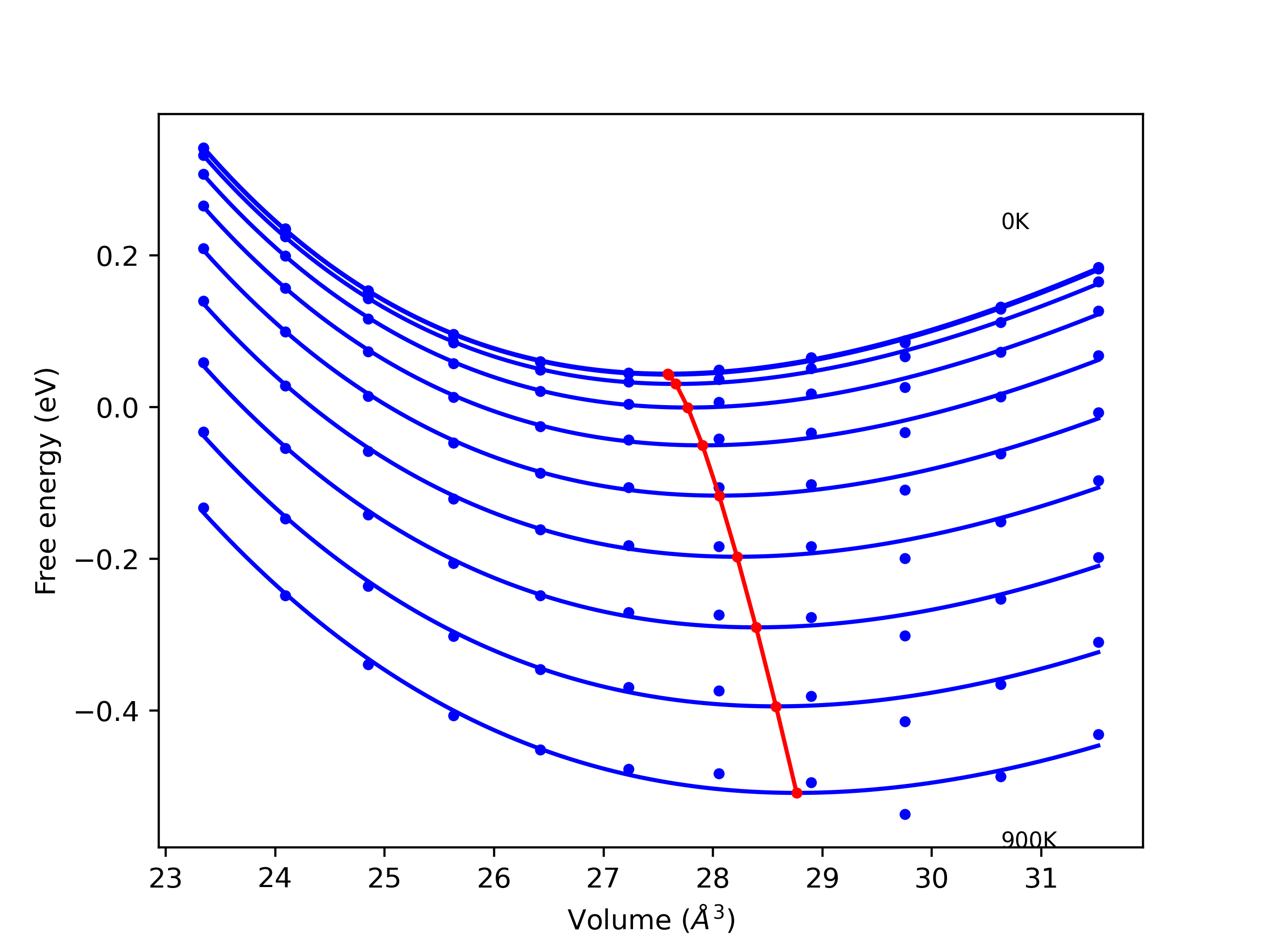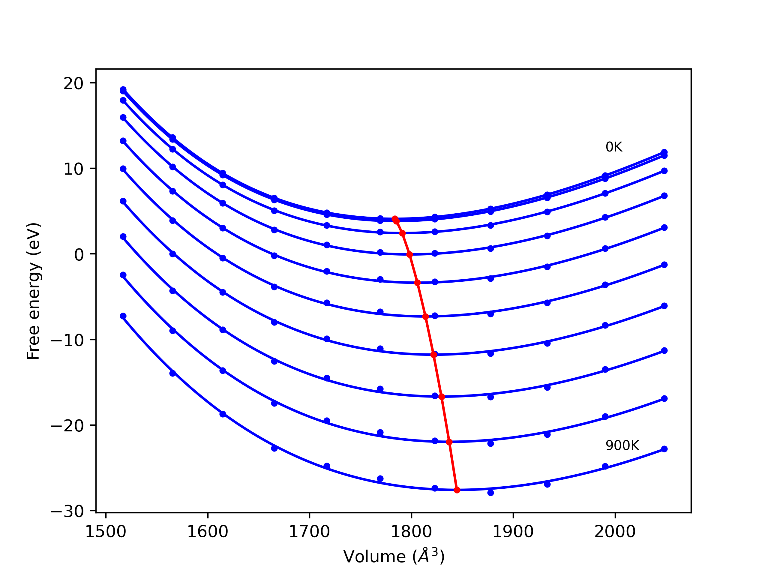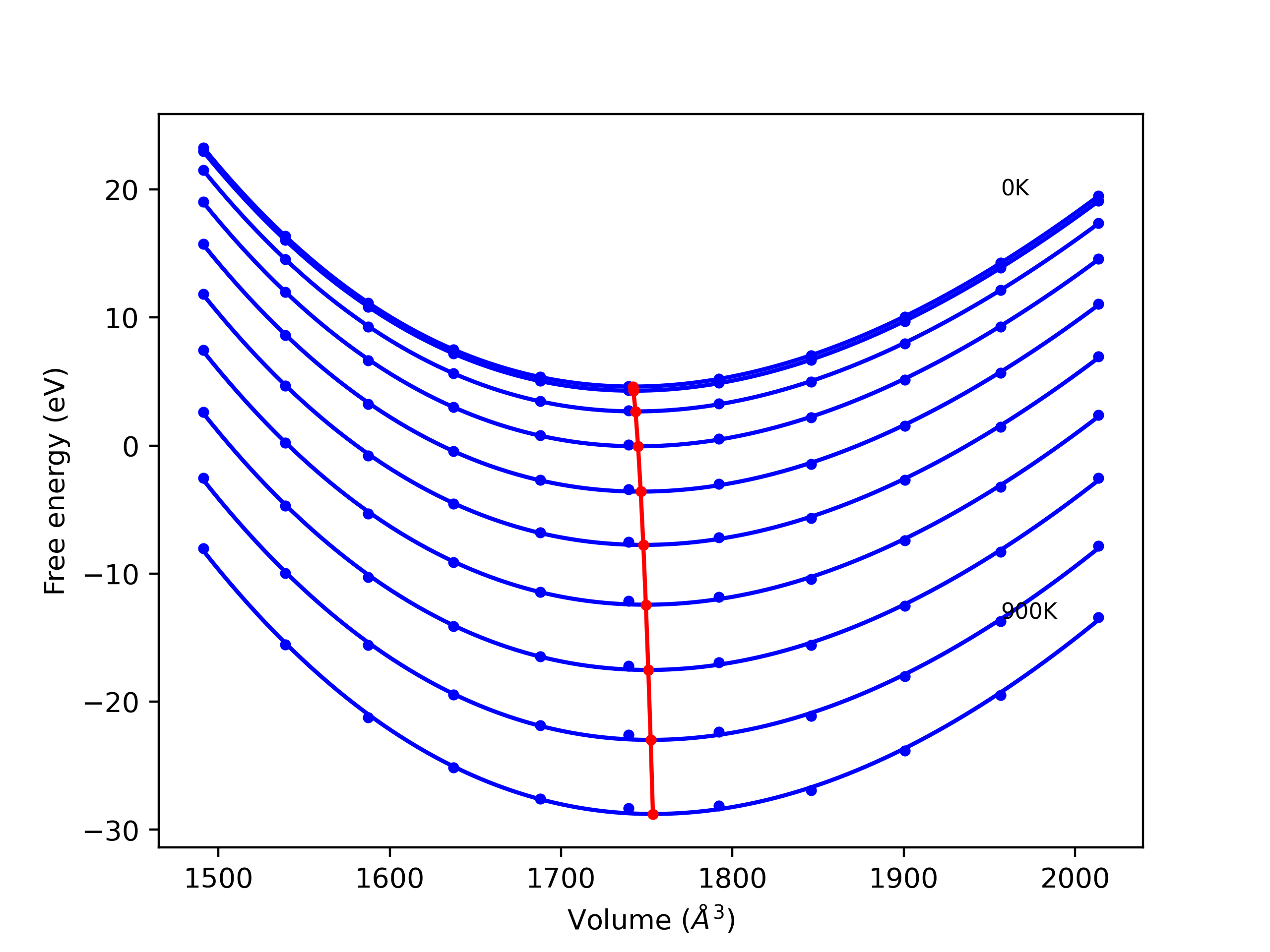 The Gibbs energies of the phases are estimated using thermodynamic integration between the interatomic potential in question and a simpler model with known Gibbs free energy values. For solids, the reference model is an Einstein solid, while for liquids it is the Uhlenbeck-Ford potential. Besides a short run at the start of the solid calculations to estimate Einstein model spring constants, the two calculations proceed similarly. Starting with the final relaxation configurations, the systems are stabilized for 25,000 steps. Then, over the next 50,000 steps the potential is swapped out for the reference potential. The system is then stabilized for another 25,000 steps with the reference model before a reverse swap of 50,000 steps is performed. The simulation ends with one final 25,000 step stabilization period. From the simulation, the irreversible work of transformation is estimated and used to compute the absolute Gibbs free energy of the target phase and potential relative to the reference potential. Entropy is estimated as the difference in enthalpy and Gibbs free energy and divided by temperature.