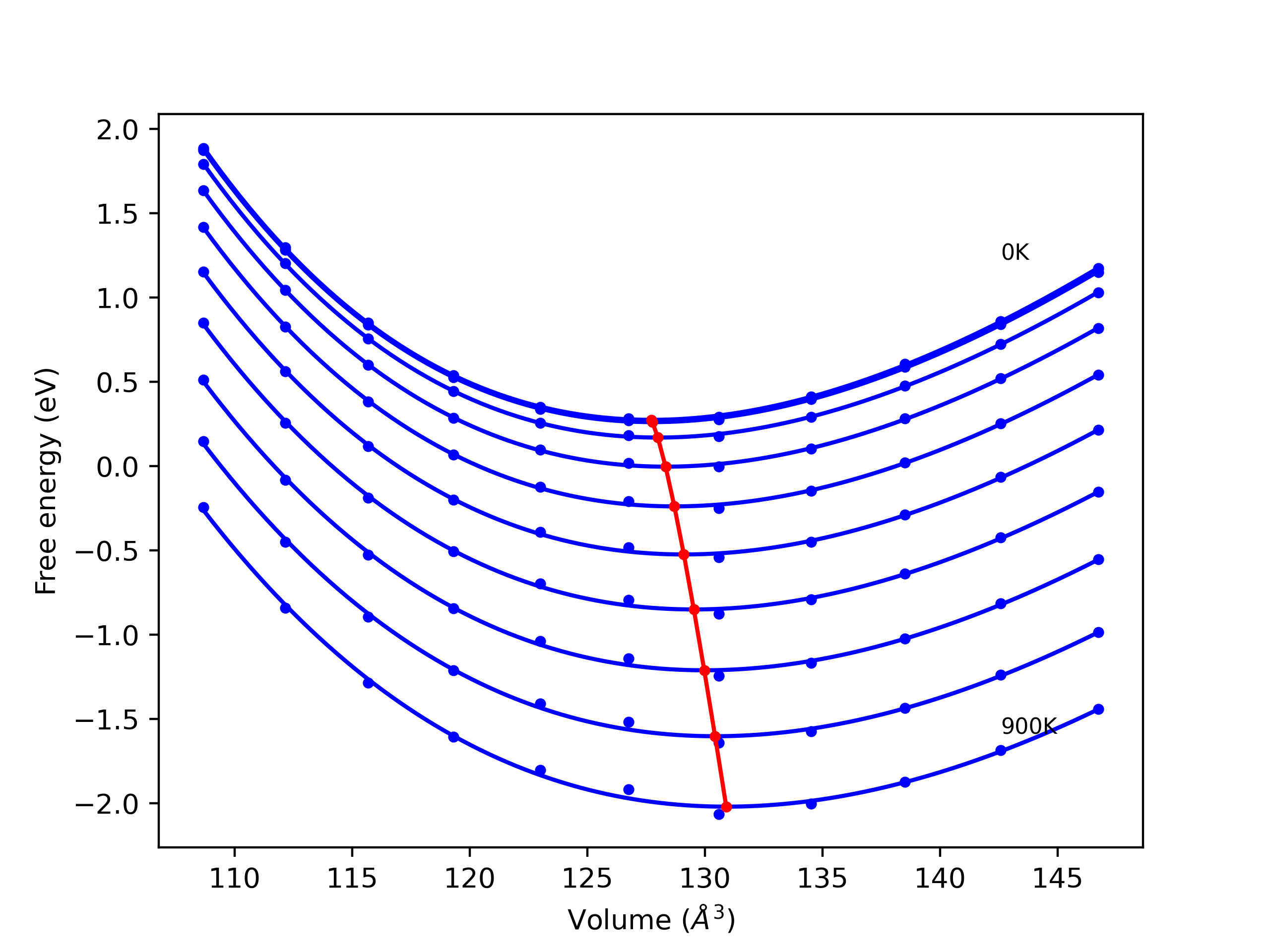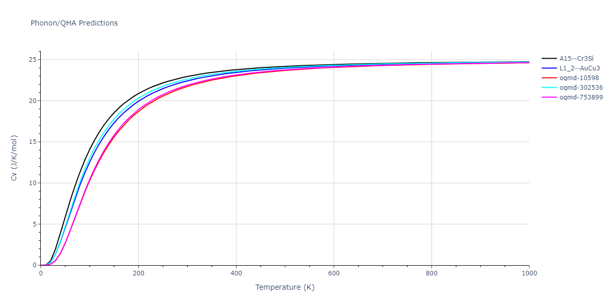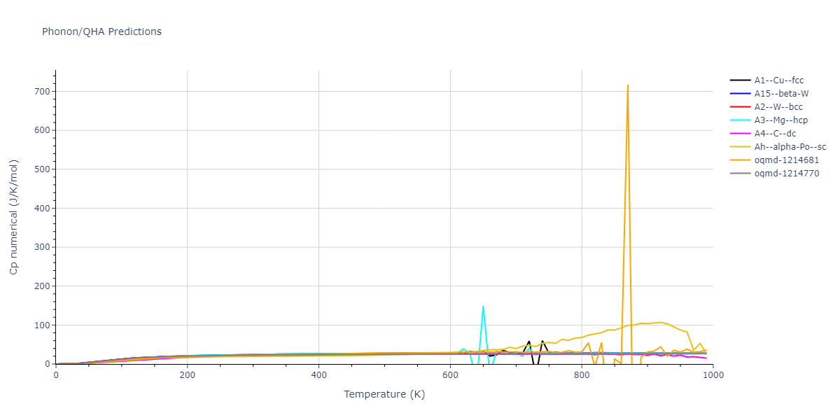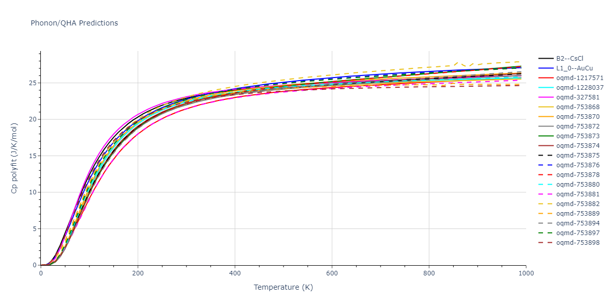 Plots of internal energy, Gibbs free energy, entropy, heat capacity and volume are shown here as a function of temperature for various crystal structures and liquid phases. The included crystal structures correspond to those in the Solid Structures vs. Temperature section, and the liquid phases to those in the Liquid Properties section. Internal energy and volume are taken from the associated structure relaxations mentioned in those previous sections. Constant pressure heat capacity is estimated using 3-point numerical derivatives of enthalpy versus temperature. Note that since all simulations done here are at 0 pressure, internal energy and enthalpy are equivalent.