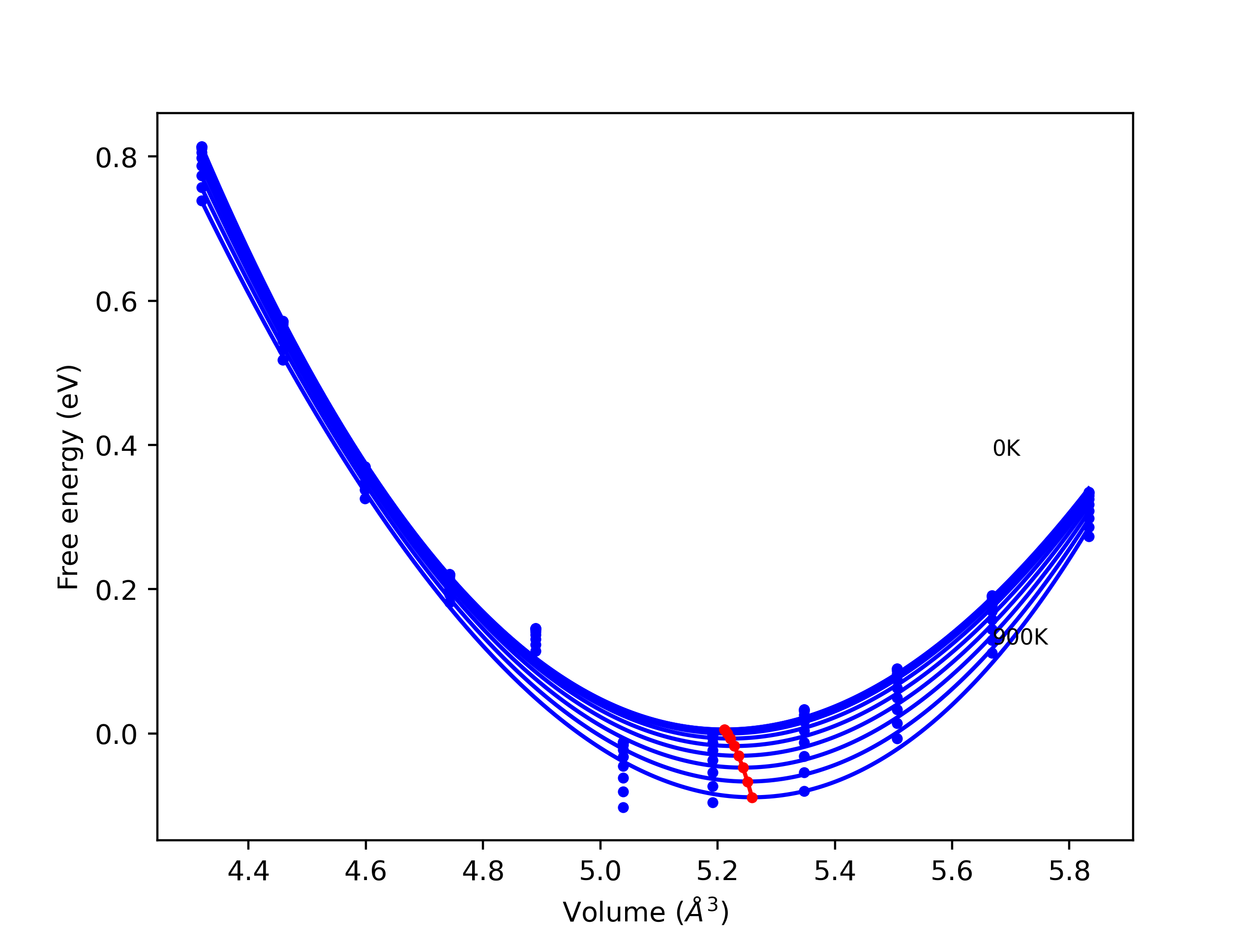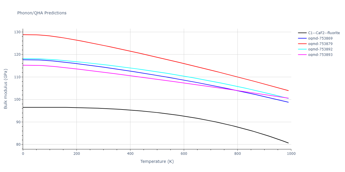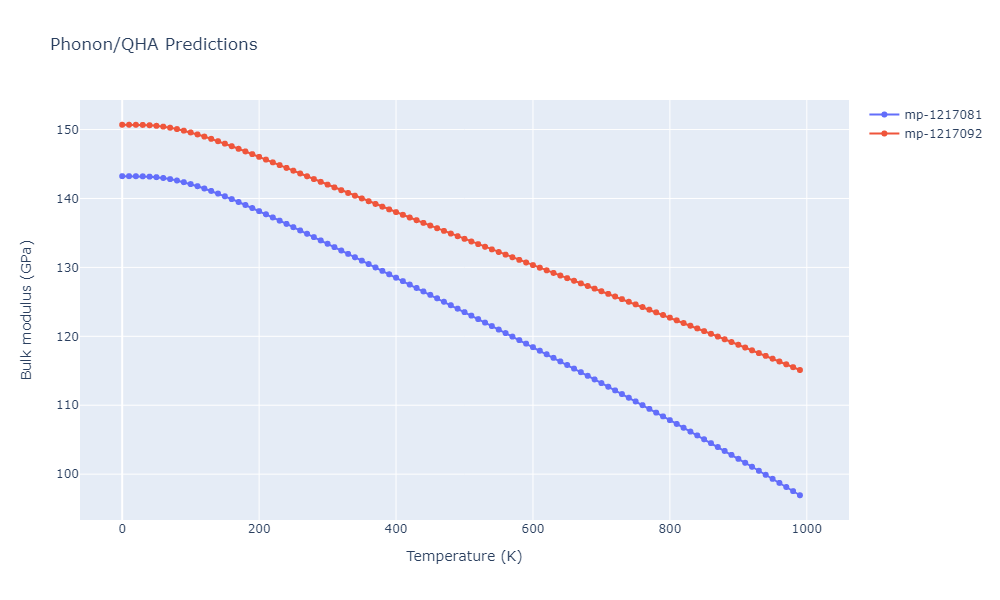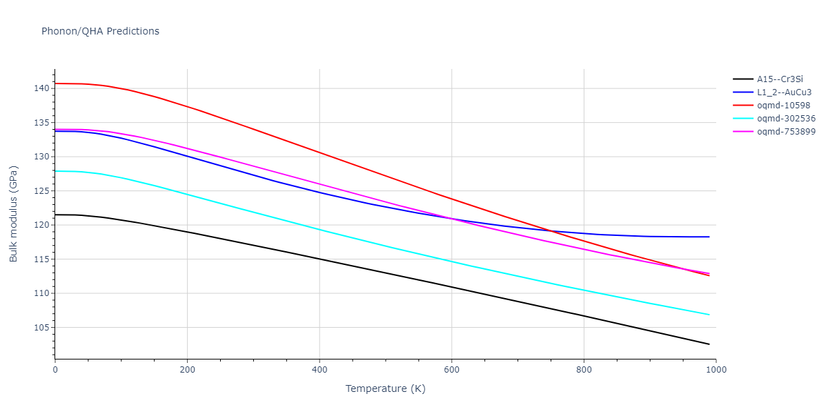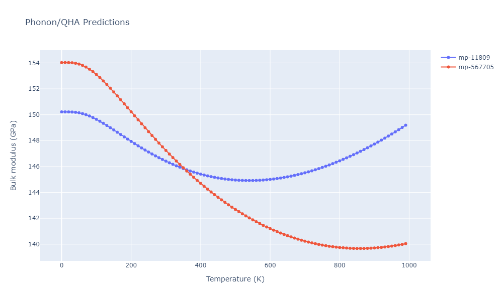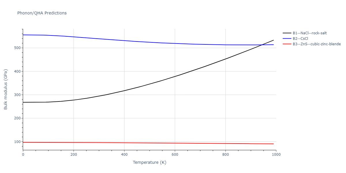 Plots of lattice and elastic constants are shown as a function of temperature. The 0K points were taken from the Crystal Structure Predictions and the Elastic Constants Predictions sections above for the unique crystal structures relaxed with the "dynamic" method. Starting from the 0 K relaxed crystal unit cells, supercell systems are created by replicating all three dimensions by the same multiplier to achieve at least 4000 atoms. The systems are then relaxed at 50 K and zero pressure using 1 million NPT steps. Lattice constants are estimated by averaging the measured box dimensions. Temperatures are iteratively increased by 50 K, with each subsequent relaxation calculation starting from the final atomic configuration at the previous temperature and relaxing for another 1 million steps.