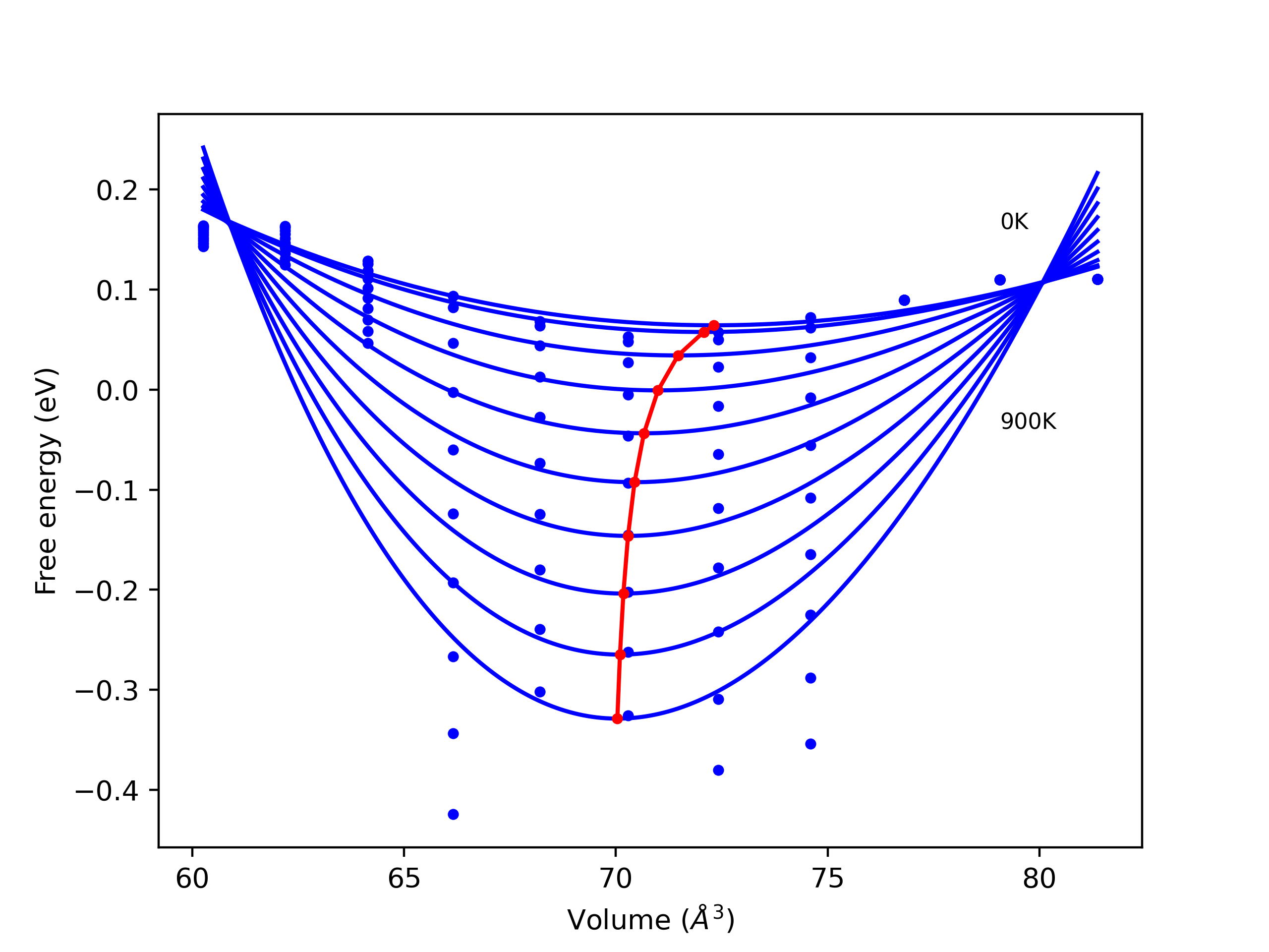 The Gibbs energies of the phases are estimated using thermodynamic integration between the interatomic potential in question and a simpler model with known Gibbs free energy values. For solids, the reference model is an Einstein solid, while for liquids it is the Uhlenbeck-Ford potential. Besides a short run at the start of the solid calculations to estimate Einstein model spring constants, the two calculations proceed similarly. Starting with the final relaxation configurations, the systems are stabilized for 25,000 steps. Then, over the next 50,000 steps the potential is swapped out for the reference potential. The system is then stabilized for another 25,000 steps with the reference model before a reverse swap of 50,000 steps is performed. The simulation ends with one final 25,000 step stabilization period. From the simulation, the irreversible work of transformation is estimated and used to compute the absolute Gibbs free energy of the target phase and potential relative to the reference potential. Entropy is estimated as the difference in enthalpy and Gibbs free energy and divided by temperature.