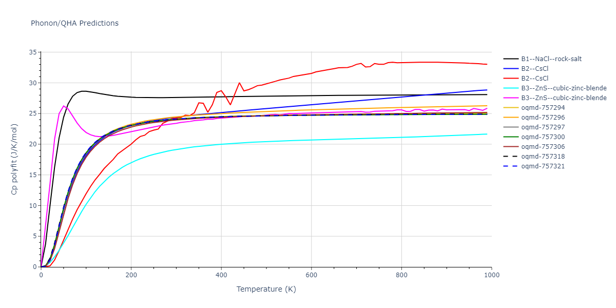 Plots of internal energy, Gibbs free energy, entropy, heat capacity and volume are shown here as a function of temperature for various crystal structures and liquid phases. The included crystal structures correspond to those in the Solid Structures vs. Temperature section, and the liquid phases to those in the Liquid Properties section. Internal energy and volume are taken from the associated structure relaxations mentioned in those previous sections. Constant pressure heat capacity is estimated using 3-point numerical derivatives of enthalpy versus temperature. Note that since all simulations done here are at 0 pressure, internal energy and enthalpy are equivalent.