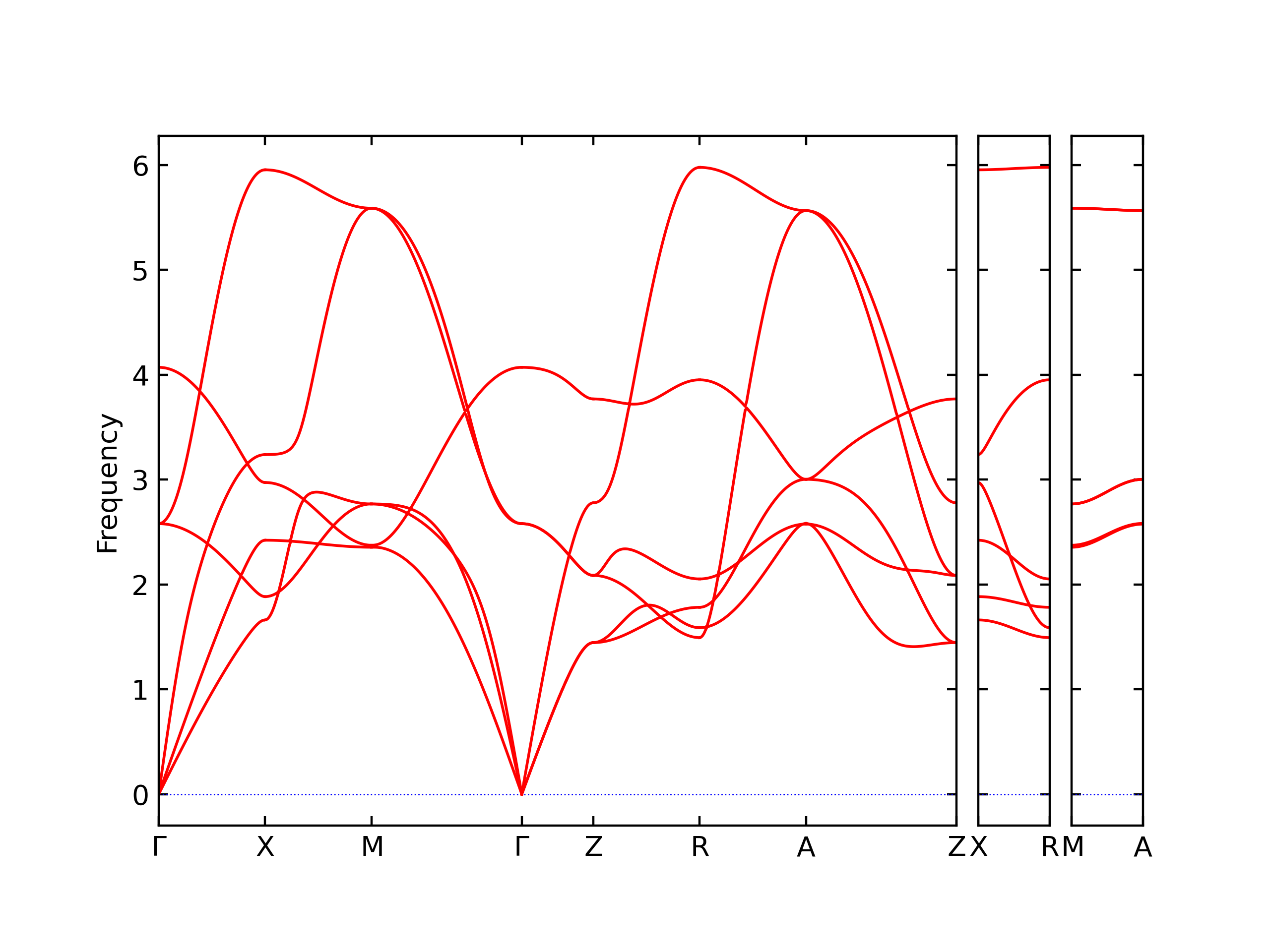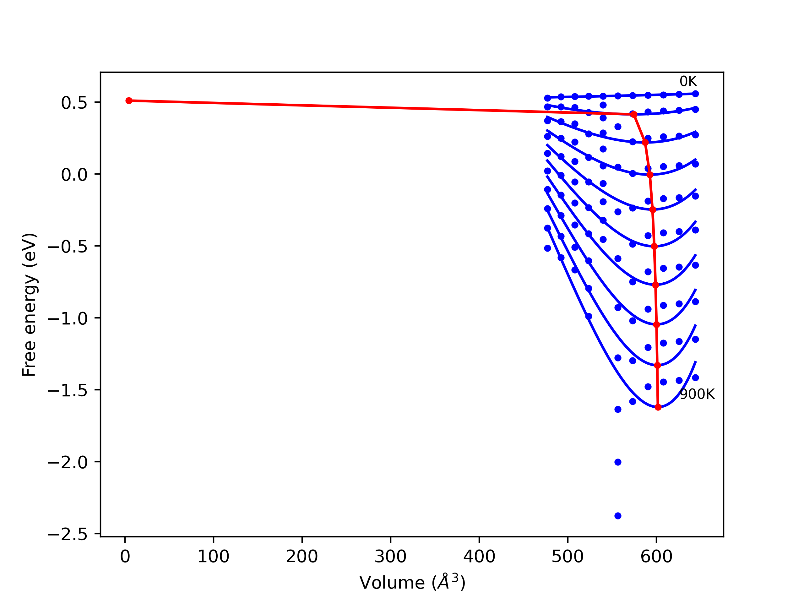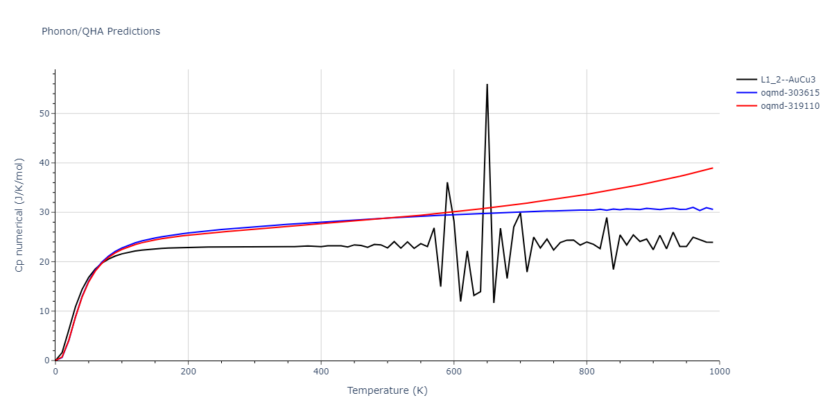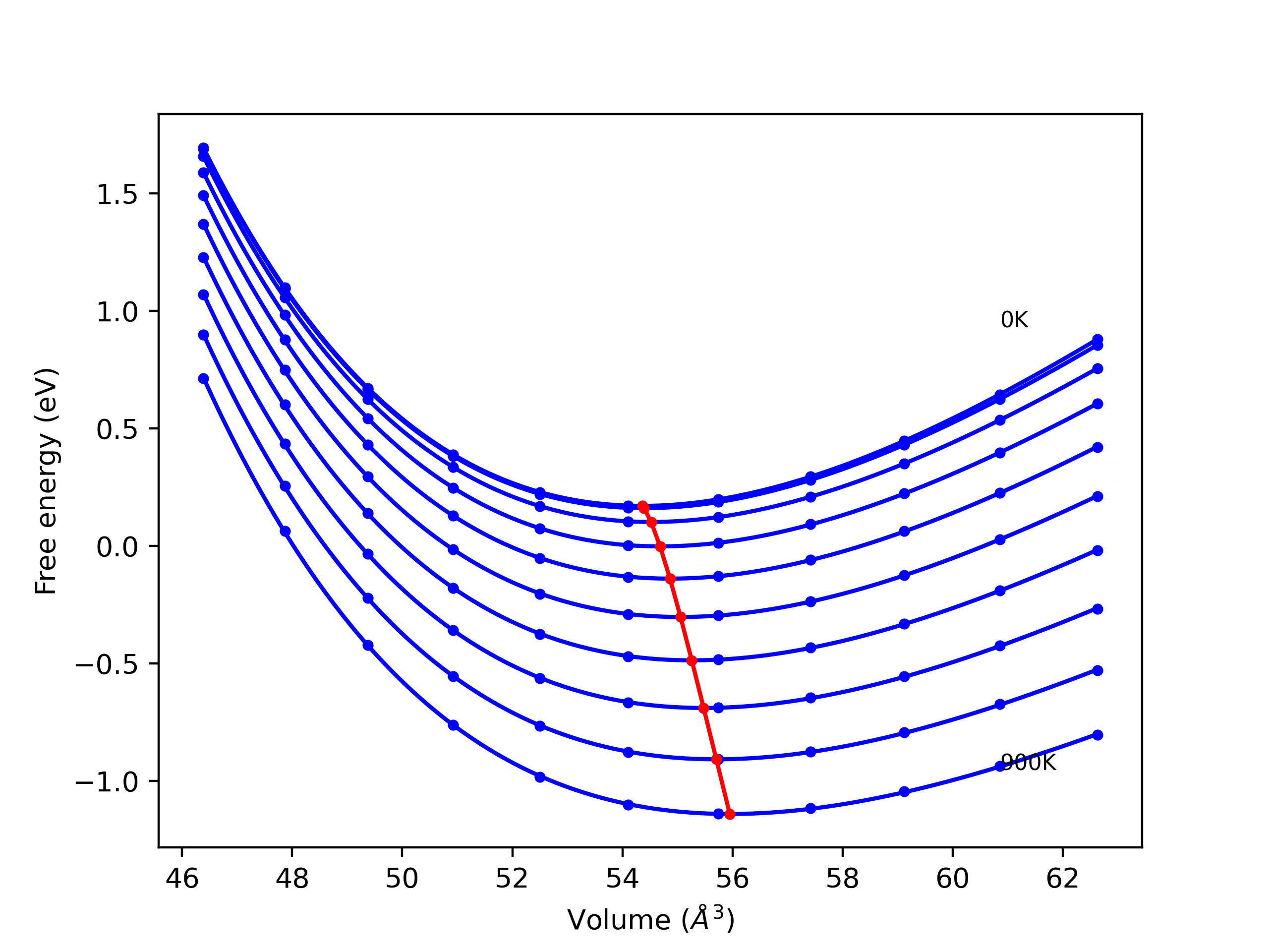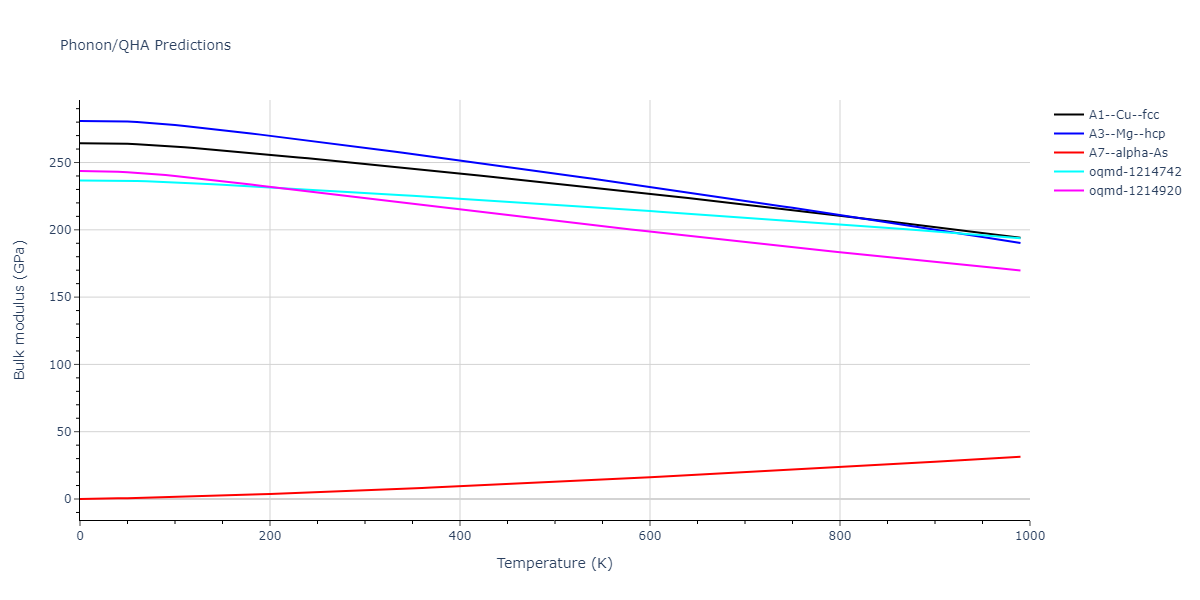Phonon band structures and crystal properties estimated from quasi-harmonic approximation (QHA) calculations are displayed for select crystals. The calculations were performed using phonopy and LAMMPS. For the phonon calculations, 3x3 supercells of the potential-specific relaxed crystals were used. The QHA calculations were based on 11 strain states ranging from -0.05 to 0.05.