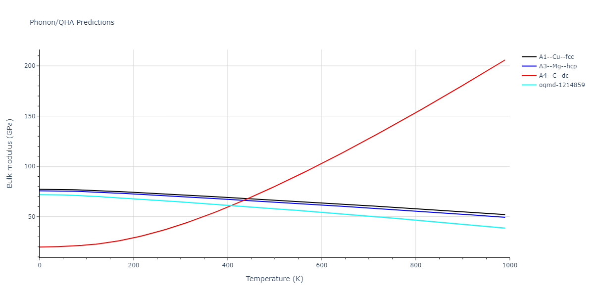 Phonon band structures and crystal properties estimated from quasi-harmonic approximation (QHA) calculations are displayed for select crystals. The calculations were performed using phonopy and LAMMPS. For the phonon calculations, 3x3 supercells of the potential-specific relaxed crystals were used. The QHA calculations were based on 11 strain states ranging from -0.05 to 0.05.