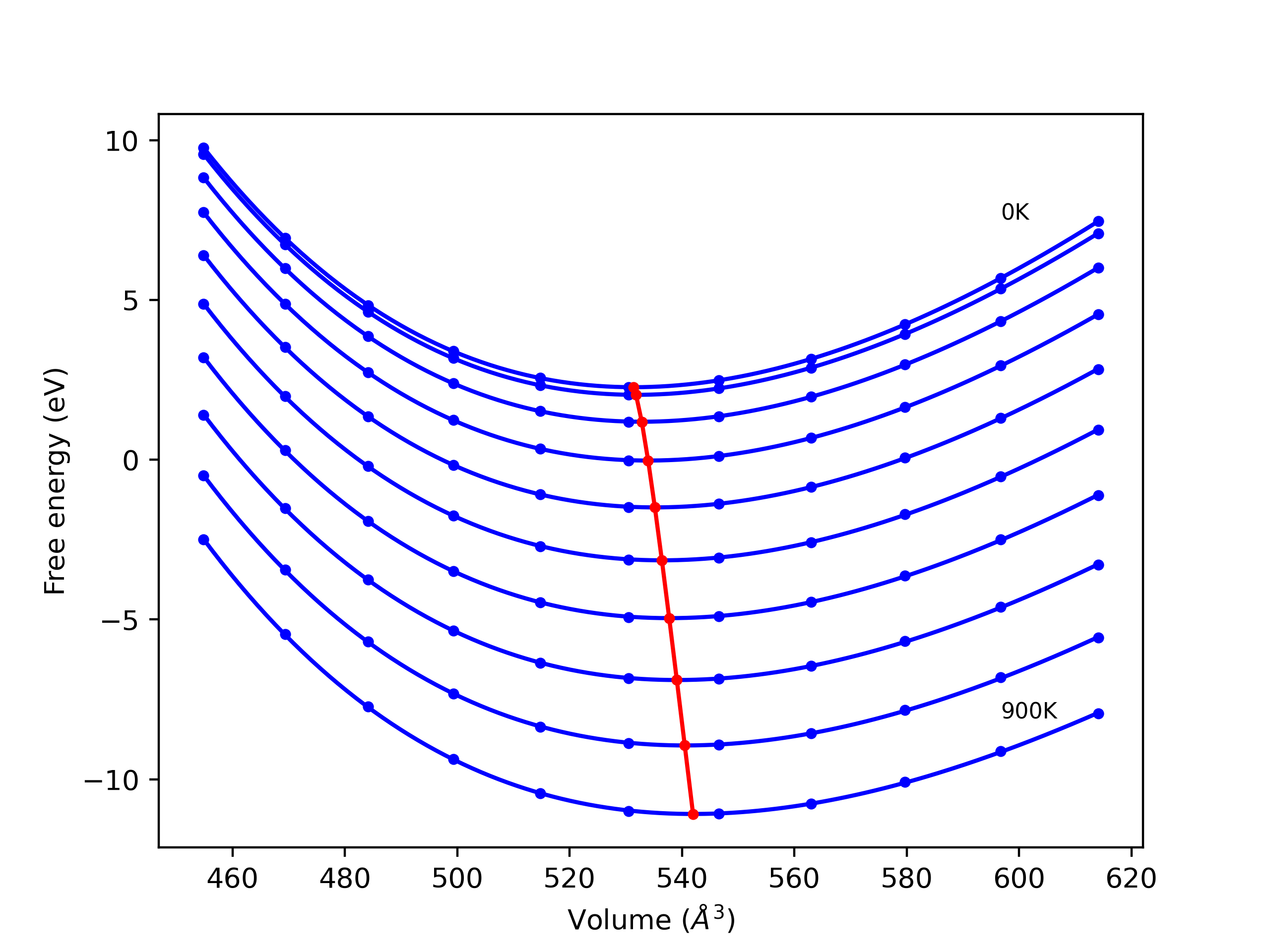Plots of lattice and elastic constants are shown as a function of temperature. The 0K points were taken from the Crystal Structure Predictions and the Elastic Constants Predictions sections above for the unique crystal structures relaxed with the "dynamic" method. Starting from the 0 K relaxed crystal unit cells, supercell systems are created by replicating all three dimensions by the same multiplier to achieve at least 4000 atoms. The systems are then relaxed at 50 K and zero pressure using 1 million NPT steps. Lattice constants are estimated by averaging the measured box dimensions. Temperatures are iteratively increased by 50 K, with each subsequent relaxation calculation starting from the final atomic configuration at the previous temperature and relaxing for another 1 million steps.