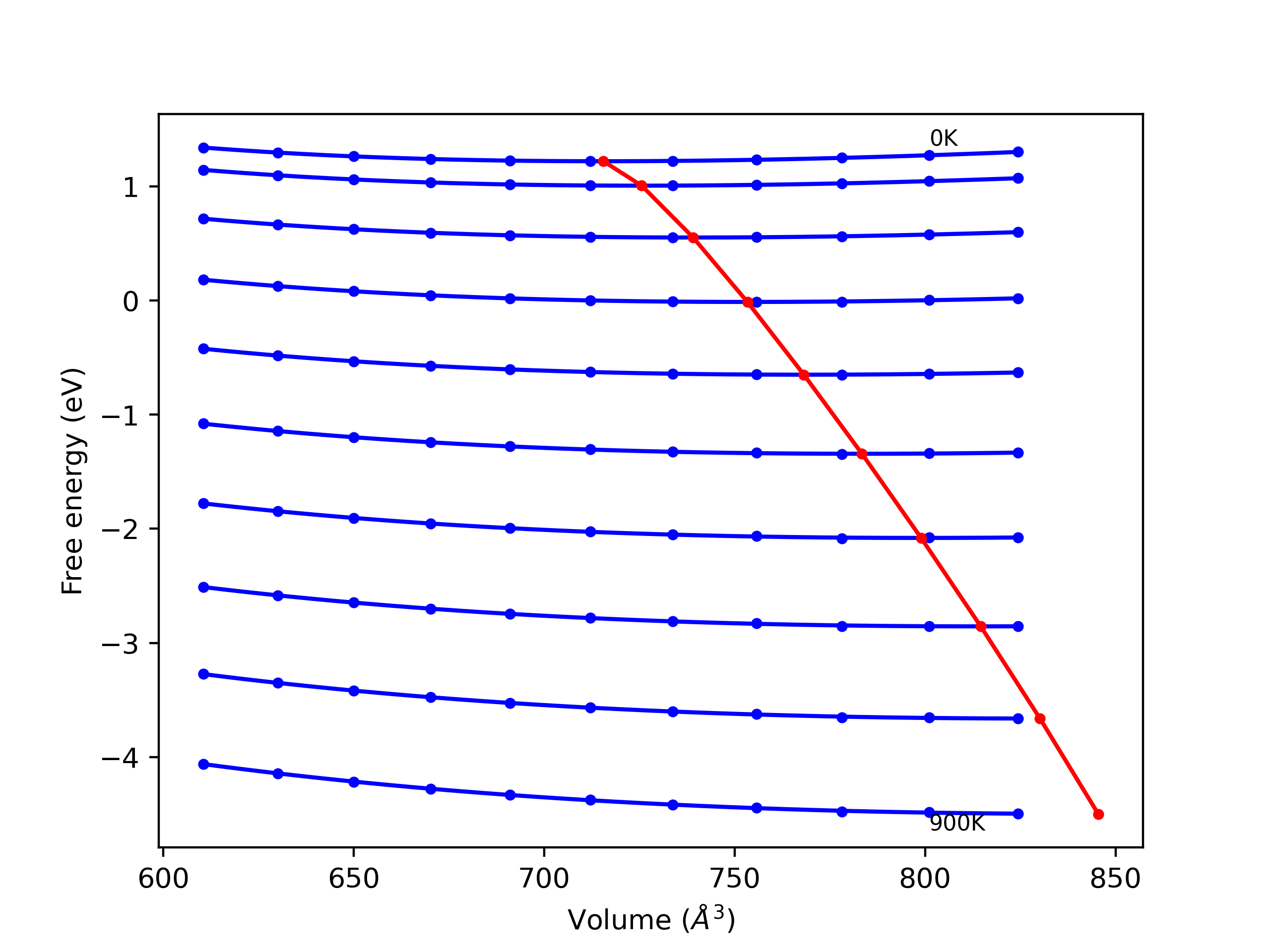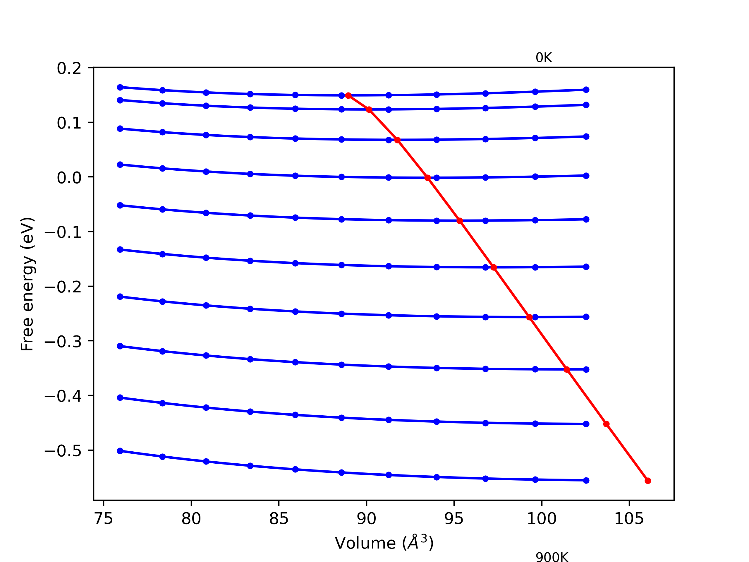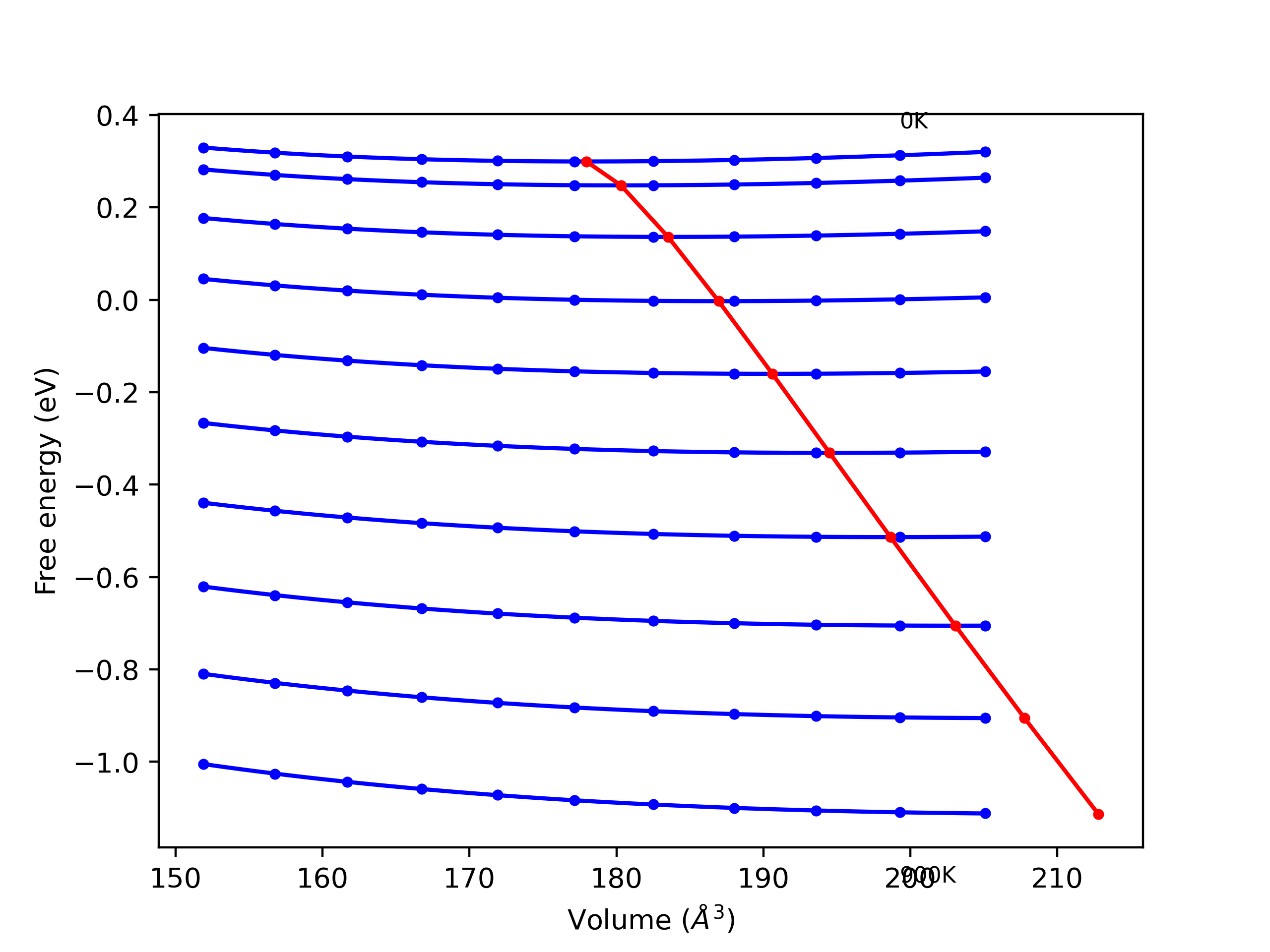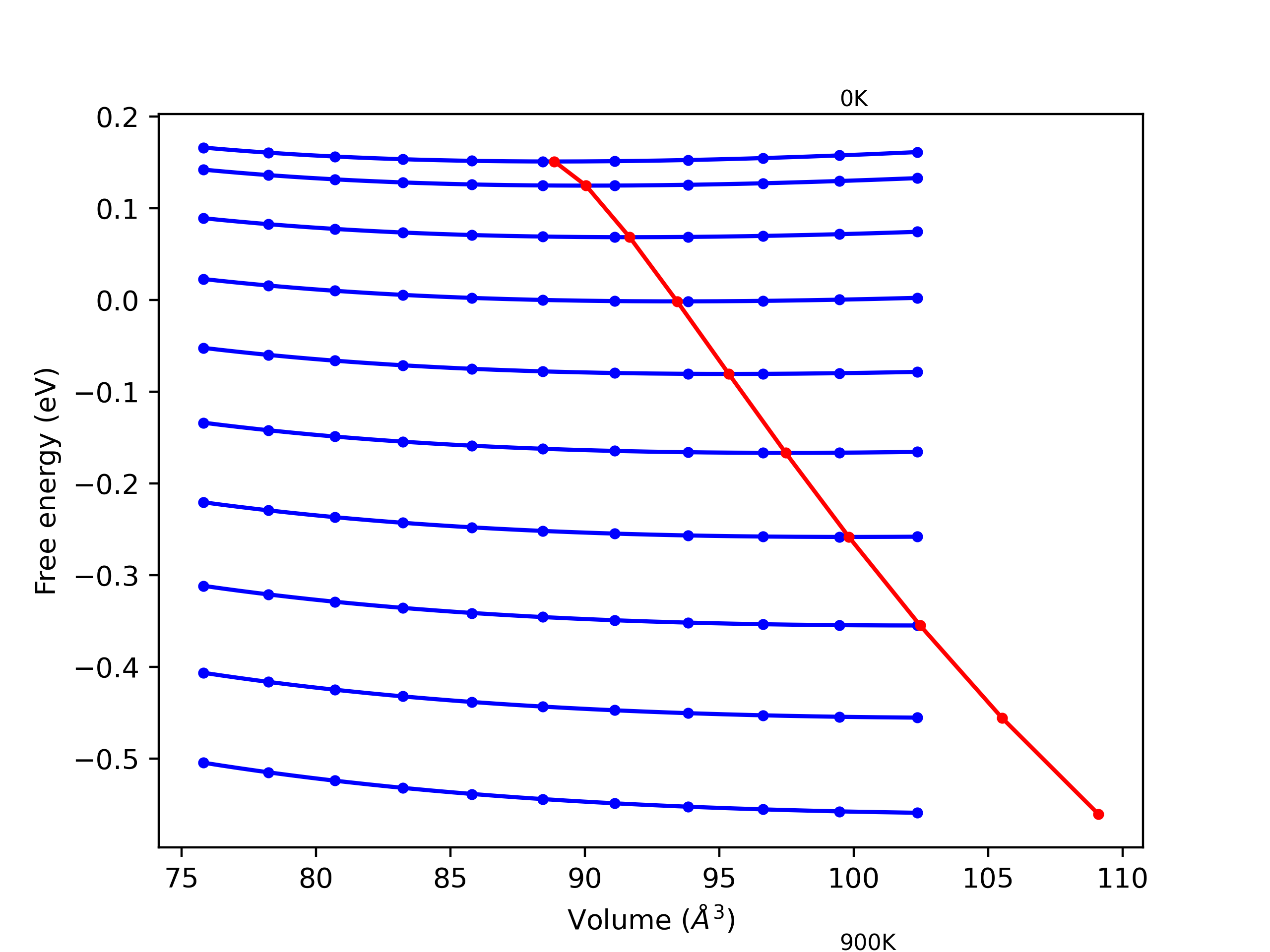 Phonon band structures and crystal properties estimated from quasi-harmonic approximation (QHA) calculations are displayed for select crystals. The calculations were performed using phonopy and LAMMPS. For the phonon calculations, 3x3 supercells of the potential-specific relaxed crystals were used. The QHA calculations were based on 11 strain states ranging from -0.05 to 0.05.