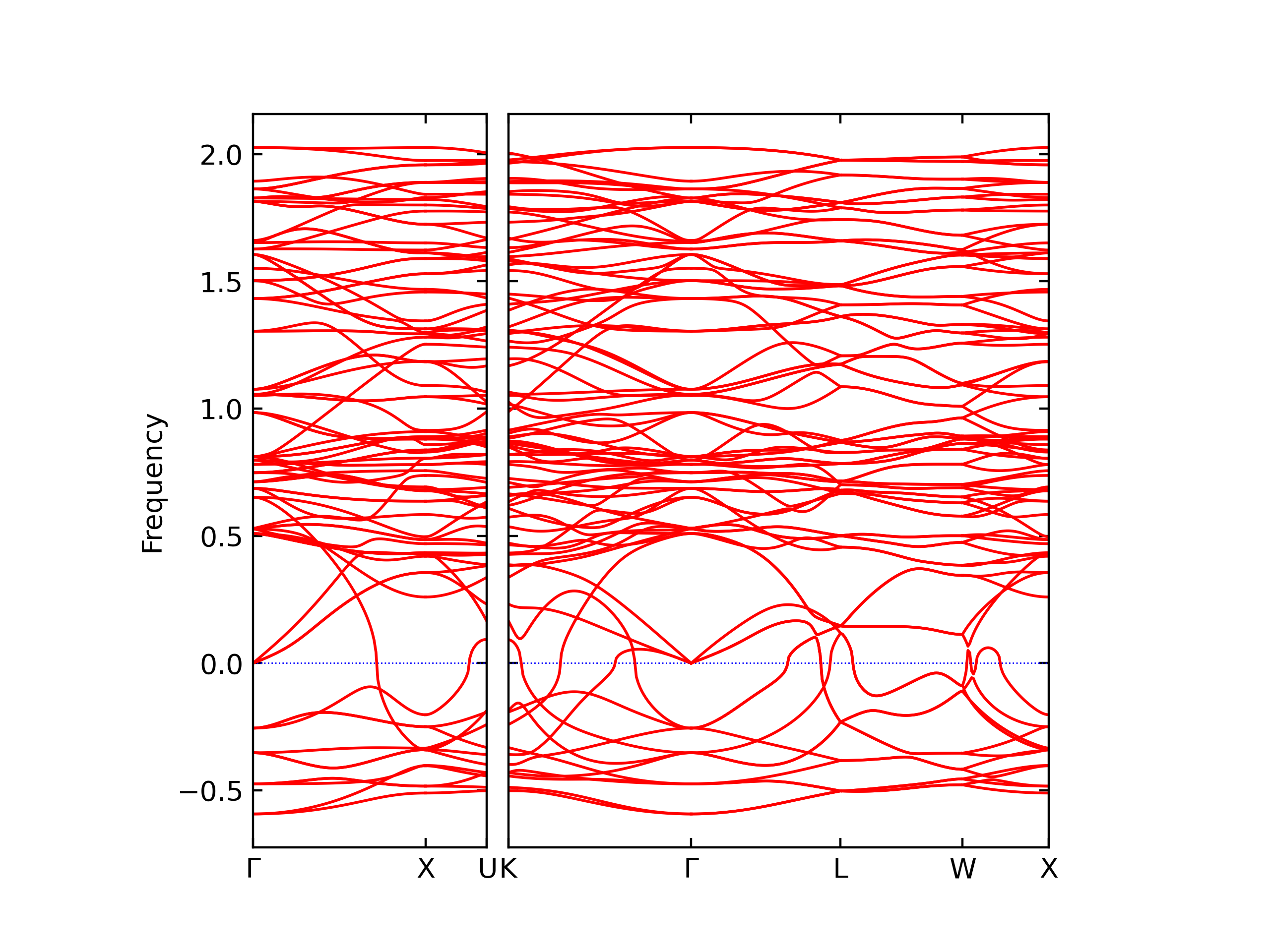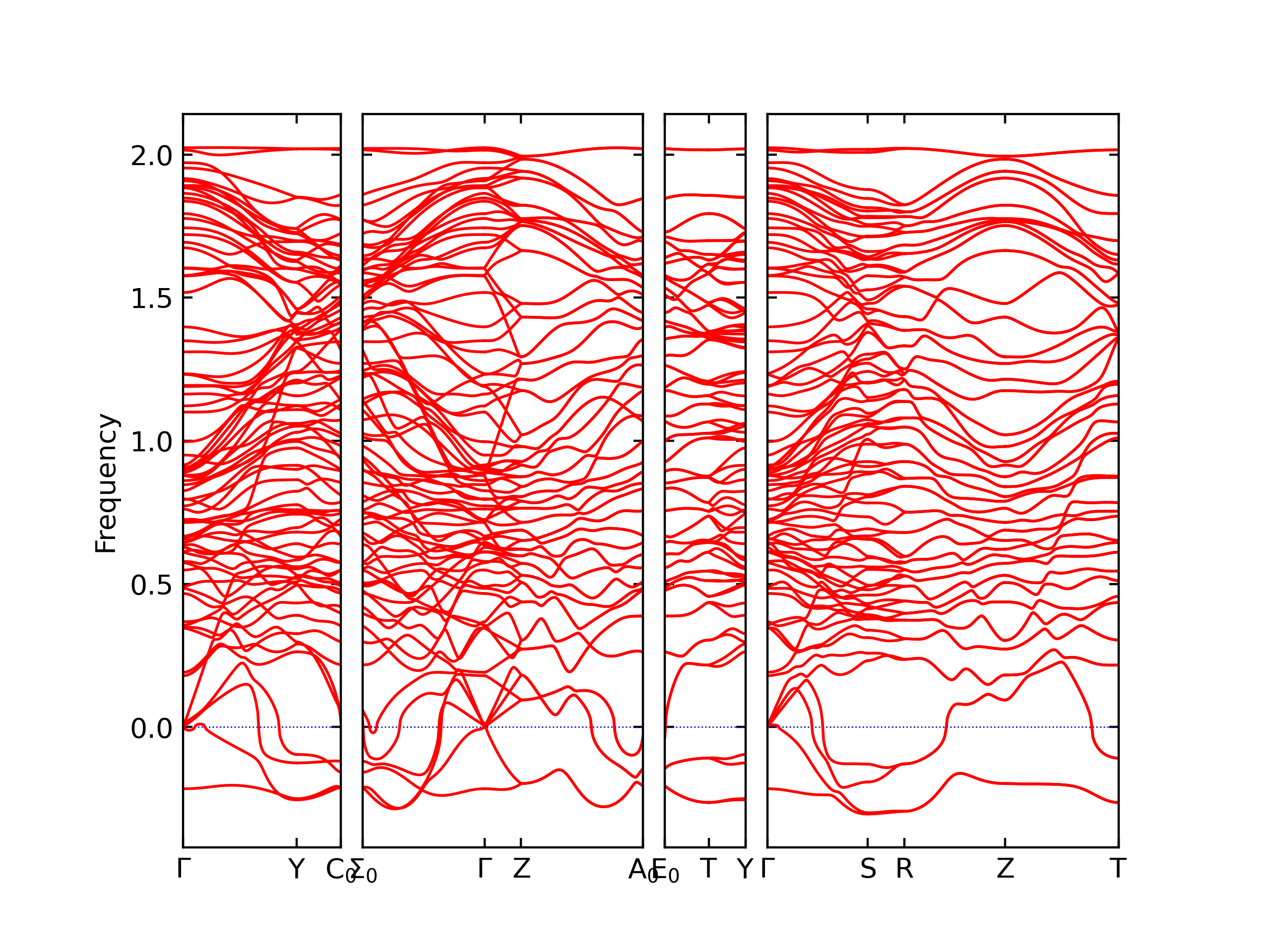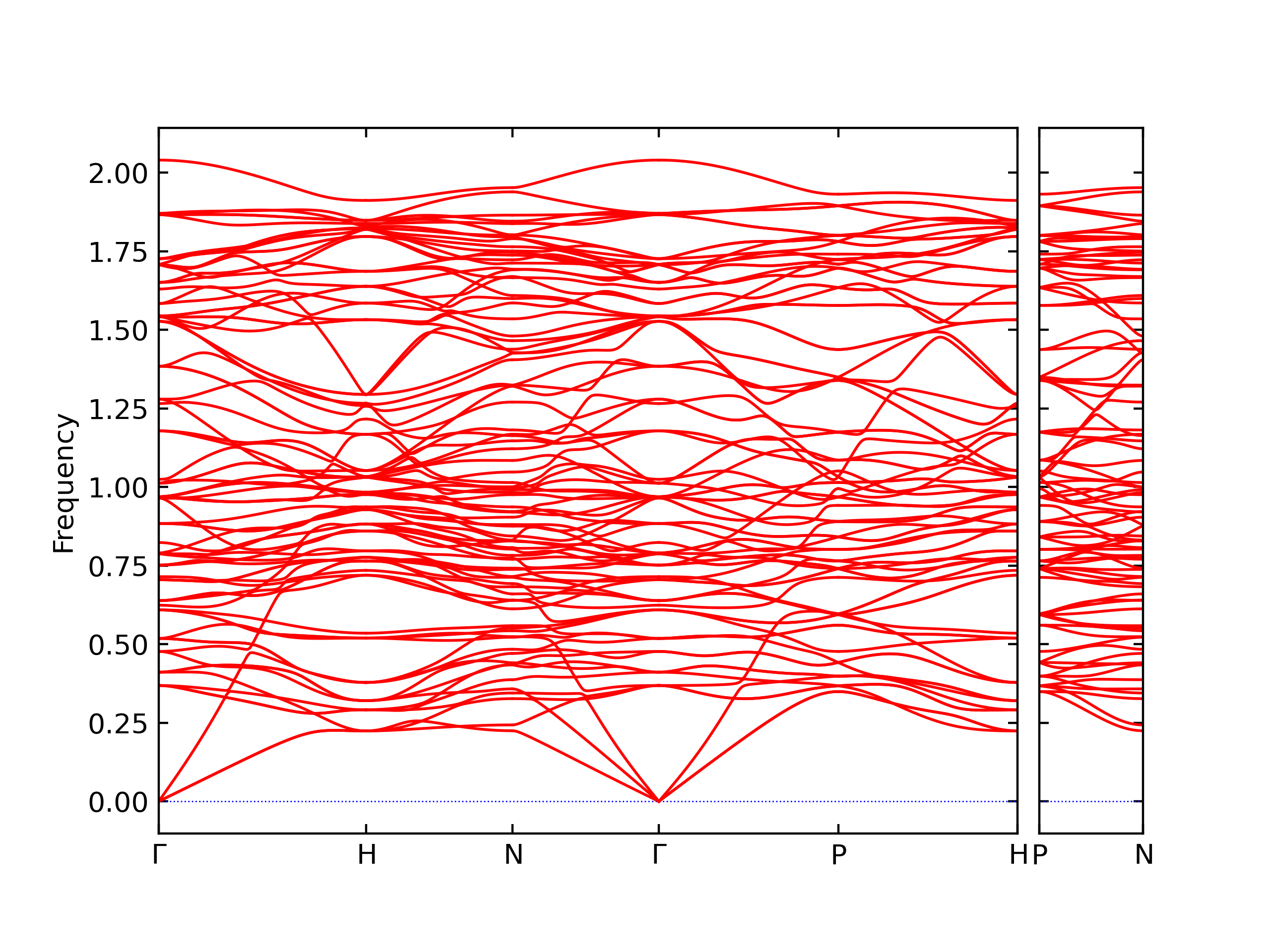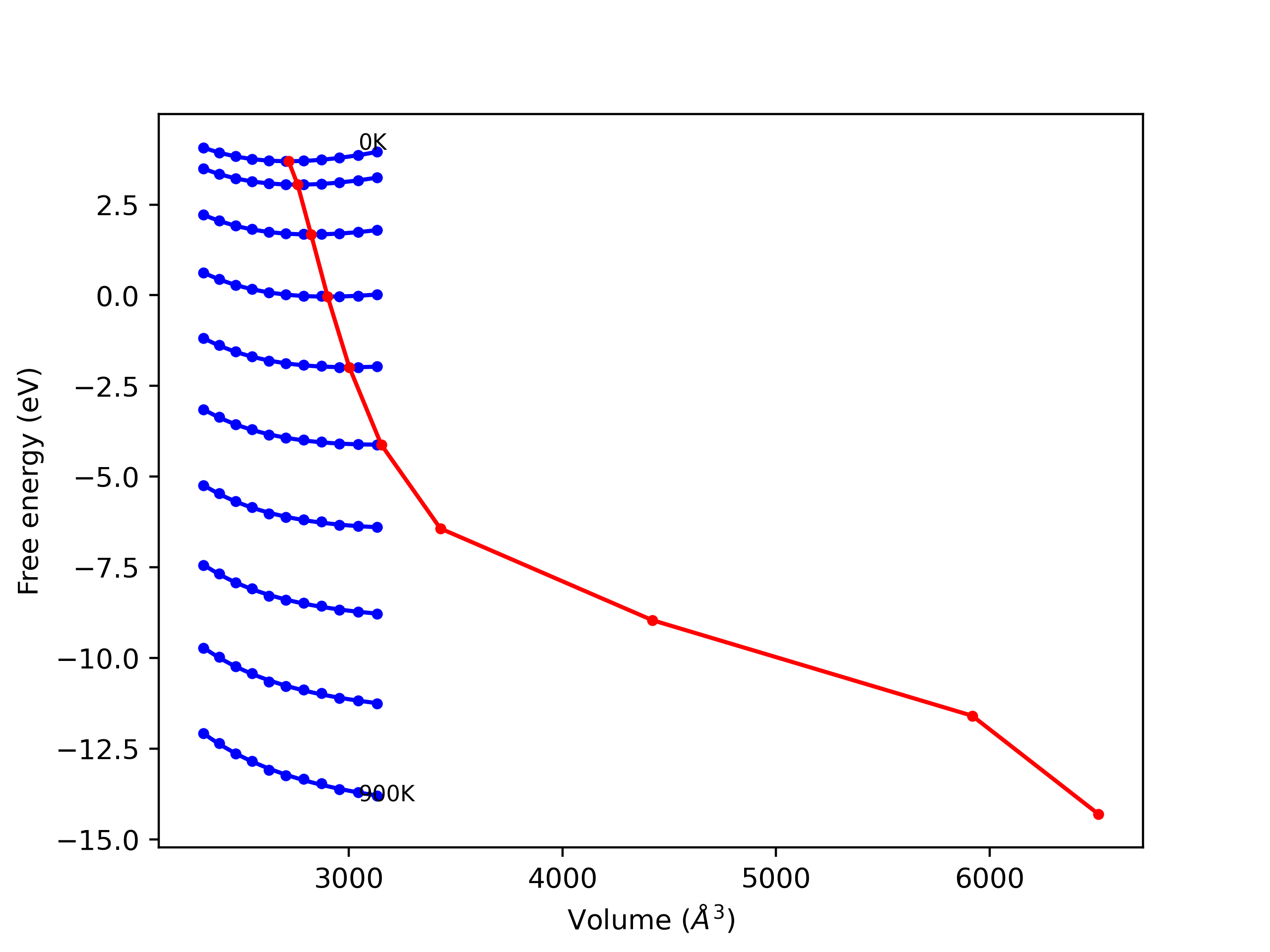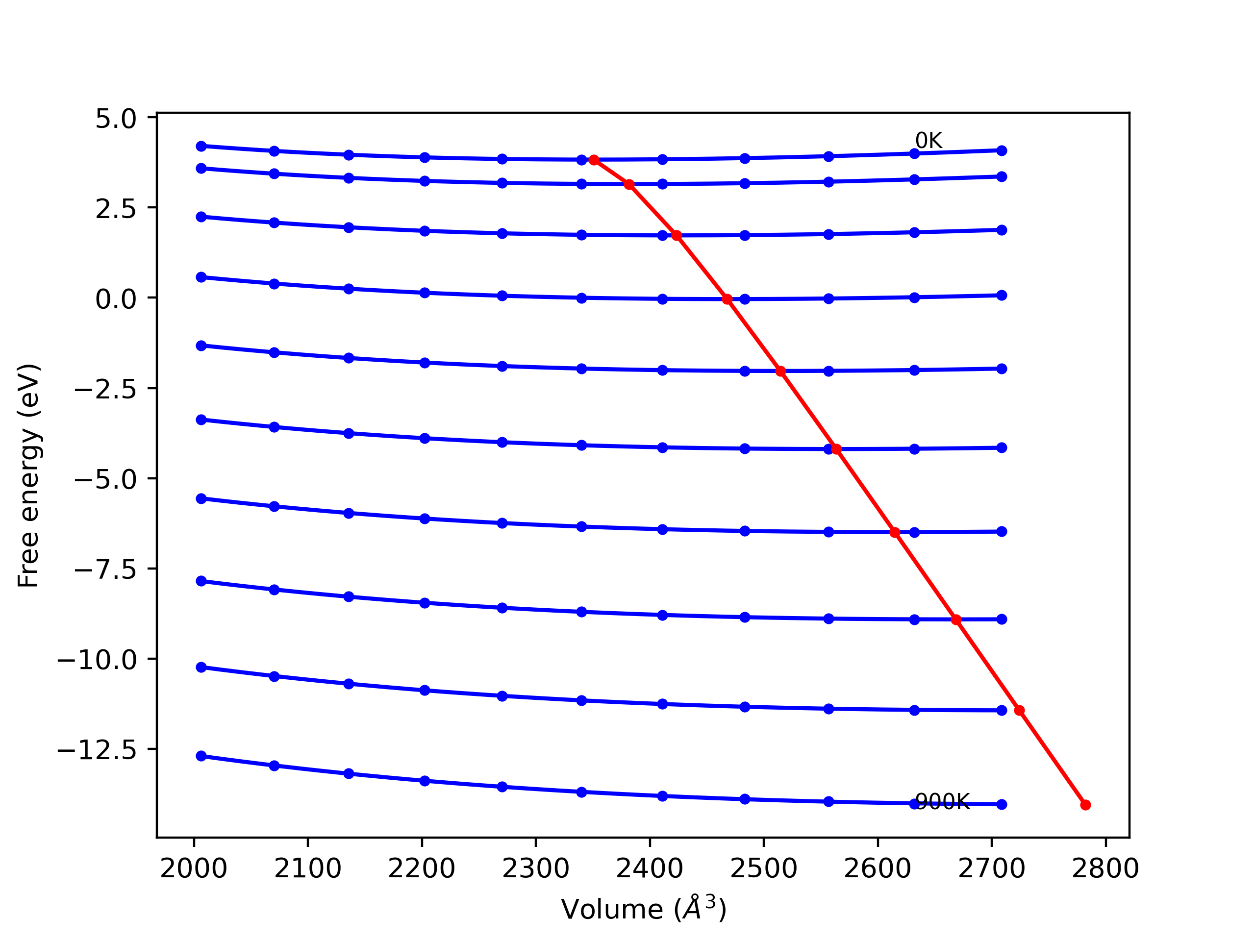 Phonon band structures and crystal properties estimated from quasi-harmonic approximation (QHA) calculations are displayed for select crystals. The calculations were performed using phonopy and LAMMPS. For the phonon calculations, 3x3 supercells of the potential-specific relaxed crystals were used. The QHA calculations were based on 11 strain states ranging from -0.05 to 0.05.
