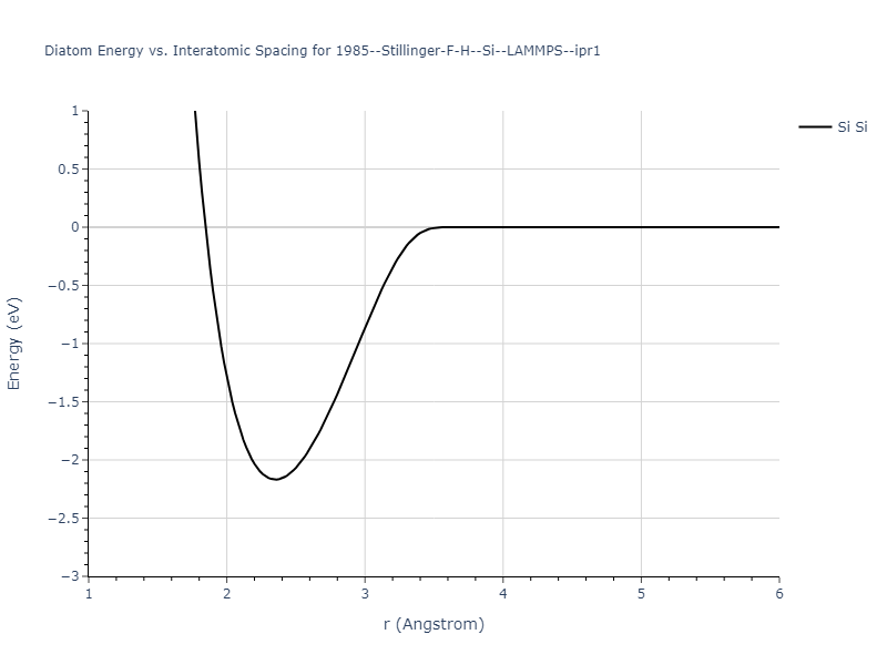 Plots of the potential energy vs interatomic spacing, r, are shown below for all diatom sets associated with the interatomic potential. This calculation provides insights into the functional form of the potential's two-body interactions. A system consisting of only two atoms is created, and the potential energy is evaluated for the atoms separated by 0.02 Å <= r <= 6.0> Å in intervals of 0.02 Å. Two plots are shown: one for the "standard" interaction distance range, and one for small values of r. The small r plot is useful for determining whether the potential is suitable for radiation studies.