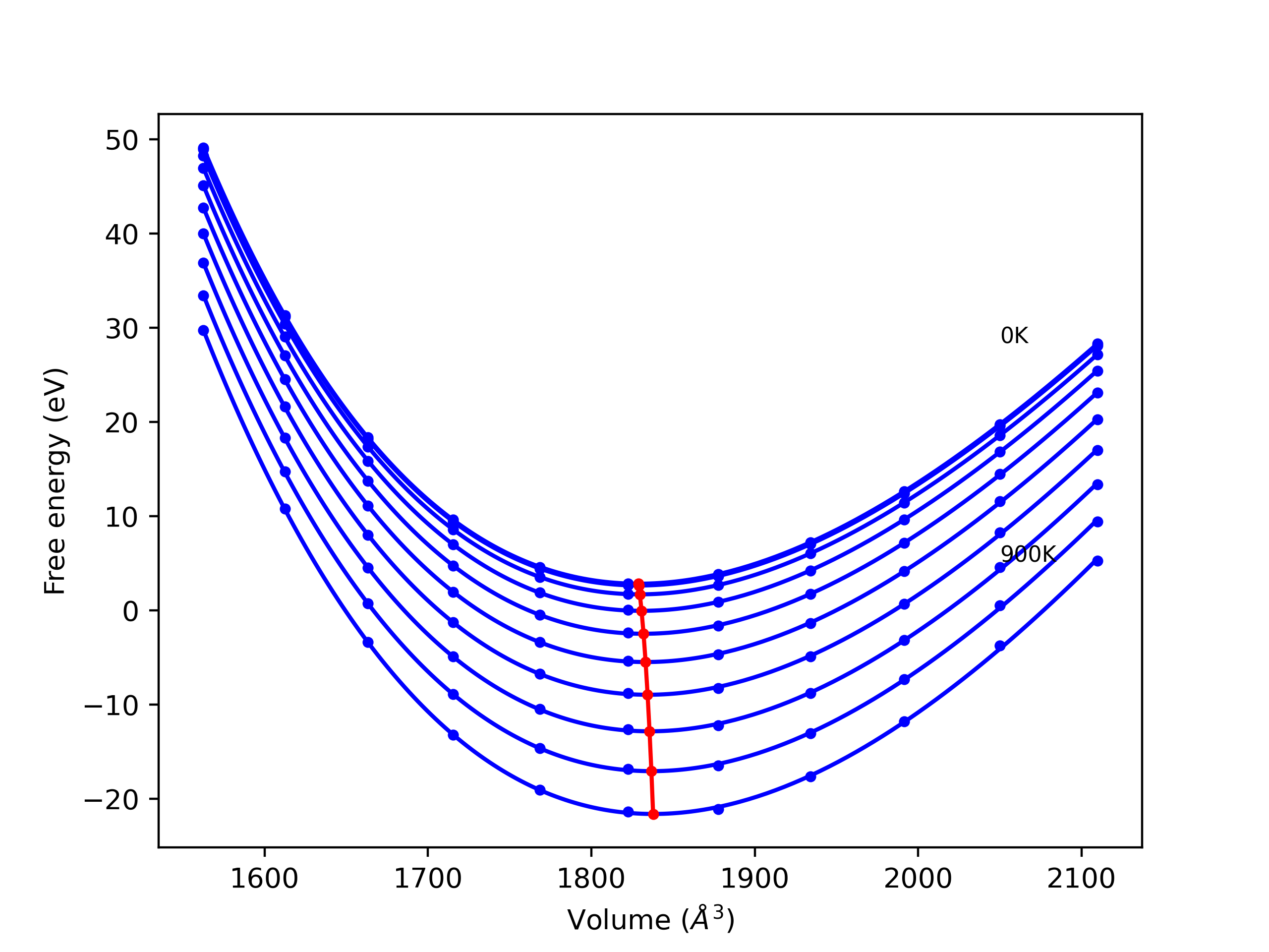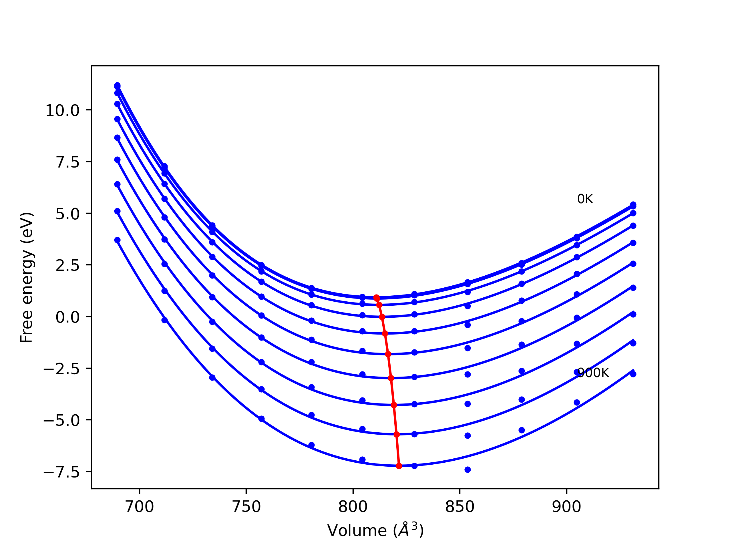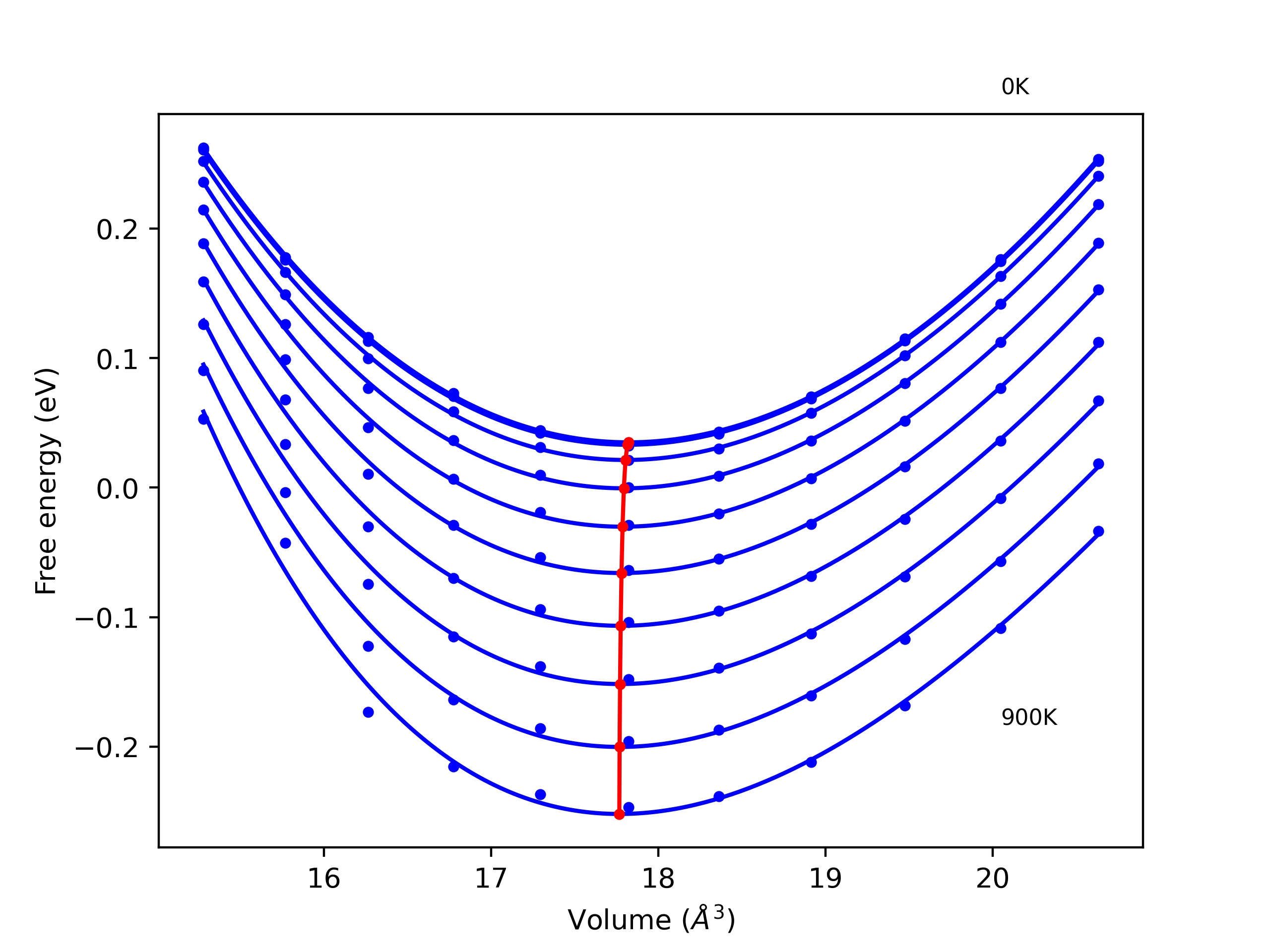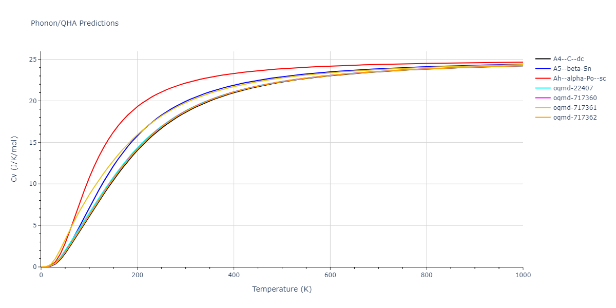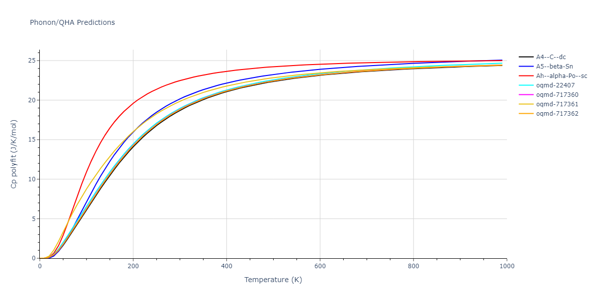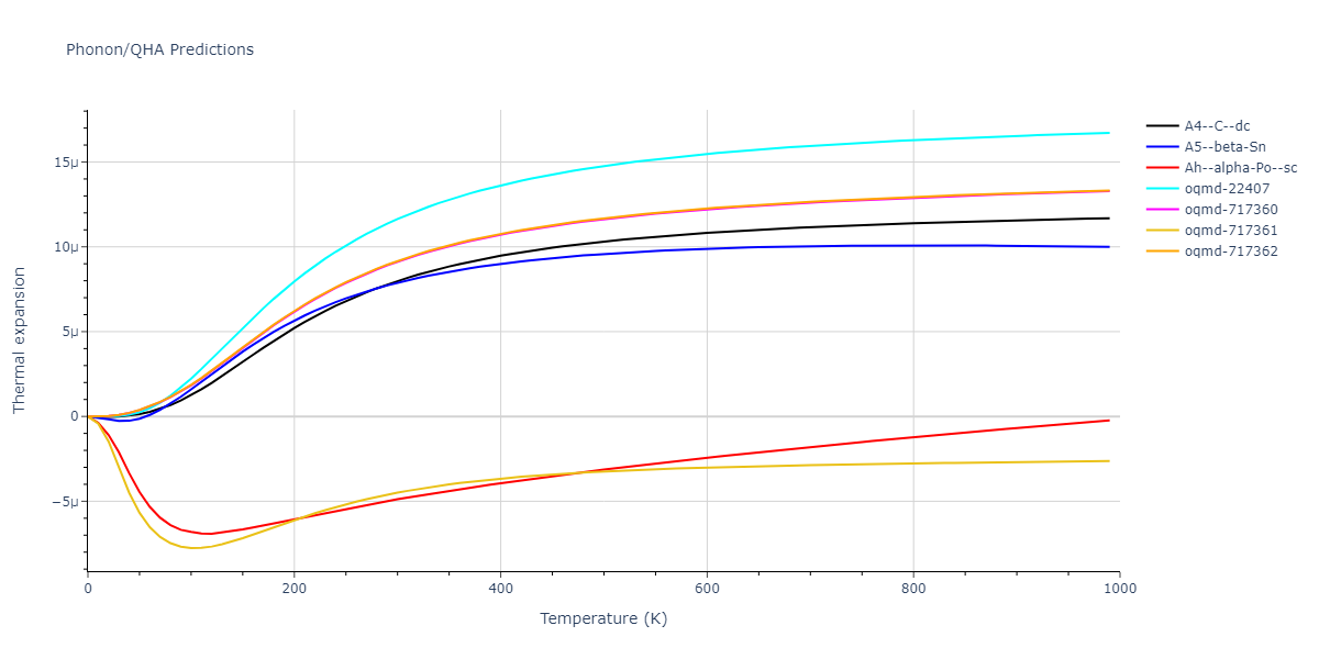 Phonon band structures and crystal properties estimated from quasi-harmonic approximation (QHA) calculations are displayed for select crystals. The calculations were performed using phonopy and LAMMPS. For the phonon calculations, 3x3 supercells of the potential-specific relaxed crystals were used. The QHA calculations were based on 11 strain states ranging from -0.05 to 0.05.