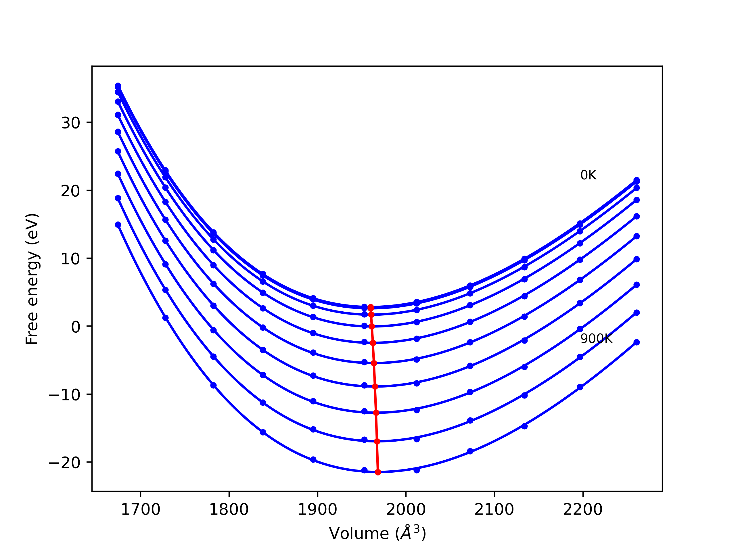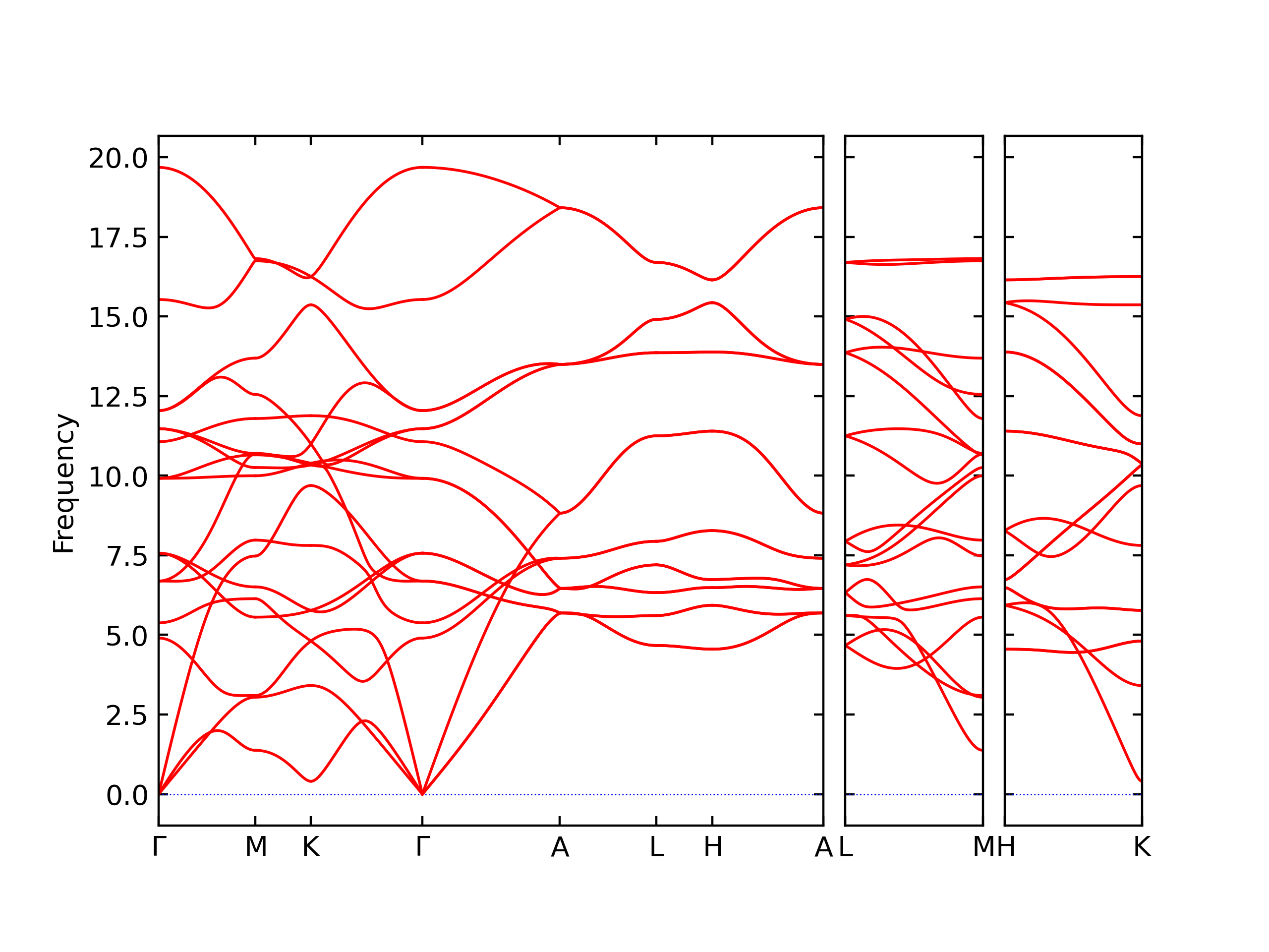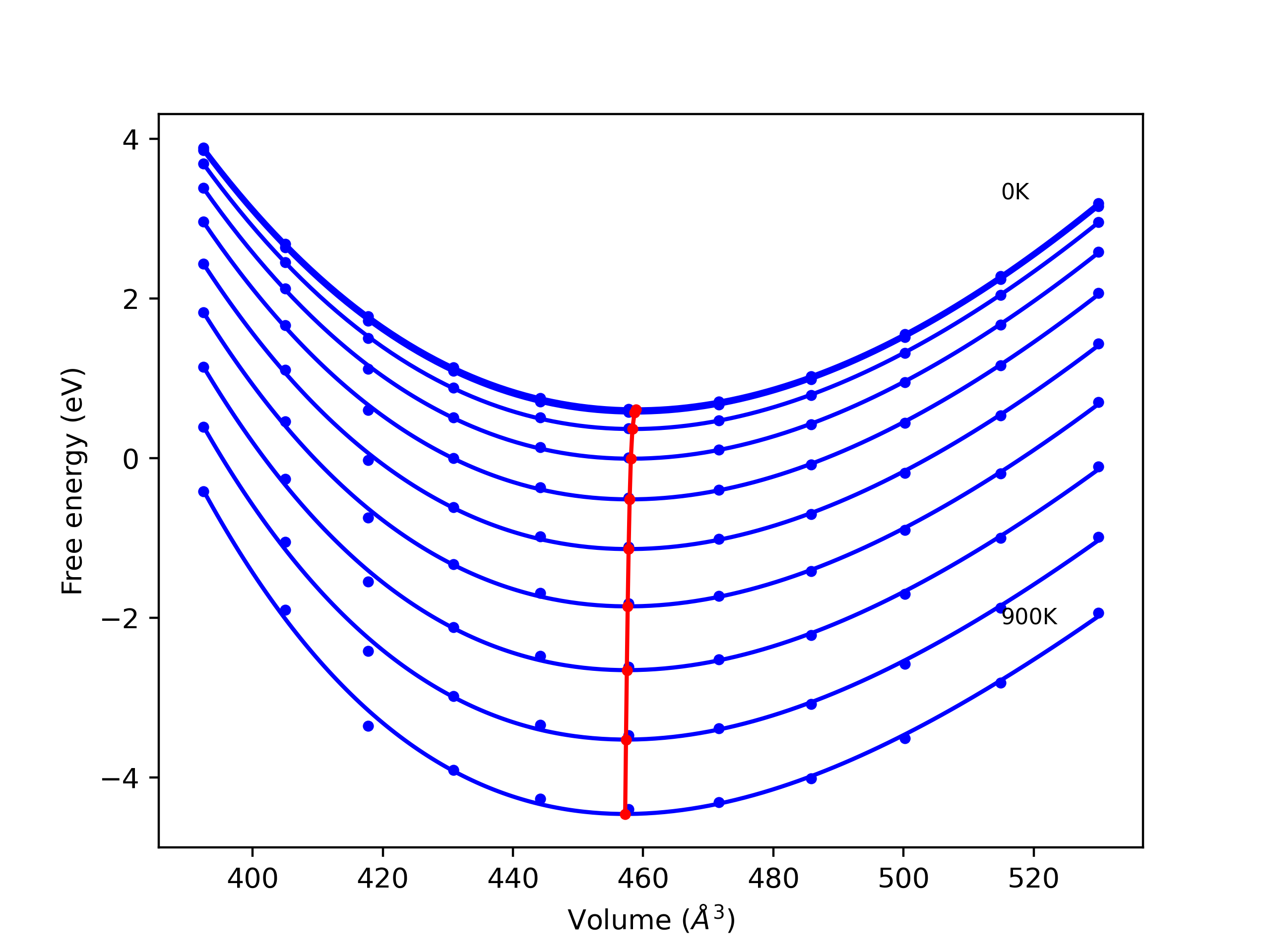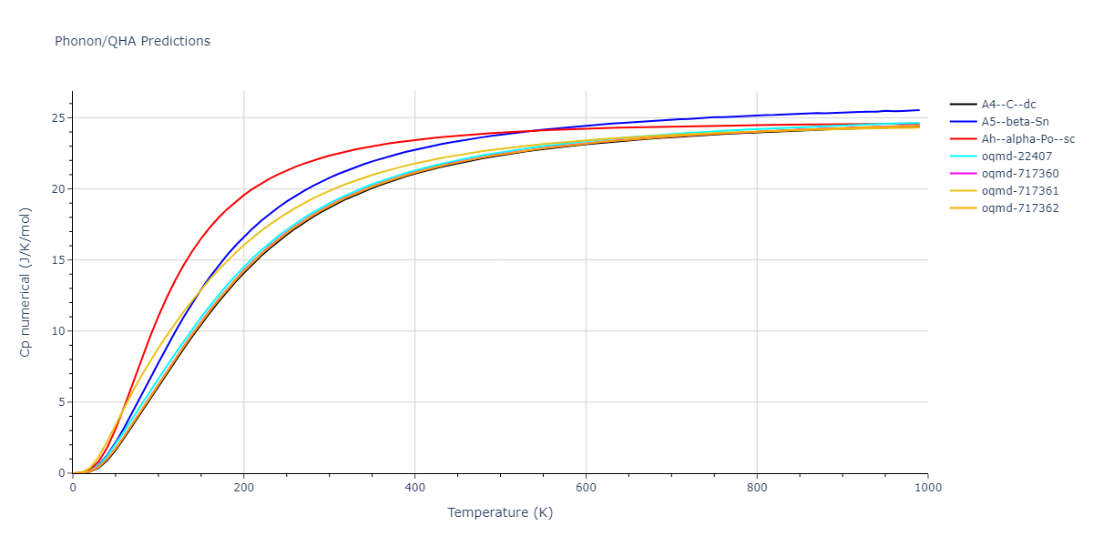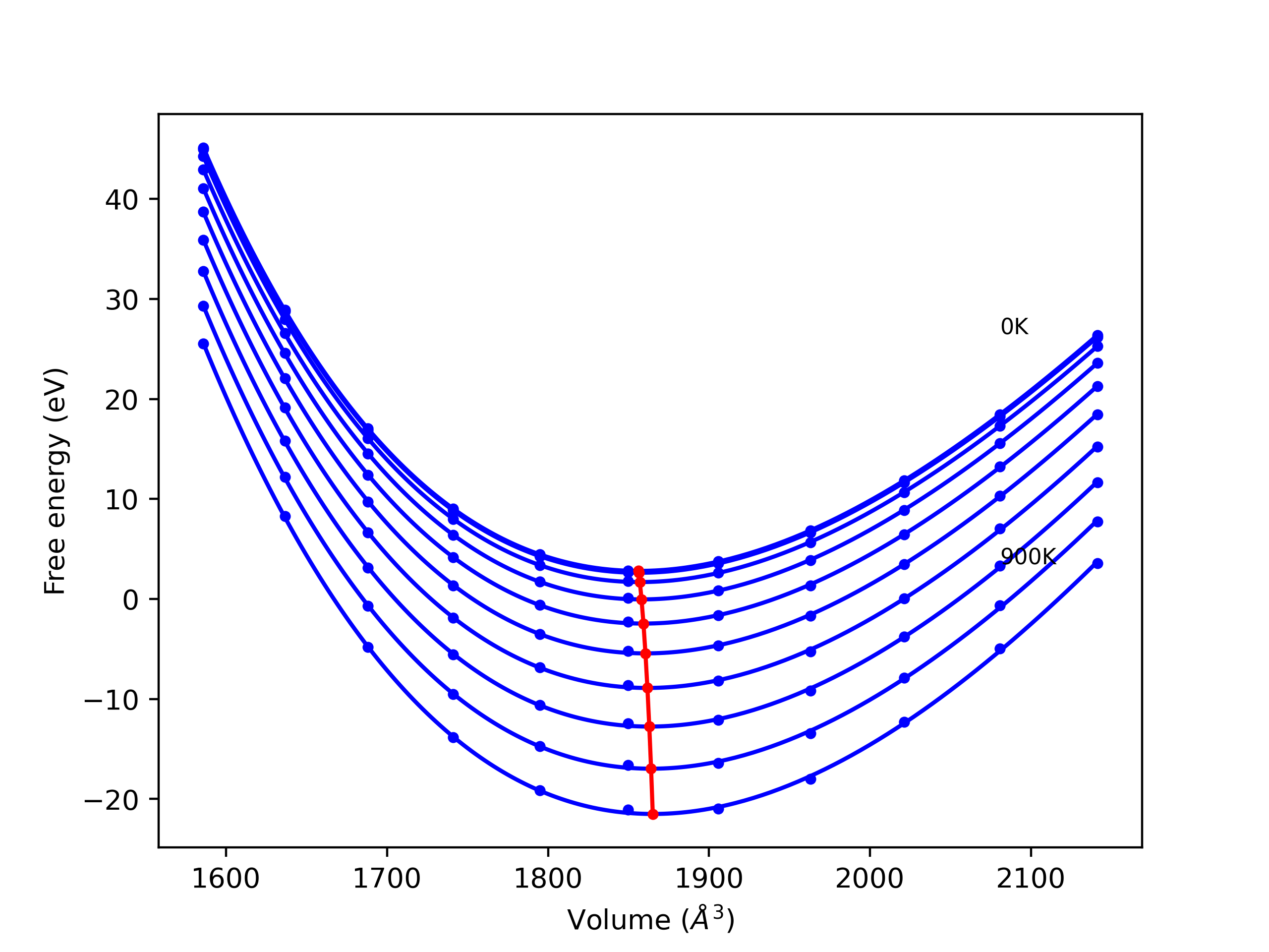 Phonon band structures and crystal properties estimated from quasi-harmonic approximation (QHA) calculations are displayed for select crystals. The calculations were performed using phonopy and LAMMPS. For the phonon calculations, 3x3 supercells of the potential-specific relaxed crystals were used. The QHA calculations were based on 11 strain states ranging from -0.05 to 0.05.