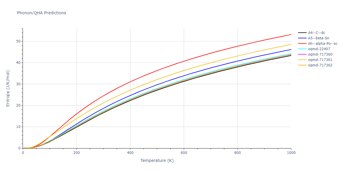 The Gibbs energies of the phases are estimated using thermodynamic integration between the interatomic potential in question and a simpler model with known Gibbs free energy values. For solids, the reference model is an Einstein solid, while for liquids it is the Uhlenbeck-Ford potential. Besides a short run at the start of the solid calculations to estimate Einstein model spring constants, the two calculations proceed similarly. Starting with the final relaxation configurations, the systems are stabilized for 25,000 steps. Then, over the next 50,000 steps the potential is swapped out for the reference potential. The system is then stabilized for another 25,000 steps with the reference model before a reverse swap of 50,000 steps is performed. The simulation ends with one final 25,000 step stabilization period. From the simulation, the irreversible work of transformation is estimated and used to compute the absolute Gibbs free energy of the target phase and potential relative to the reference potential. Entropy is estimated as the difference in enthalpy and Gibbs free energy and divided by temperature.